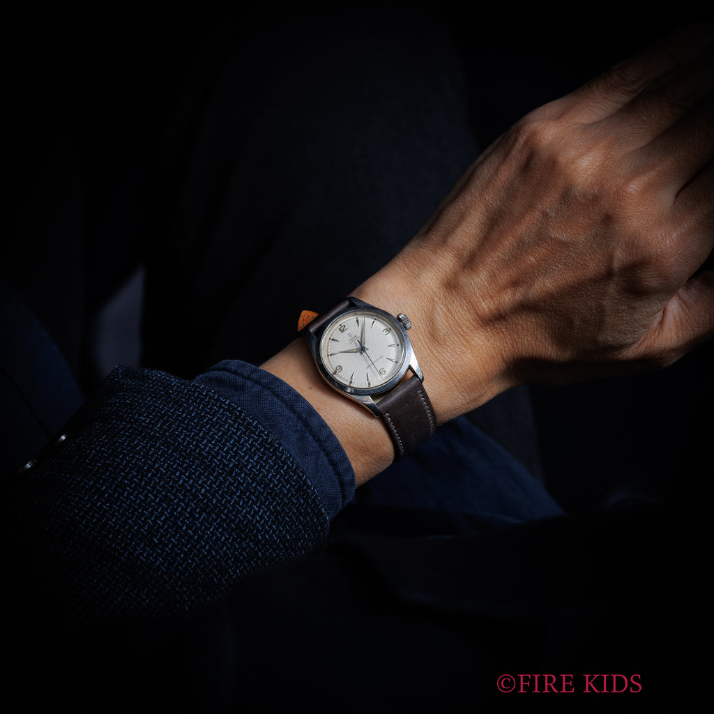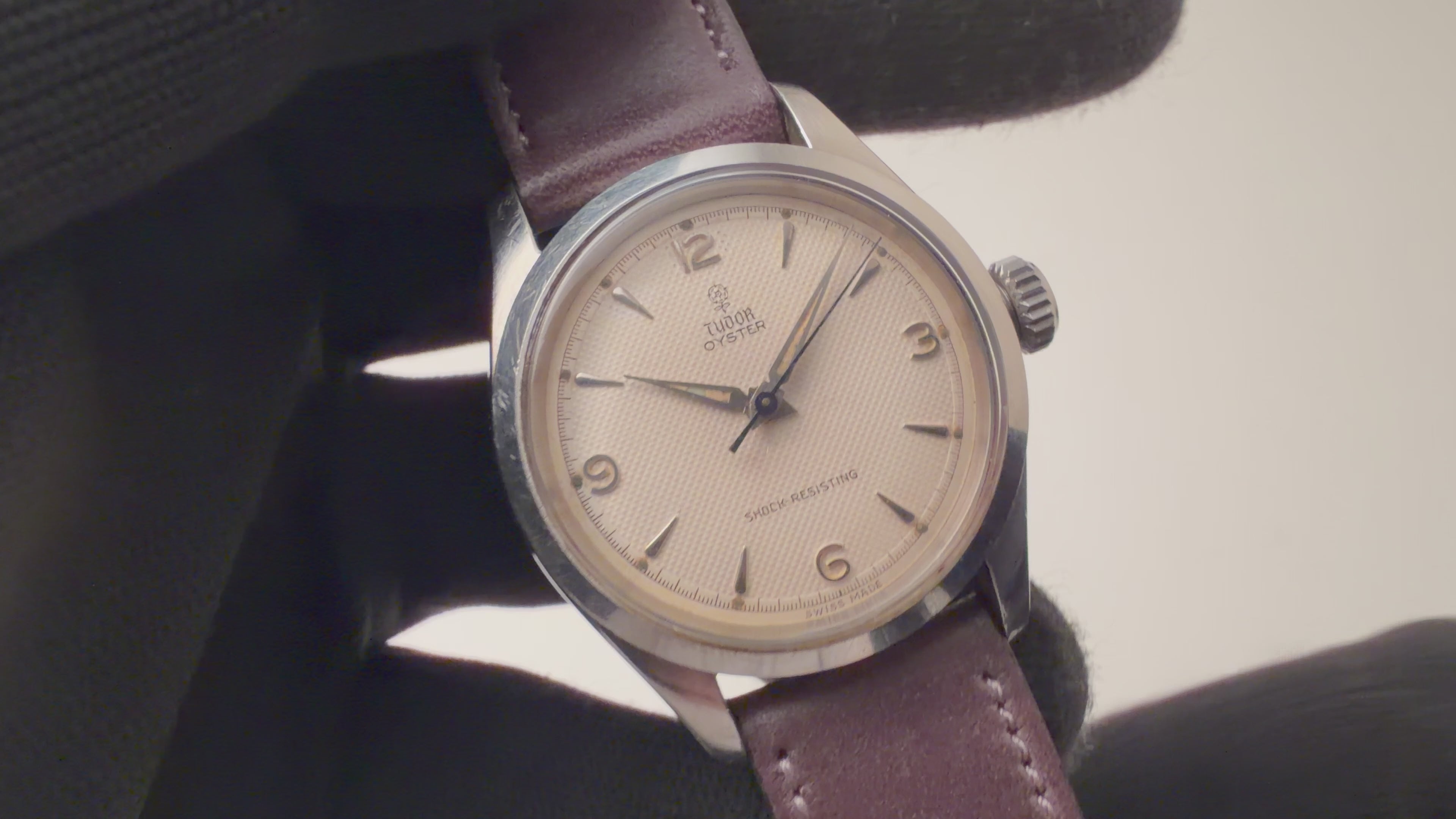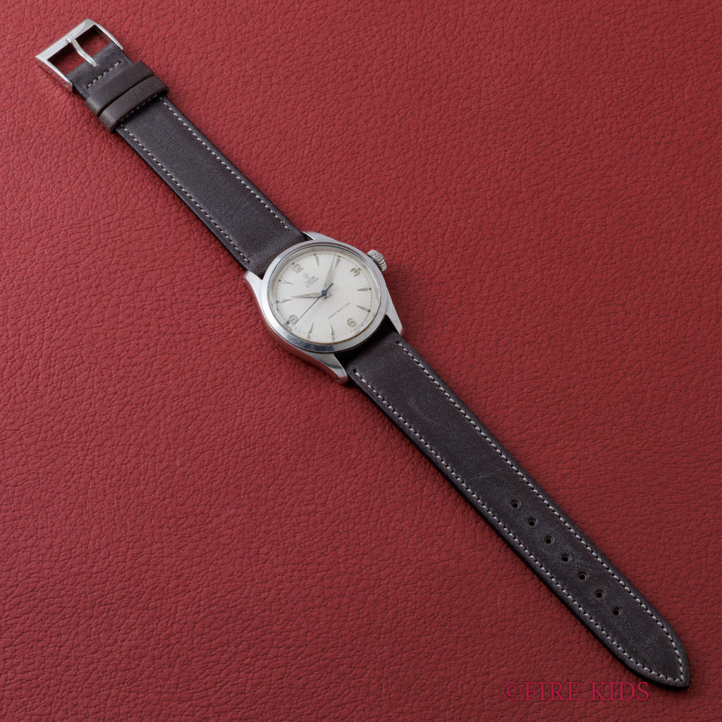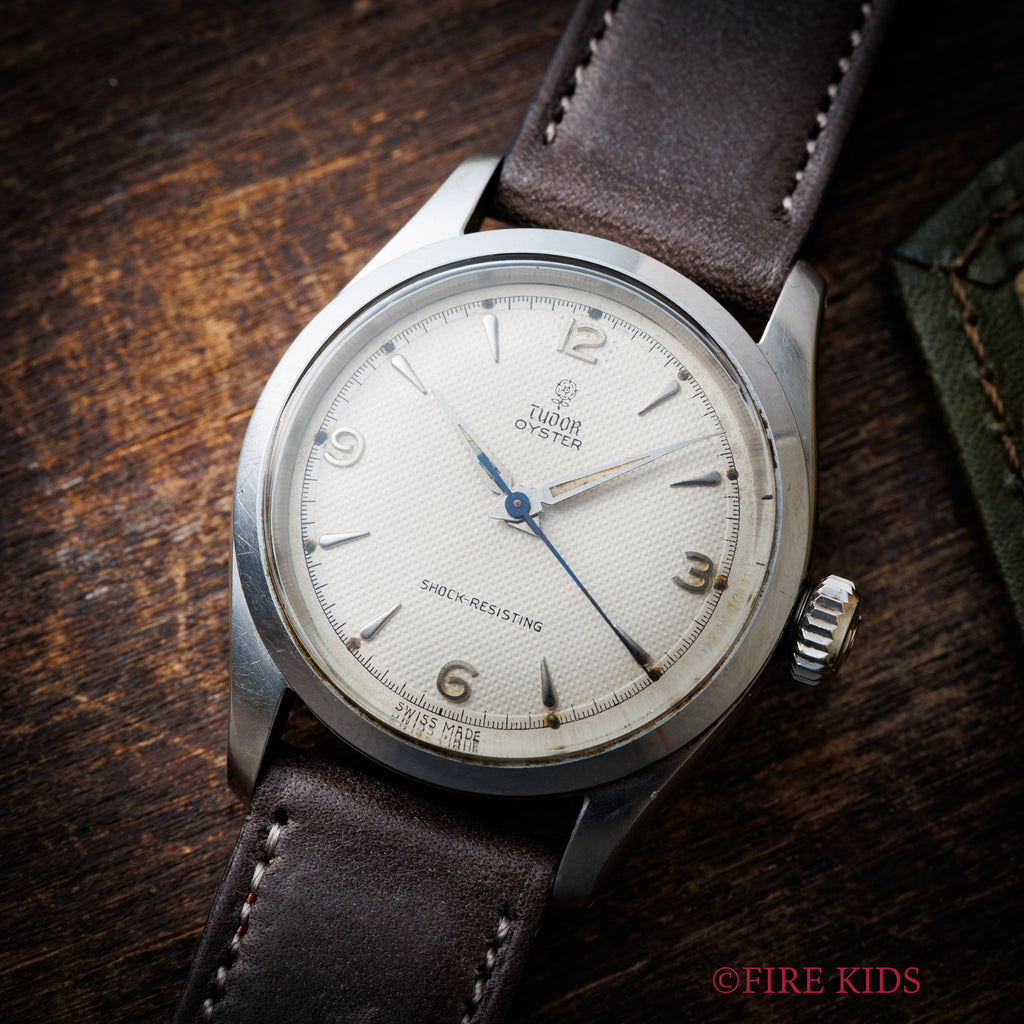 チューダー 小薔薇オイスター 1951年製 ギョウシェダイヤル 手巻 Ref.7903 王冠リューズの入荷になります。ロレックス製のオイスターケースに小薔薇のロゴが魅力的な1本です。文字盤はギョウシェ彫が施された飛びアラビアダイヤルで、傘型にゆったりとした丸みを帯びています。針もロレックスとは違うタイプのドーフィンハンド、ブルースチール秒針とヴィンテージらしい良い雰囲気になっています。文字盤表面に若干の劣化が見られますが目立つシミ等無く綺麗です。針の夜光は入れ直しされています。ケースは小傷が見られますが大きなダメージはありません。ベルトは社外の革ベルトが取り付けられています。