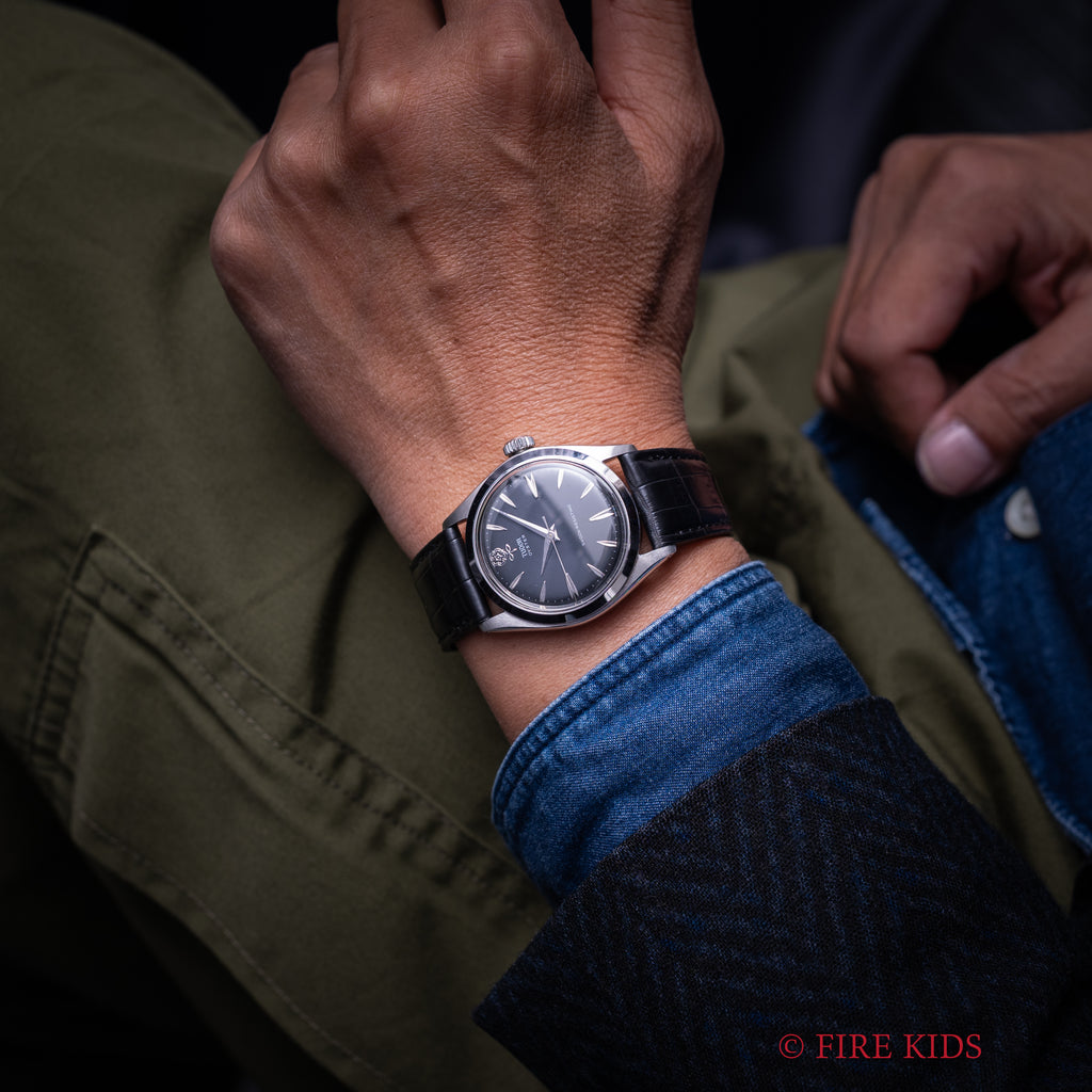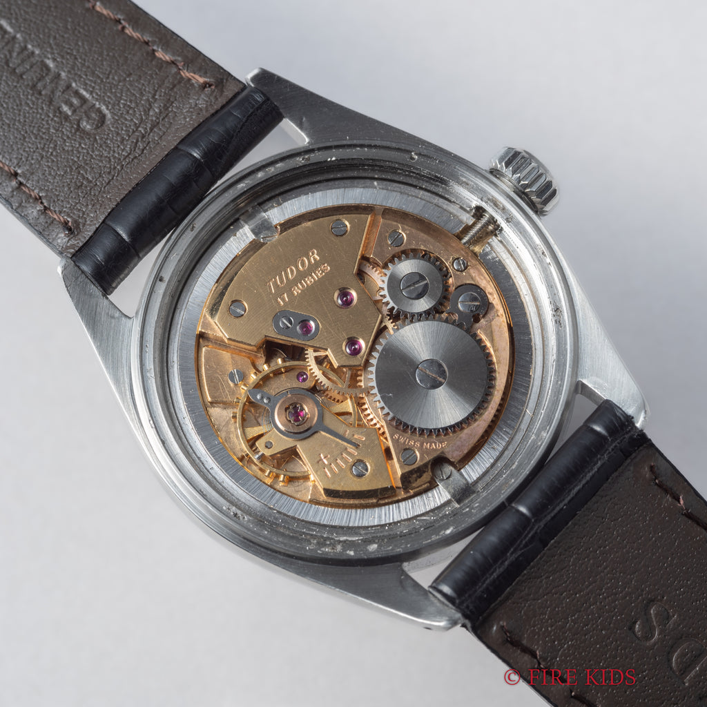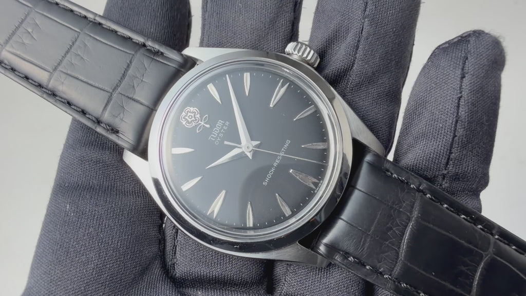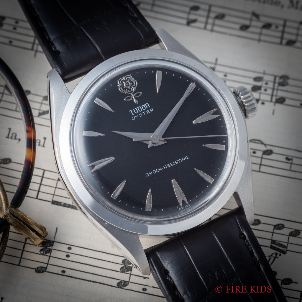 1960年代製のTUDORオイスター手巻きモデルです。12時位置に大きな薔薇が描かれている通称「デカ薔薇」と呼ばれる人気モデルです。マットブラックの文字盤はリダンされておりますが、チューダーならではの形状のクサビ型インデックスが良い雰囲気を出しています。ケースは小傷等あり多少使用感がございますが大きなダメージはなく年代を考慮すると悪くない状態です。手巻きや針回し、リューズのねじ込みの操作はスムースです。ベルトはファイアーキッズオリジナルのクロコダイル革ベルトを合わせています。こちらは分解掃除済みです。