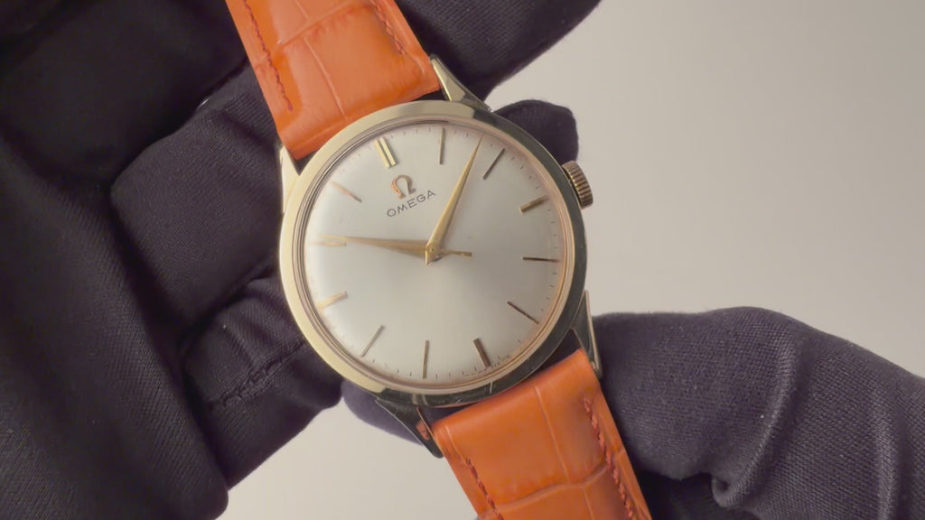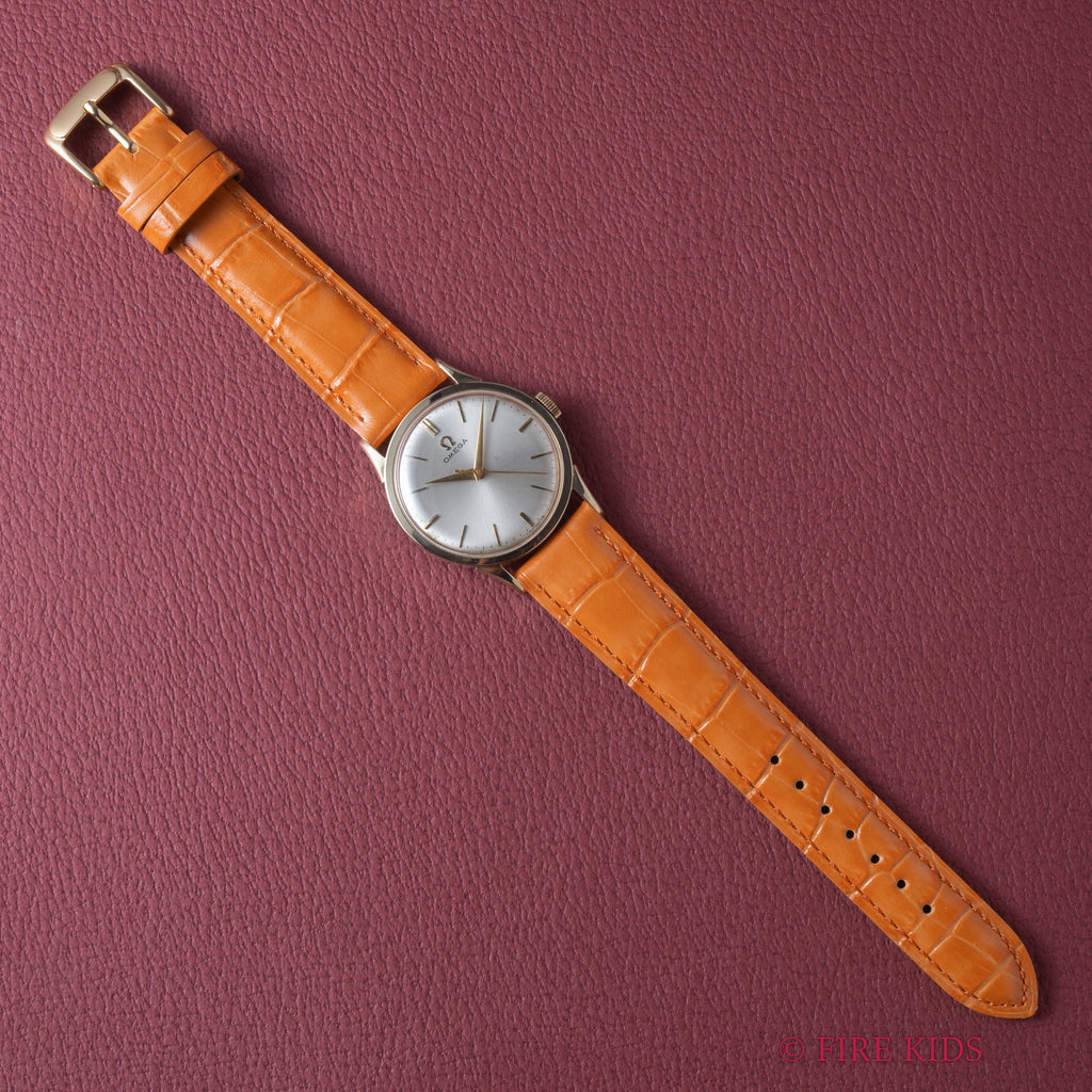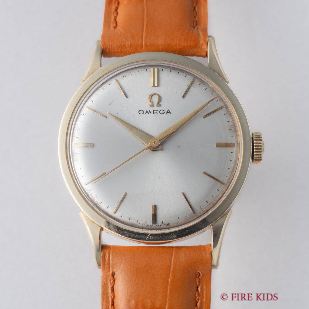 1956年製 オメガ 14KYGケース 手巻きモデルです。アイボリーの文字盤はゴールドとの相性が良く、インデックスとシャープなドーフィンハンドが上品な顔つきです。ダイヤルにはわずかに経年変化がありますが、全体的にコンディションは良く、雰囲気を損なう様なものではありません。アメリカで製造された14KYGケースは大きなダメージはなく、ラウンドケースに少し段差のあるラグが高級感があります。ムーブメントはCal.420を搭載、巻き上げと針回し共にスムーズです。ベルトは社外革ベルトが付いています。