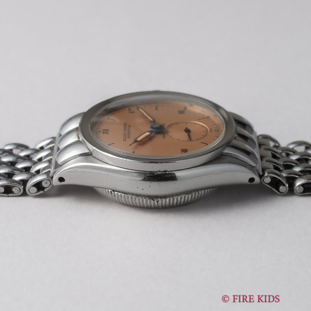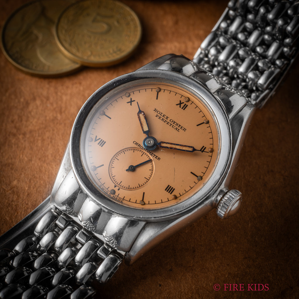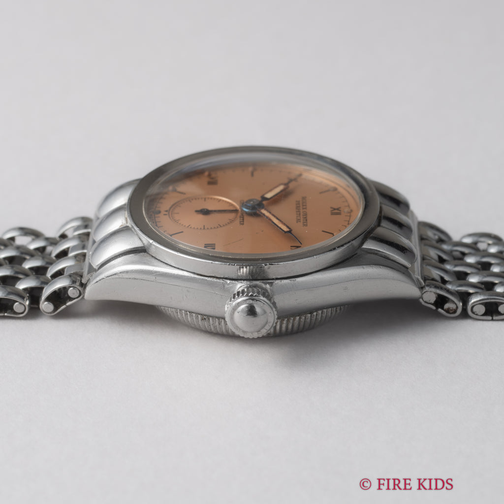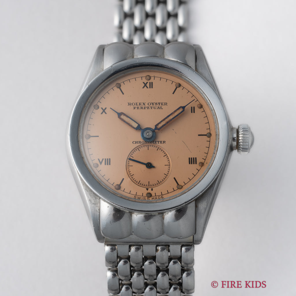ロレックス バブルバック シェルフーデッド 飛びローマンダイアル 1942年製 社外ブレスの入荷になります。バブルバックでも非常に希少なシェルフーデットで、中でもステンレスは金よりも溶接の加工難易度が高く、より希少性がある特別な1本です。文字盤は王冠マークなしのピンクカラーのダイアルでシンプルながらも雰囲気が際立っています。針の夜光は入れ直しされていますが文字盤の夜光はオリジナルで良い雰囲気になっています。ケースは磨きは入っていますがダイヤルの柔らかい雰囲気と合っています。ブレスはシェル形状との相性が良いライスブレスタイプでゲイフレアー社のものが取り付けられています。