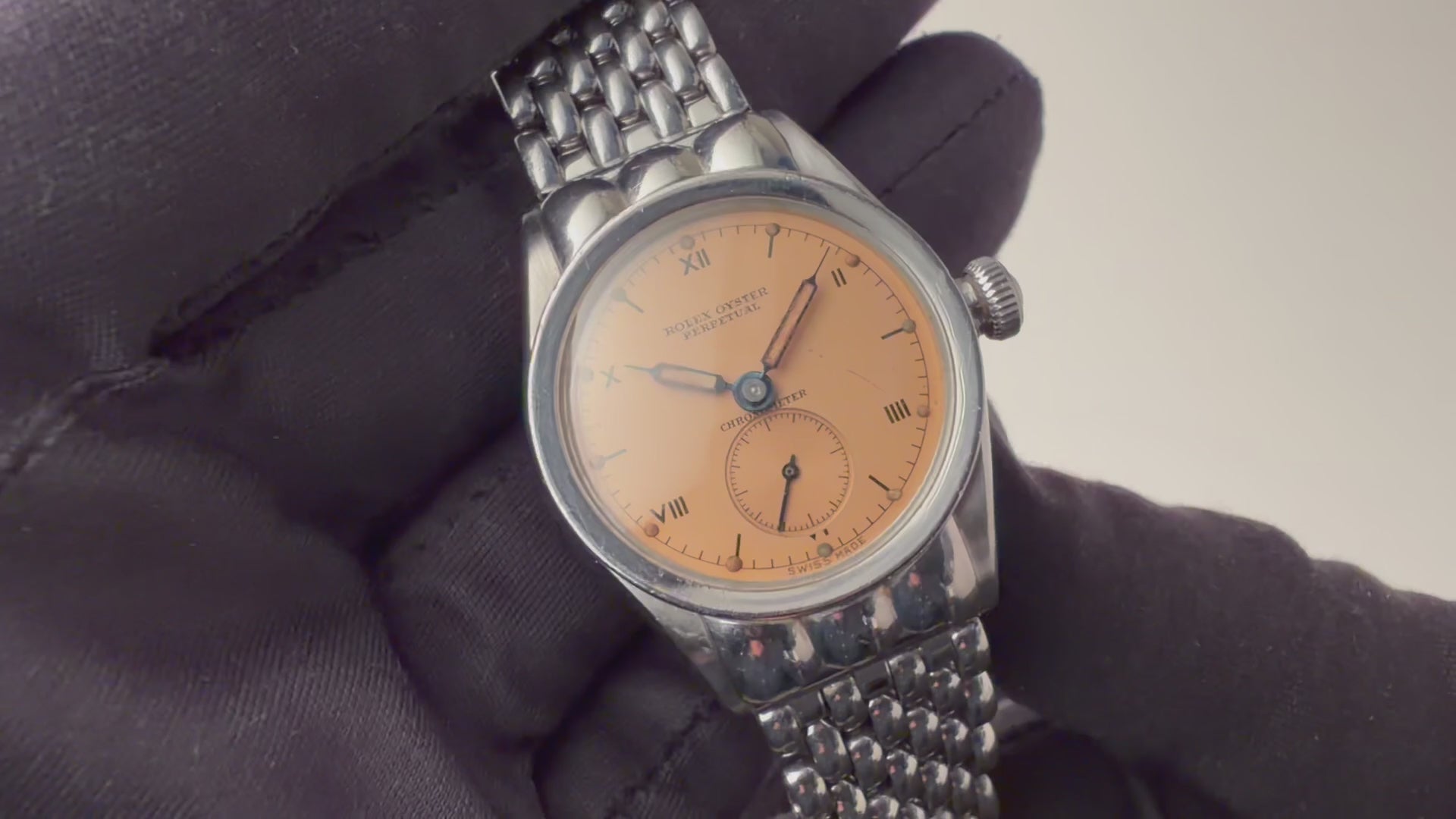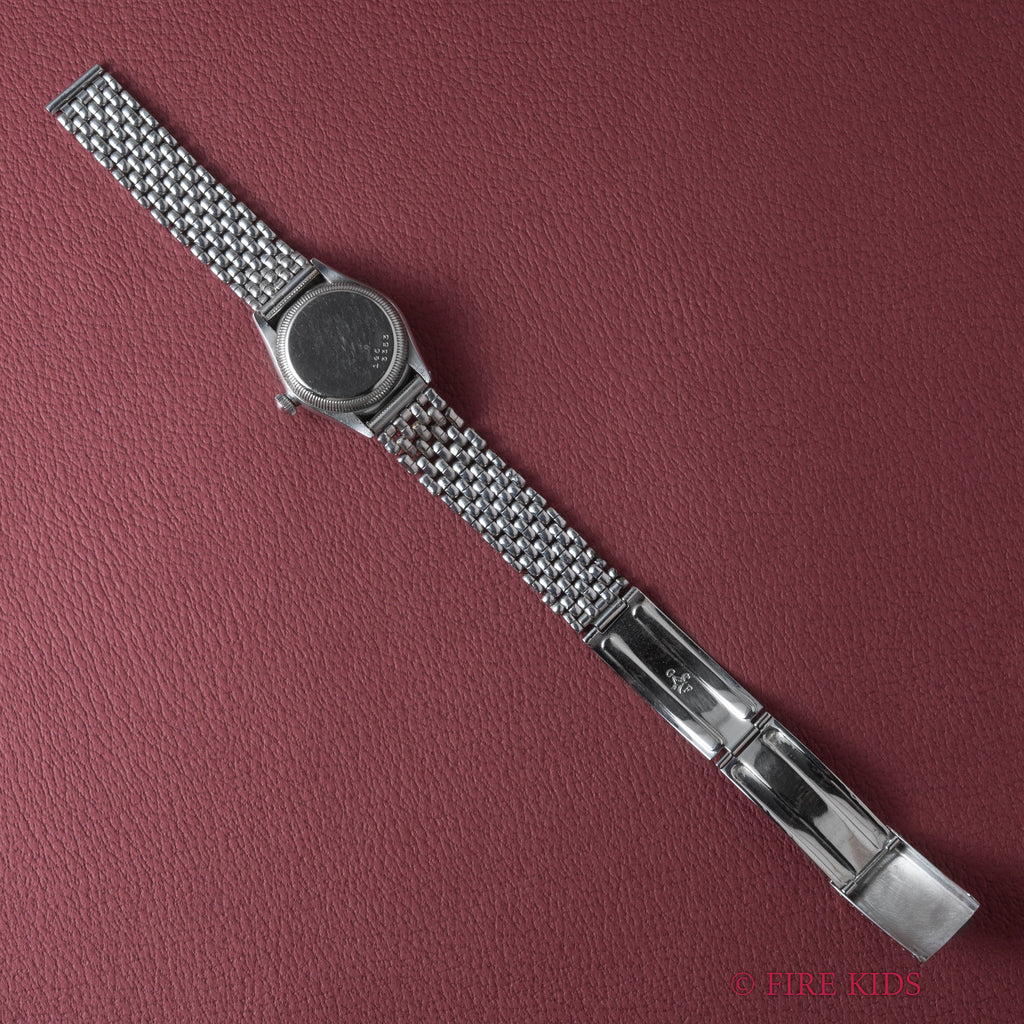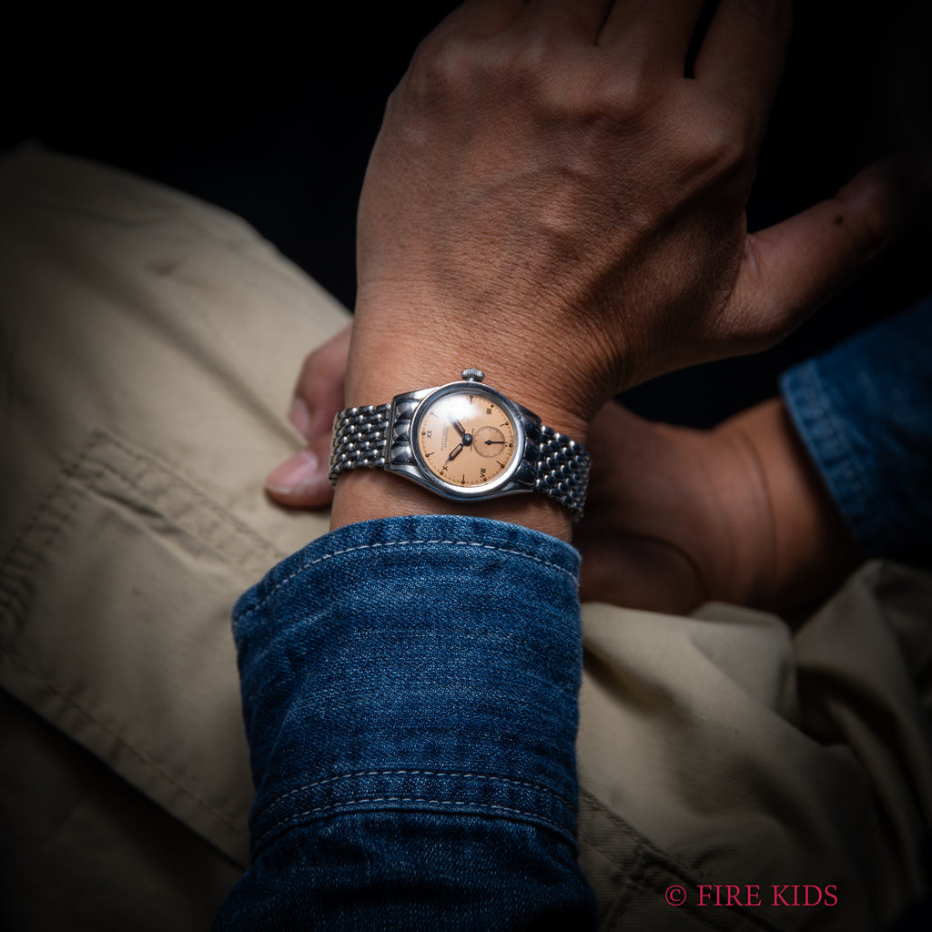ロレックス バブルバック シェルフーデッド 飛びローマンダイアル 1942年製 社外ブレスの入荷になります。バブルバックでも非常に希少なシェルフーデットで、中でもステンレスは金よりも溶接の加工難易度が高く、より希少性がある特別な1本です。文字盤は王冠マークなしのピンクカラーのダイアルでシンプルながらも雰囲気が際立っています。針の夜光は入れ直しされていますが文字盤の夜光はオリジナルで良い雰囲気になっています。ケースは磨きは入っていますがダイヤルの柔らかい雰囲気と合っています。ブレスはシェル形状との相性が良いライスブレスタイプでゲイフレアー社のものが取り付けられています。