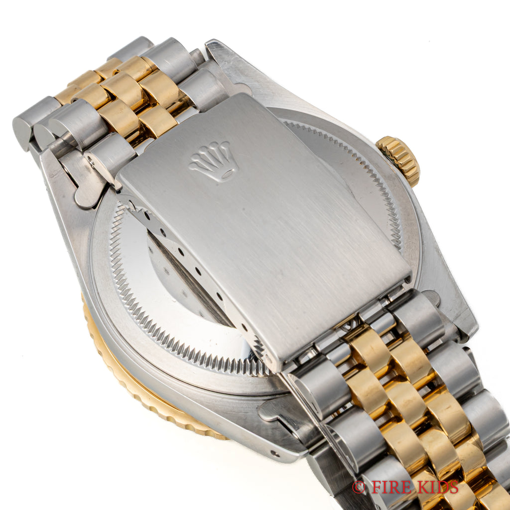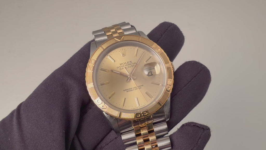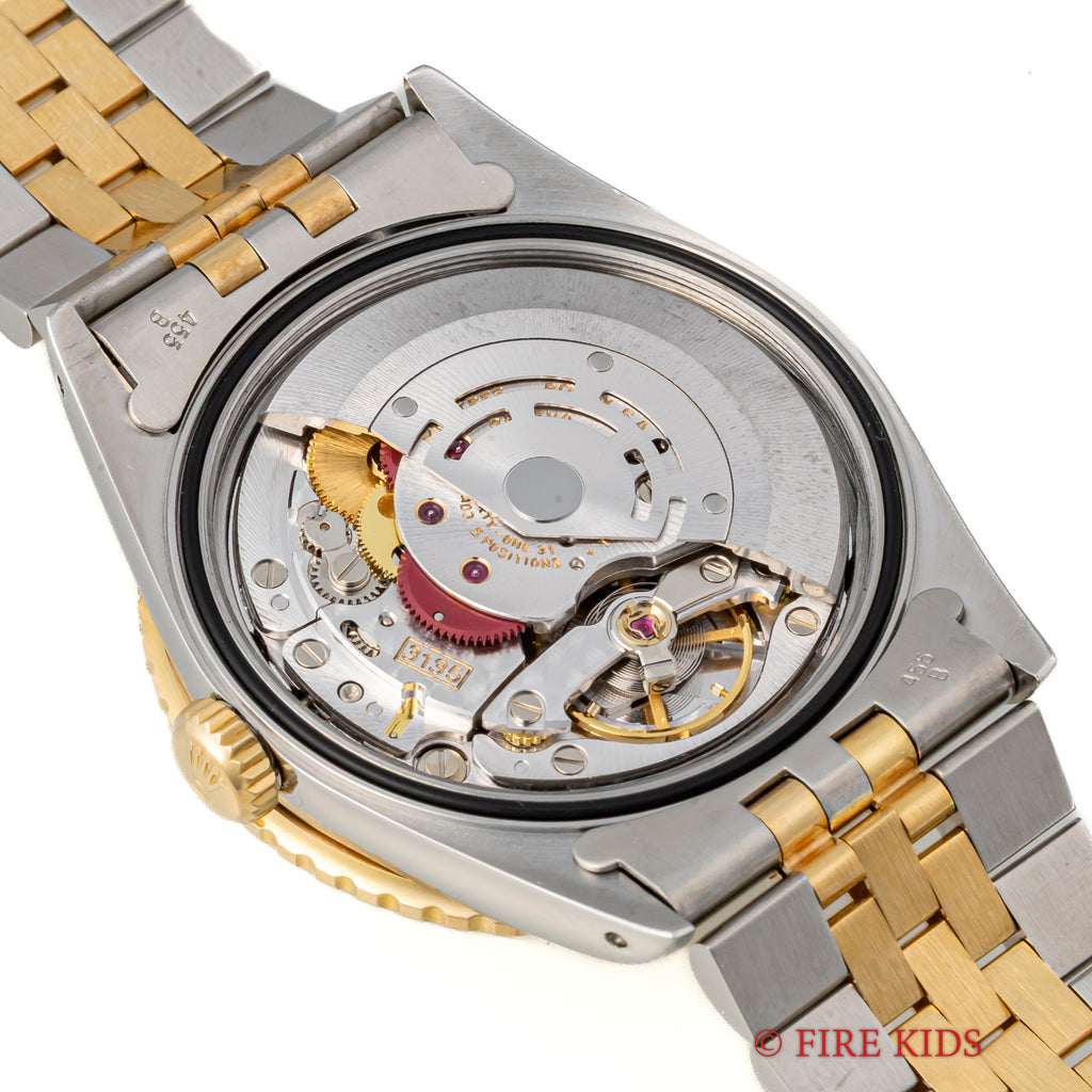 ロレックスのサンダーバード1991年製 Ref.16263です。アメリカ空軍のアクロバットチーム サンダーバーズが隊長の勇退を記念して発注したのが始まりと言われるモデルで、デイトジャストに回転ベゼルを装備しています。シャンパンカラーの文字盤は気になる様な経年変化やキズのない綺麗な状態です。ベゼルの刻みはシャープに残っています。ムーブメントは自動巻きのCal.3135を搭載、手巻きや針回し、リューズのねじ込み操作はスムースです。ベルトは純正ジュビリーブレスが取り付けされています。こちらは分解掃除済みです。