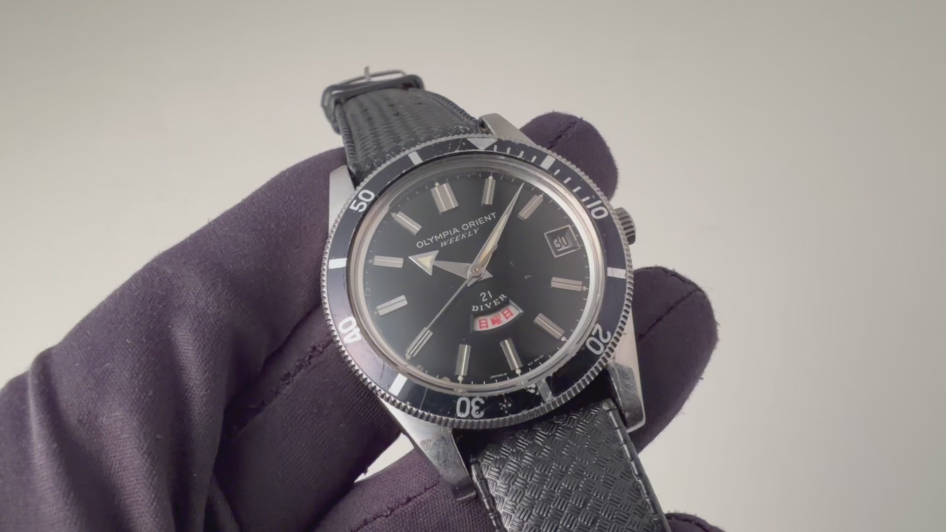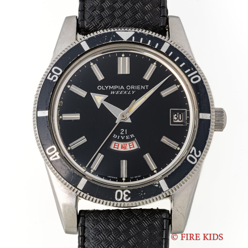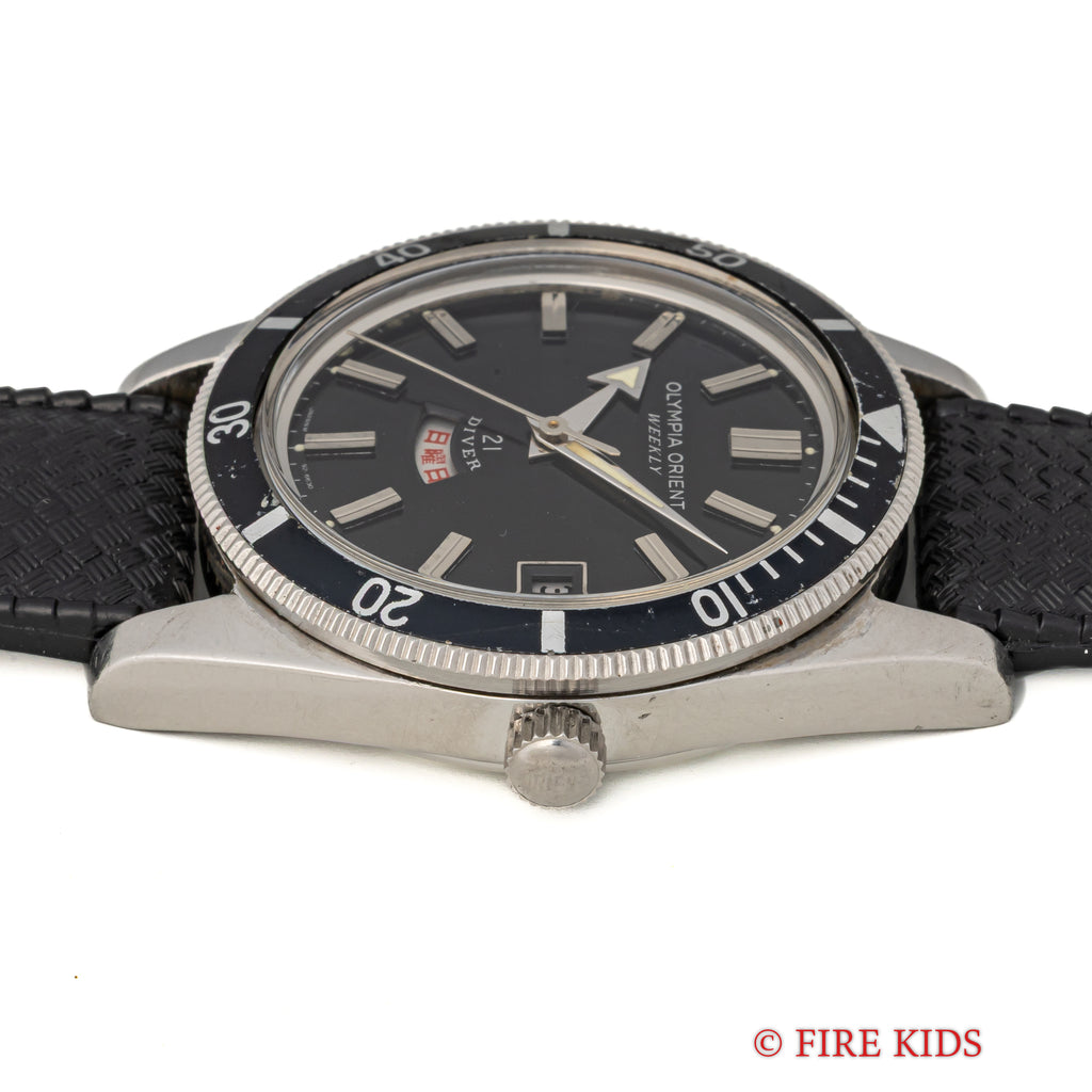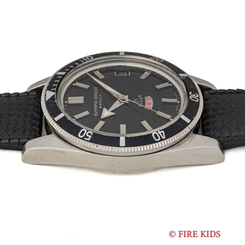 オリンピア オリエント ウィークリー 21ダイバー 1960年代 日本語曜日 アローハンド 手巻の入荷になります。オリンピア オリエント ウィークリーシリーズのダイバーモデルでツヤ有のブラックダイヤルにアロー針や扇状の窓枠のデイトも魅力的です。ムーブメントは手巻き21石の機械を搭載。ケースは小傷はございますが大きなダメージはございません。手巻きや針回しの操作はスムースです。ベルトは古いトロピックタイプのラバーベルトが取り付けられています。こちらの時計は分解掃除済みです。