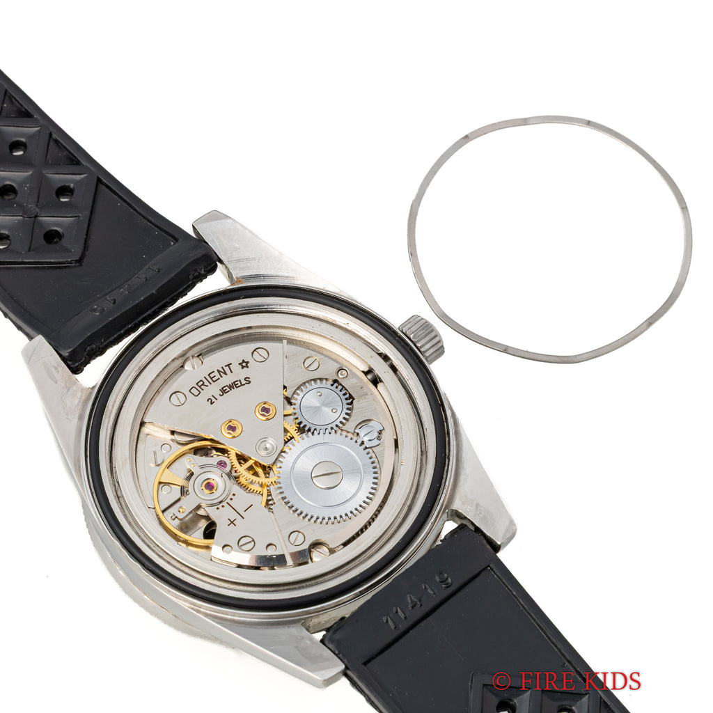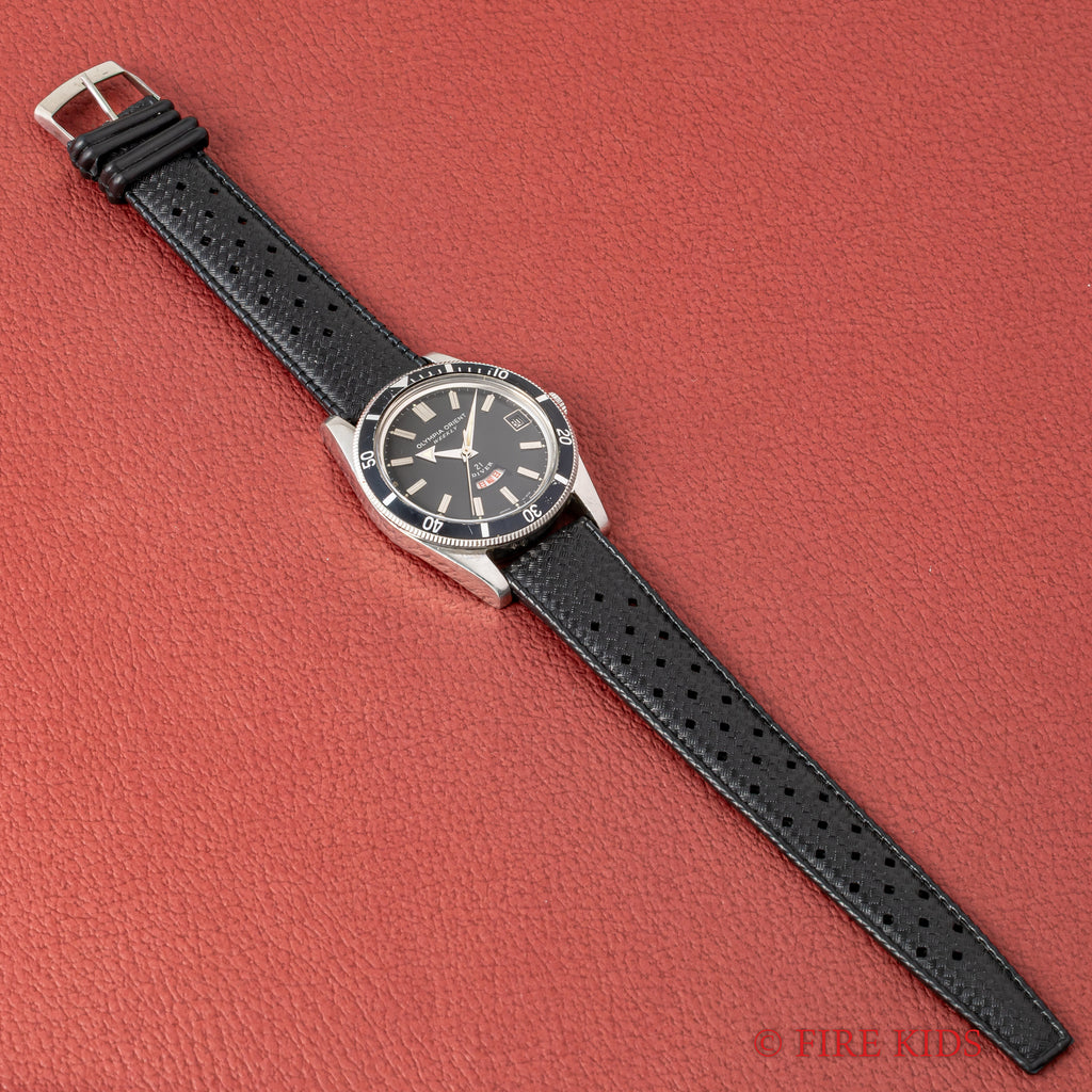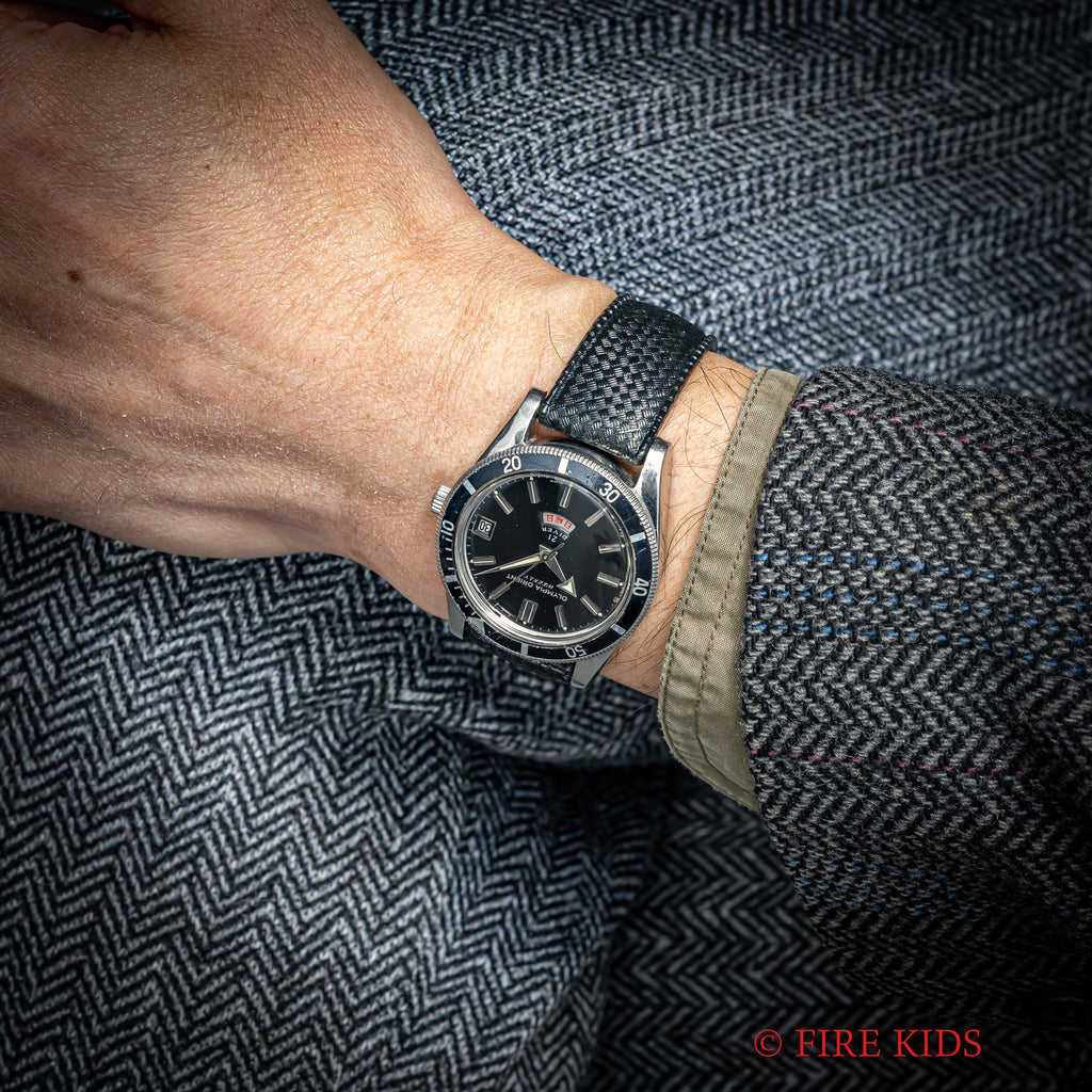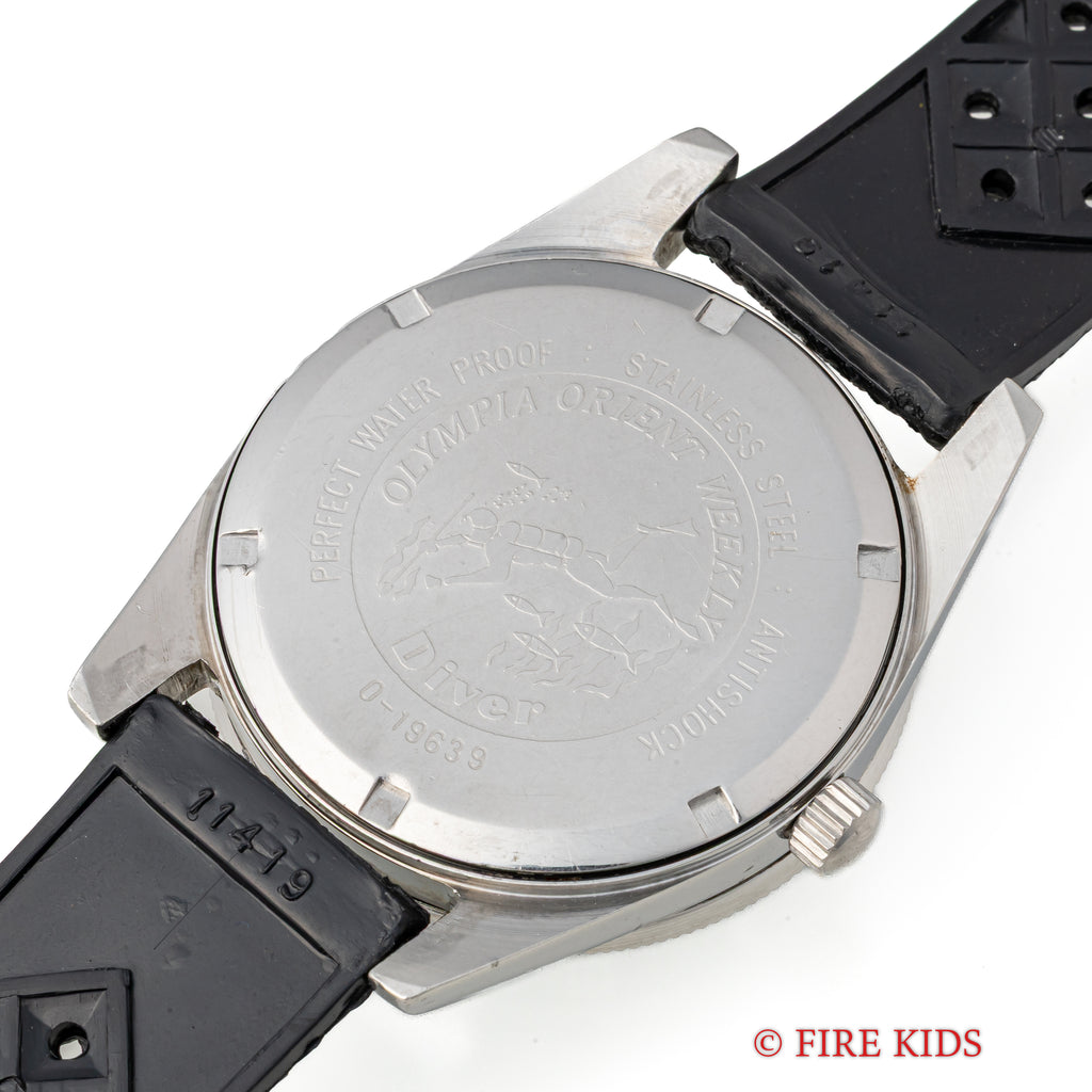 オリンピア オリエント ウィークリー 21ダイバー 1960年代 日本語曜日 アローハンド 手巻の入荷になります。オリンピア オリエント ウィークリーシリーズのダイバーモデルでツヤ有のブラックダイヤルにアロー針や扇状の窓枠のデイトも魅力的です。ムーブメントは手巻き21石の機械を搭載。ケースは小傷はございますが大きなダメージはございません。手巻きや針回しの操作はスムースです。ベルトは古いトロピックタイプのラバーベルトが取り付けられています。こちらの時計は分解掃除済みです。