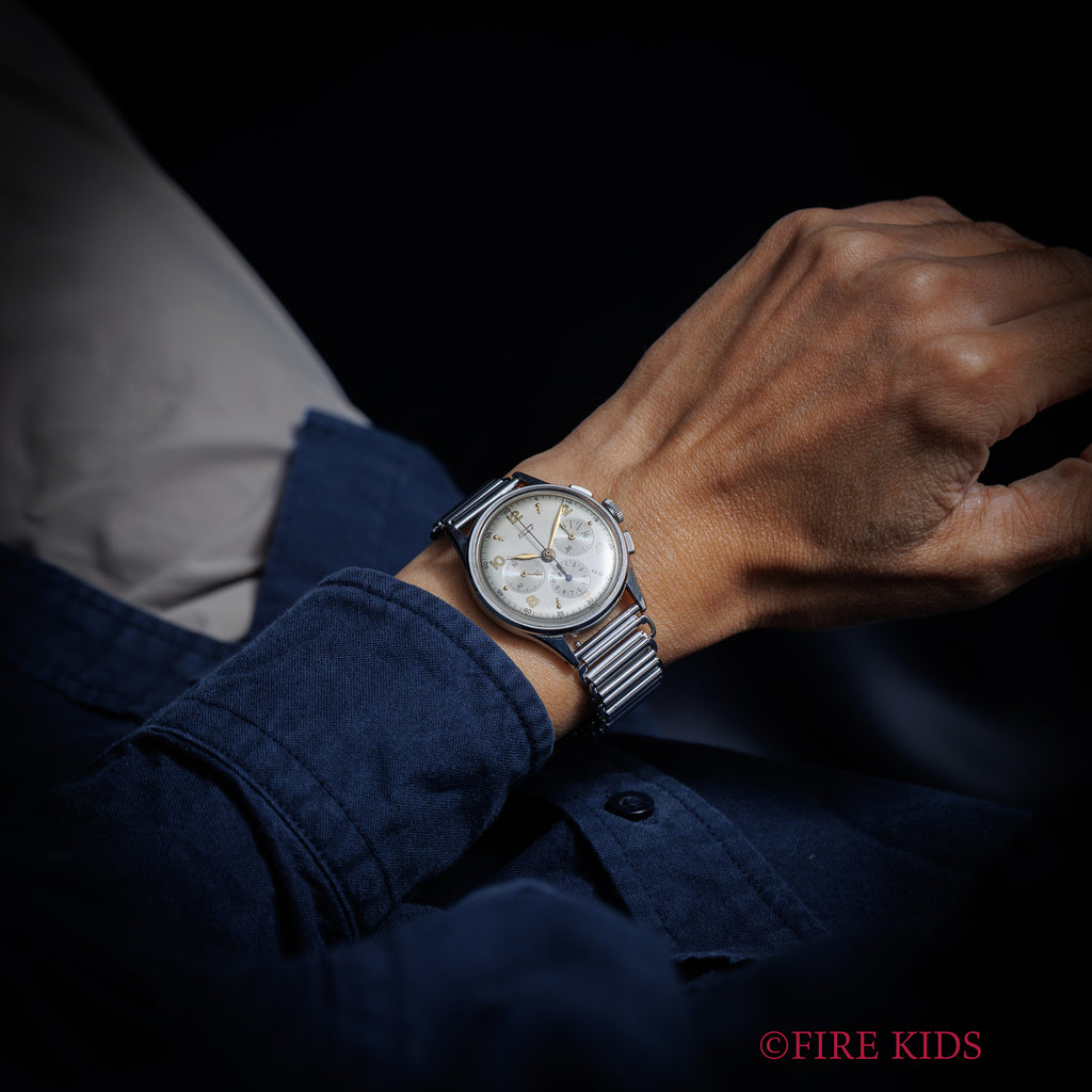 ティソ クロノグラフ 手巻き 1950年代製 Ref.6215-4 Cal.27-41H SS 飛びアラビアダイヤルです。幅約34mmのコンパクトな3レジスタークロノグラフでムーブメントはオメガCal.321の前身のCal.27-41Hを搭載しています。この年代としては経年は多少ありますが綺麗な方です。ケースも小キズが見られますが大きなダメージはありません。手巻きや針回し、クロノグラフの操作はスムースです。ベルトは雰囲気の合う社外のバンブーブレスを合わせています。