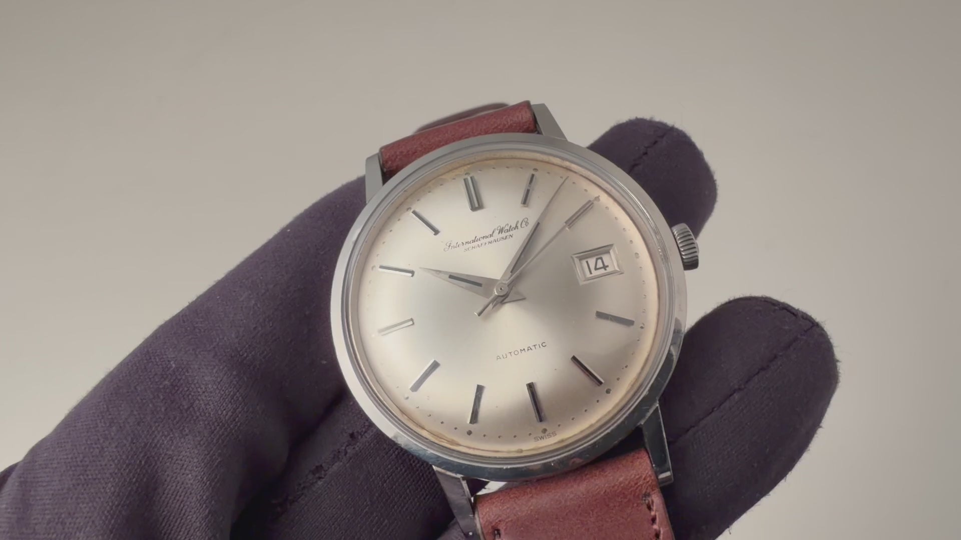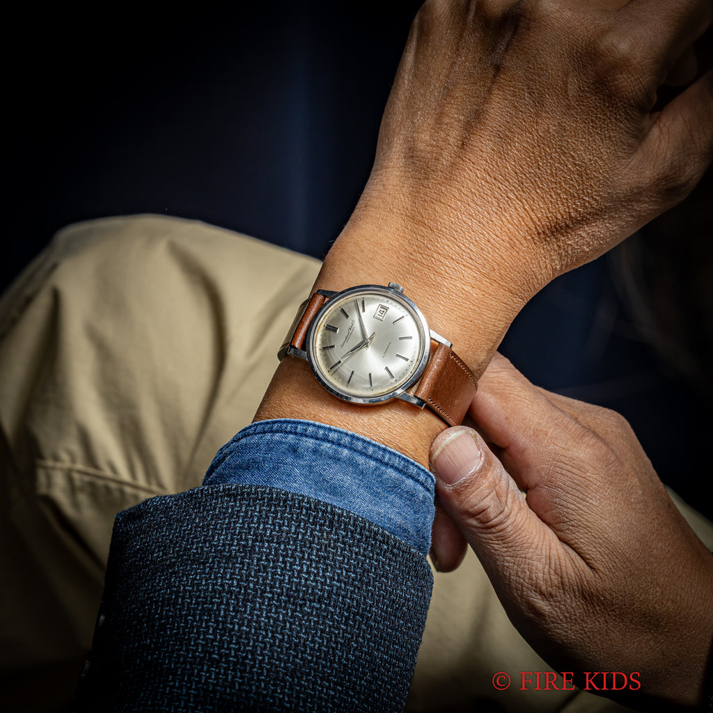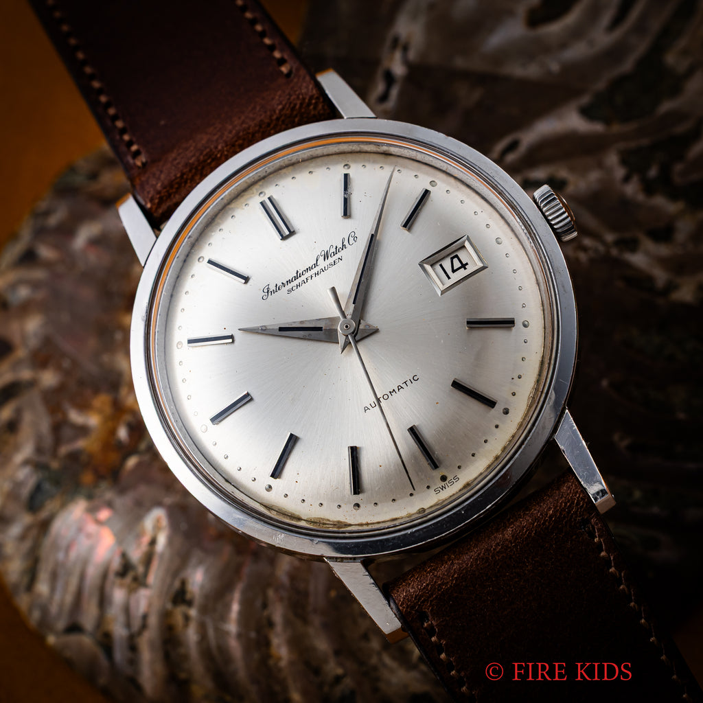 インターナショナルウオッチカンパニーの1967年製自動巻きラウンドケースです。ペラトン式自動巻きの完成形Cal.8541を搭載したモデルでオールドインターらしいシンプルな質実剛健なモデルです。シンプルだからこそ造りの良さが感じられます。文字盤はほんのりアイボリーがかった経年変化があり、文字盤ケース共に大きなダメージはありません。ベルトはファイアーキッズオリジナルのブッテーロレザーの革ベルトを合わせています。