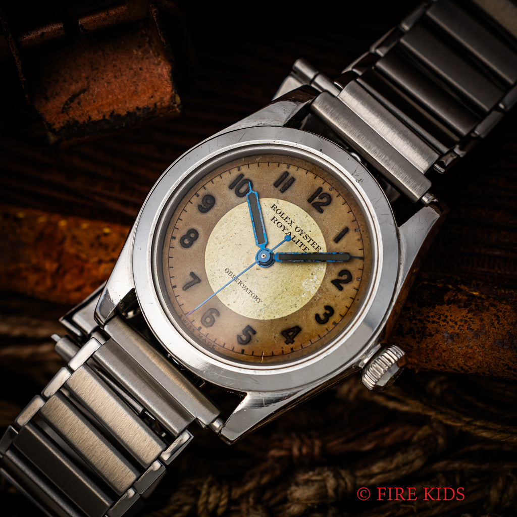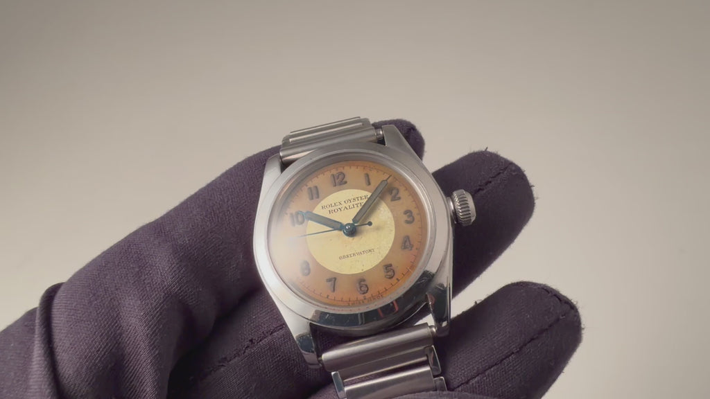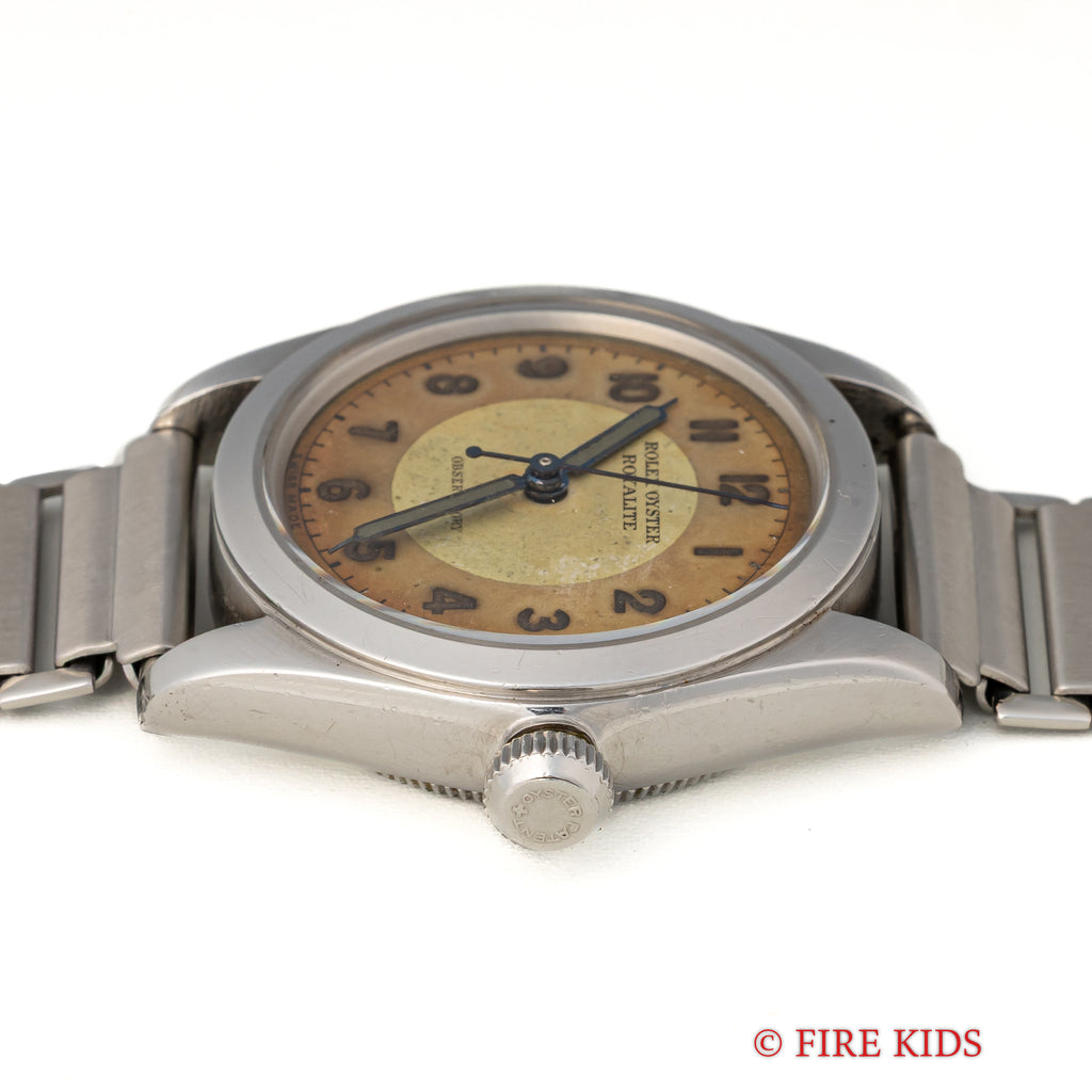 ロレックス オイスター ローヤライト 1942年製 Ref.2280 ツートンダイヤルです。小振りで可愛らしいサイズの一本ですが当時はメンズサイズです。ツートンダイヤルは雰囲気があります。年代なりの小傷や経年はあります。裏蓋に後入れの刻印があります。社外のバンブーブレスを合わせています。