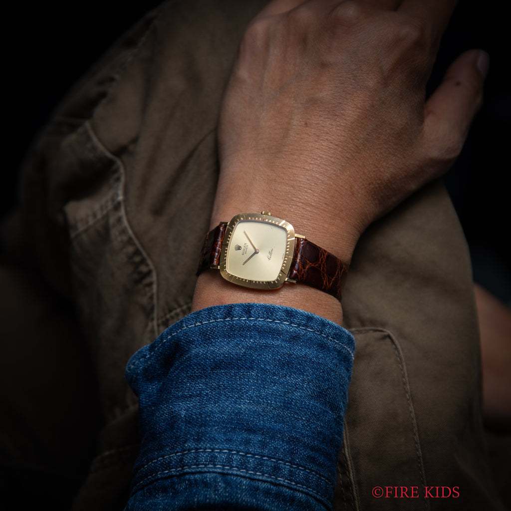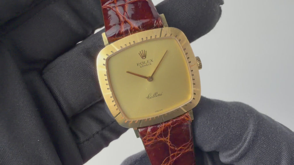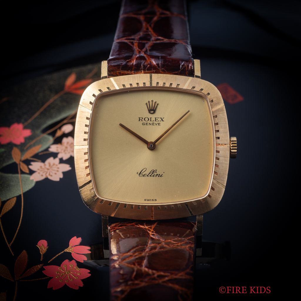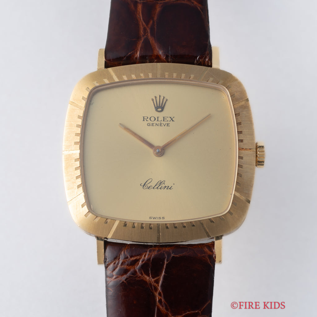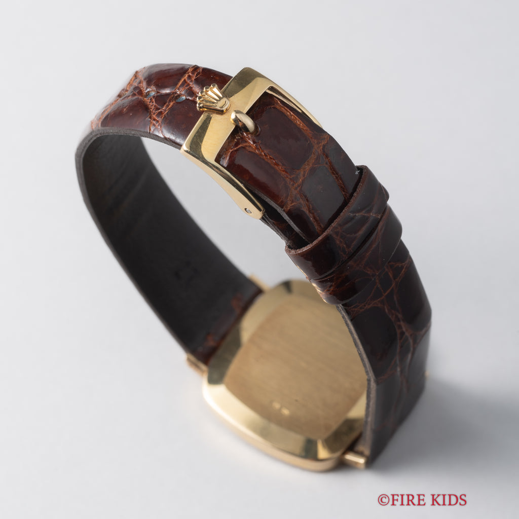 ロレックス 18金無垢チェリーニ 1981年製 Ref.4084 純正18金無垢尾錠付き 手巻きです。18金無垢のケースにシャンパンゴールドダイヤルにミニッツの刻みがベゼルに彫られたデザインです。幅約30㎜(リューズ別)厚さ約5㎜と小ぶりで上品なサイズ感です。ムーブメントは手巻きのCal.1601を搭載。ケースは小傷はございますが大きなダメージはございません。手巻きや針回しの操作はスムーズです。ベルトは社外のクロコダイル革ベルトに純正の18金無垢尾錠が付いています。