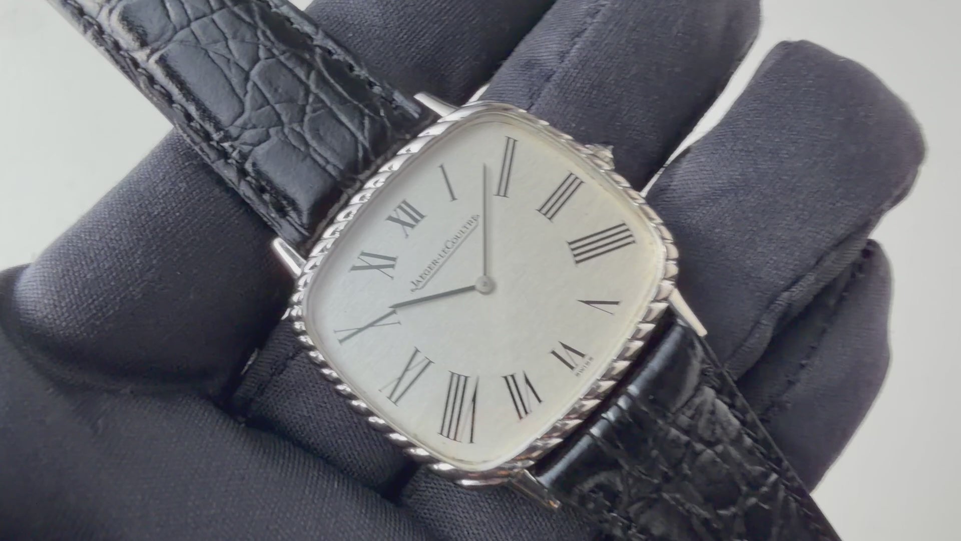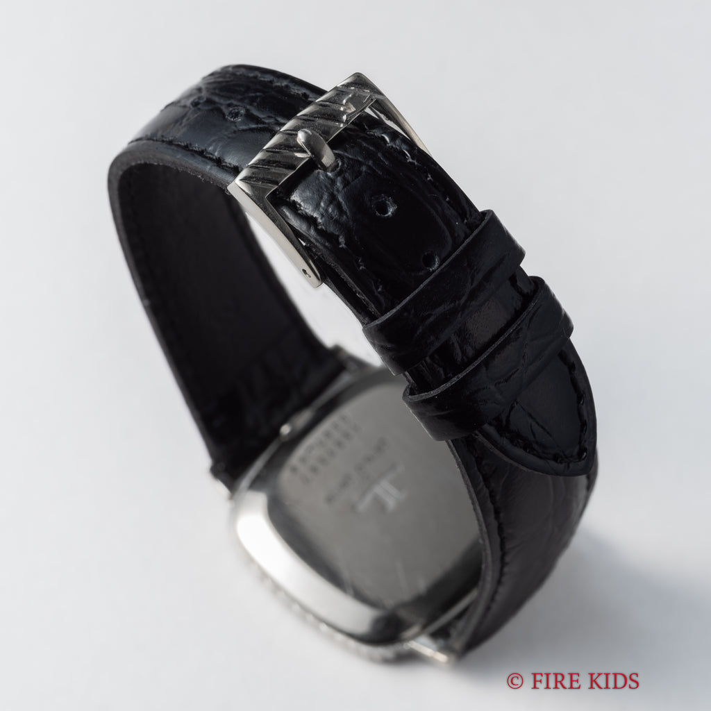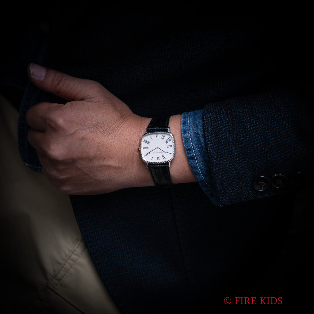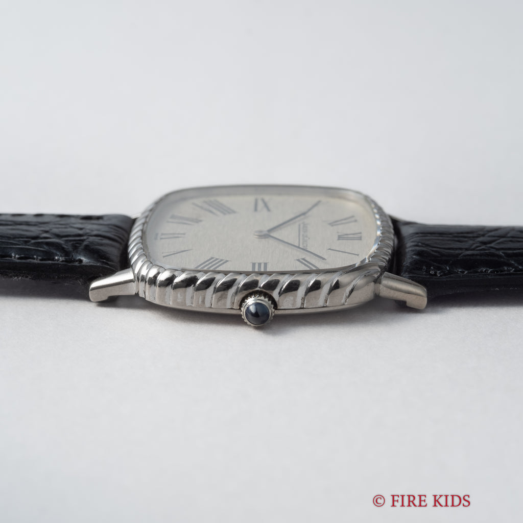 1970年代製のジャガー・ルクルト18金無垢 スクエアケース ジェラルドジェンタデザインが純正尾錠付きで入荷しました。シルバーローマンに二針のペンシルハンドを配したエレガントな一本です。ケースも小傷程度で大きなダメージはありません。薄型手巻きのCal.P838を搭載し、手巻きや針回しはスムーズです。ベルトは社外の革ベルトに純正金無垢尾錠が付いています。