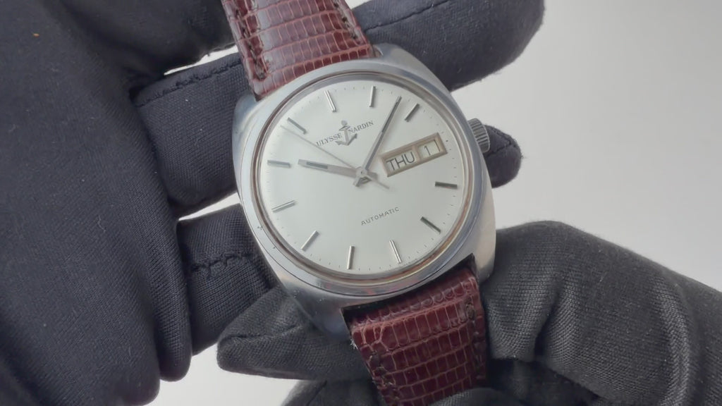 スイスの名門ユリスナルダン 1970年代製 オートマチック デイデイト トノーケースです。シンプルなトノーケースにシルバーダイヤルは名門らしい品のある腕時計です。針とインデックスの一部に黒色が施され視認性が良く、シンプルで実用性の高い1本です。1時位置のラグ外側に小さな打痕があり、ダイヤル、ケースともに年代なりの経年や小傷はありますが、大きなダメージはありません。ムーブメントは金メッキが施されたCal.N11JBです。手巻きや針回しはスムーズです。ベルトは社外の革ベルトが取り付けてあります。