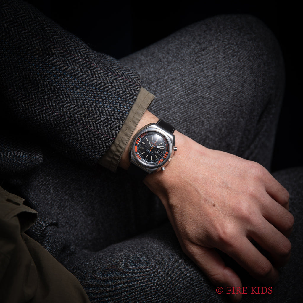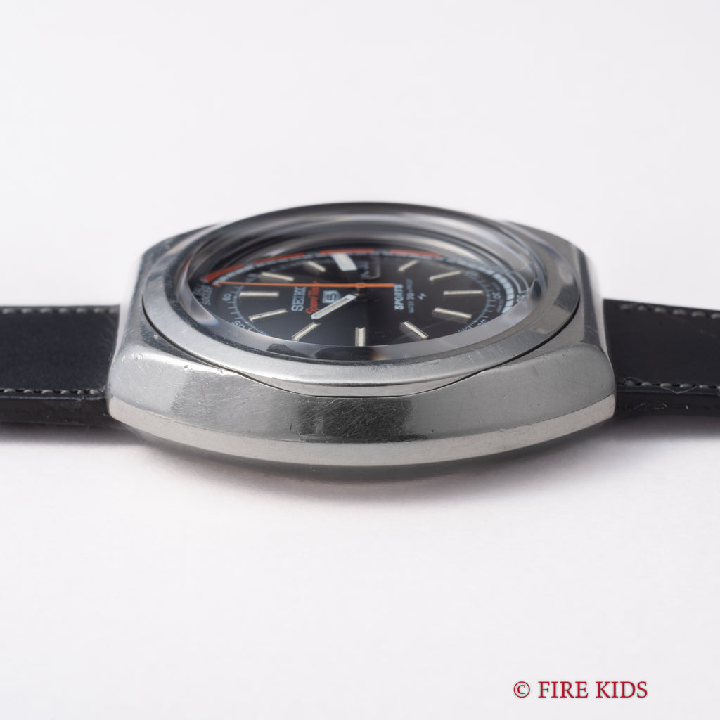 1970年製のセイコー自動巻きクロノグラフ スピードタイマーの入荷です。積算系を排し、インナー回転ベゼルを装備しています。曜日はリューズを押し込み早送りができ、日本語、英語表記を選ぶことができます。日付の早送りはリューズを一段引いて回して行います。ケースや文字盤も綺麗で状態は良好です。ファイアーキッズオリジナルのブッテーロ革ベルトが取り付けられています。手巻き機能はありませんが、現行のSEIKOにも採用されているマジックレバーを搭載しているため巻き上げは良いです。こちらは分解掃除済です。