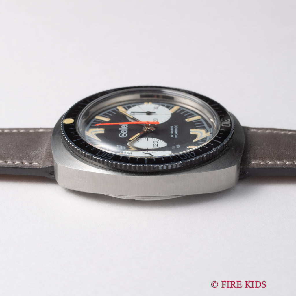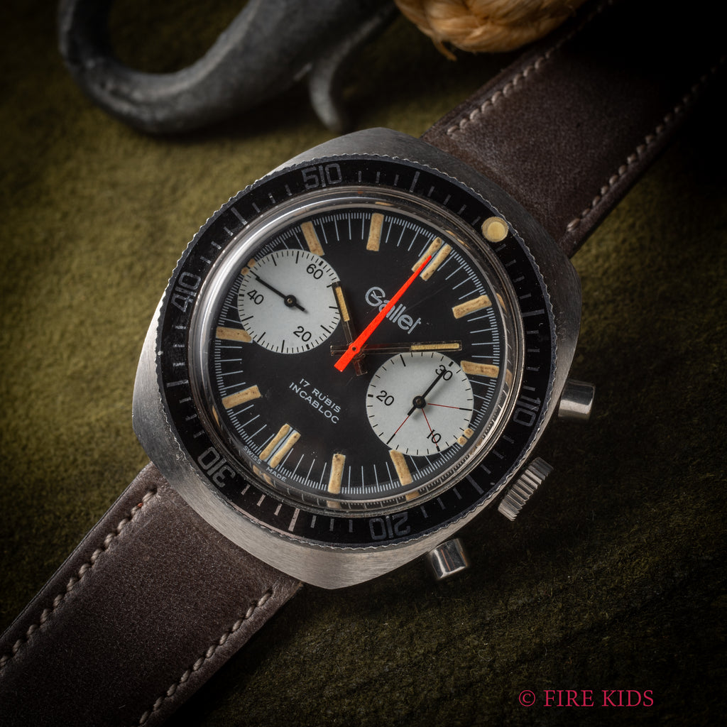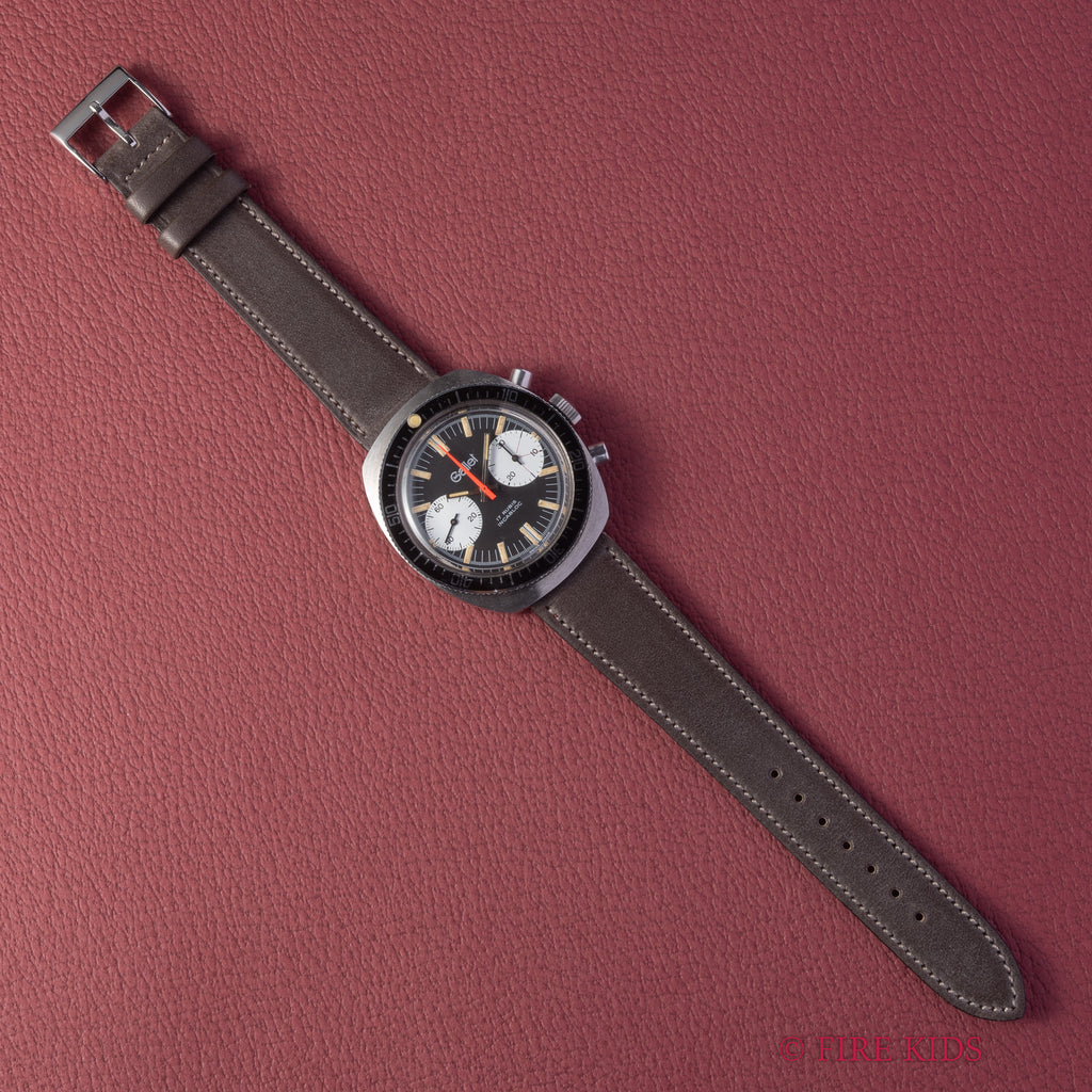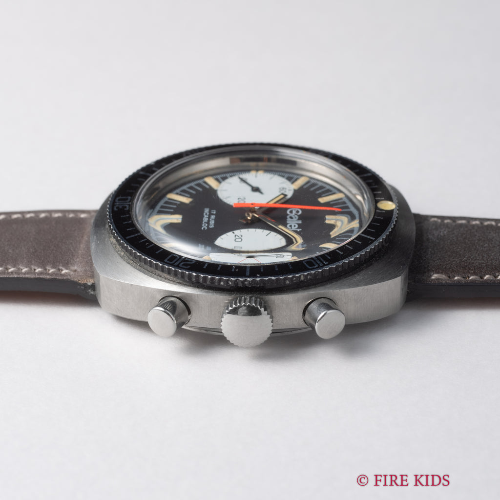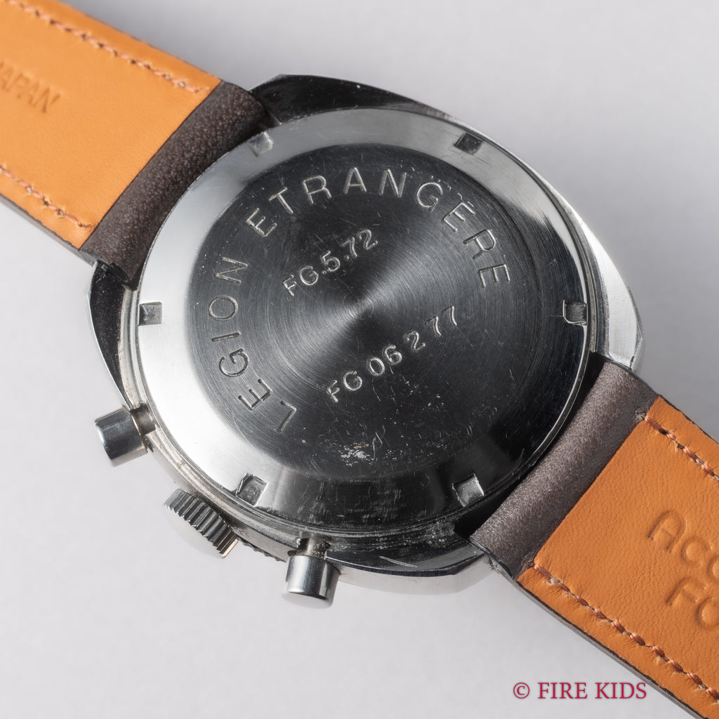 ギャレットの2レジスタークロノグラフ1960年代後半~70年代前半製です。フランス外人部隊(LEGION ETRANGERE)で使用された本物のミリタリークロノグラフです。黒文字盤に白のインダイヤル、オレンジのクロノセンター針が印象的な1本です。回転ベゼルを装備している所も格好良いポイントです。裏蓋にLEGION ETRANGEREの刻印と1972年1977年の刻印があります。ムーブメントはバルジュー7733を搭載しています。夜光は程よく色づいて雰囲気抜群です。ケースは小傷がありますが大きなダメージはありません。手巻きや針回し、クロノグラフの操作はスムースです。ベルトは新品のファイアーキッズオリジナル革ベルト(イタリアンレザーのブッテーロで裏面ラバー)が取り付けられています。