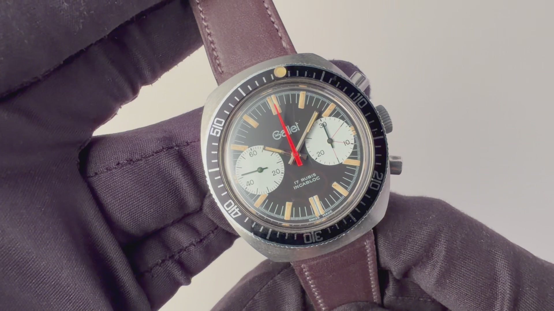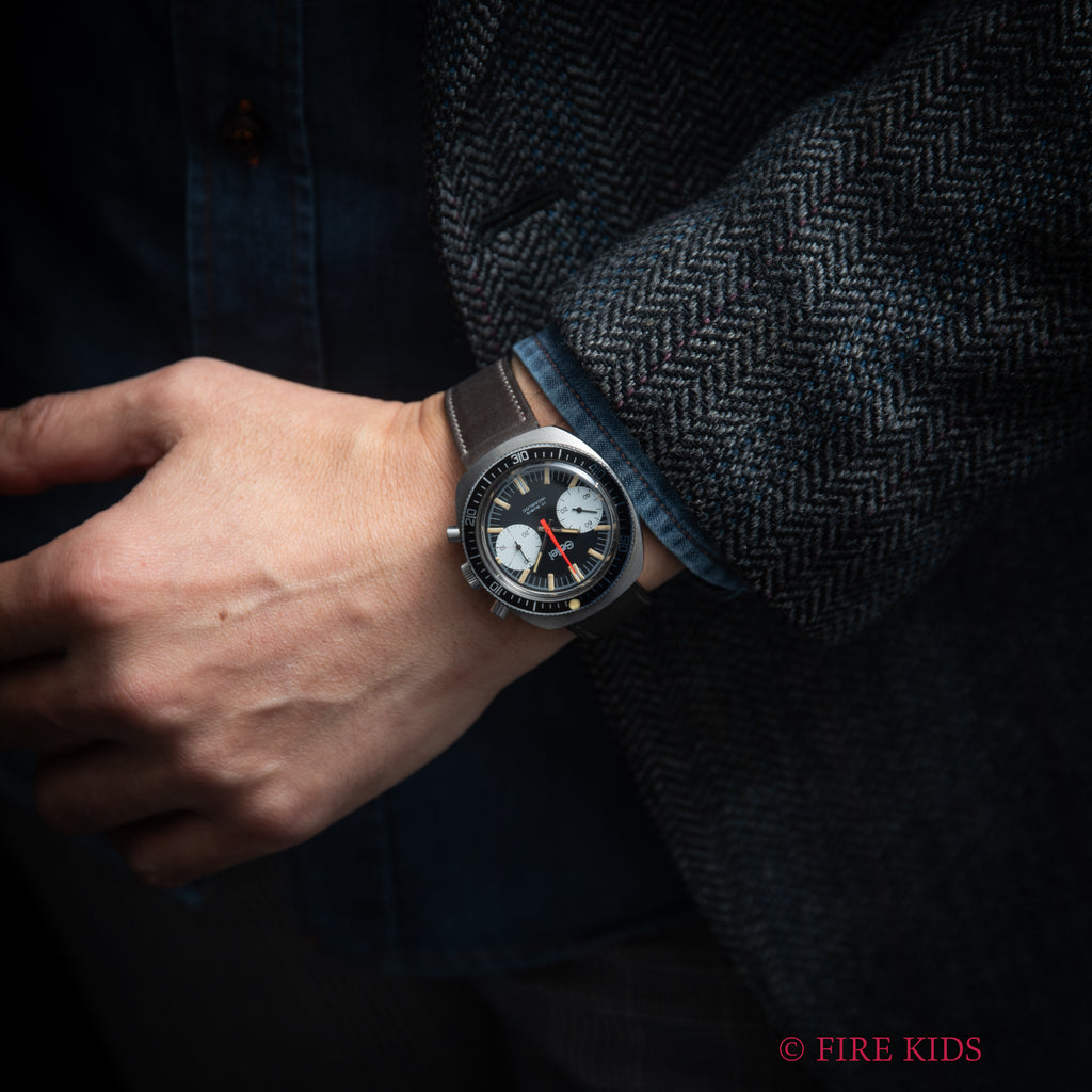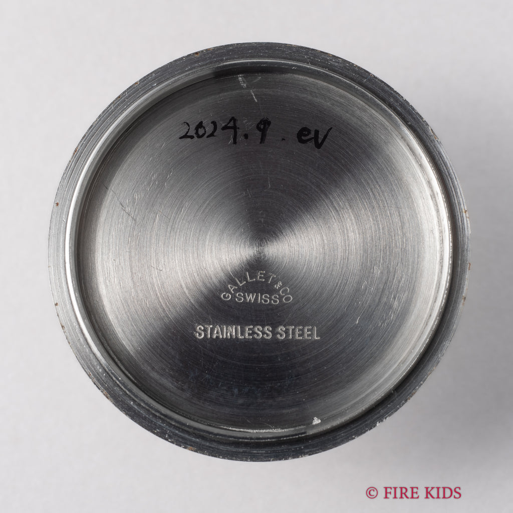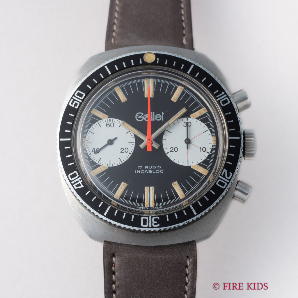 ギャレットの2レジスタークロノグラフ1960年代後半~70年代前半製です。フランス外人部隊(LEGION ETRANGERE)で使用された本物のミリタリークロノグラフです。黒文字盤に白のインダイヤル、オレンジのクロノセンター針が印象的な1本です。回転ベゼルを装備している所も格好良いポイントです。裏蓋にLEGION ETRANGEREの刻印と1972年1977年の刻印があります。ムーブメントはバルジュー7733を搭載しています。夜光は程よく色づいて雰囲気抜群です。ケースは小傷がありますが大きなダメージはありません。手巻きや針回し、クロノグラフの操作はスムースです。ベルトは新品のファイアーキッズオリジナル革ベルト(イタリアンレザーのブッテーロで裏面ラバー)が取り付けられています。