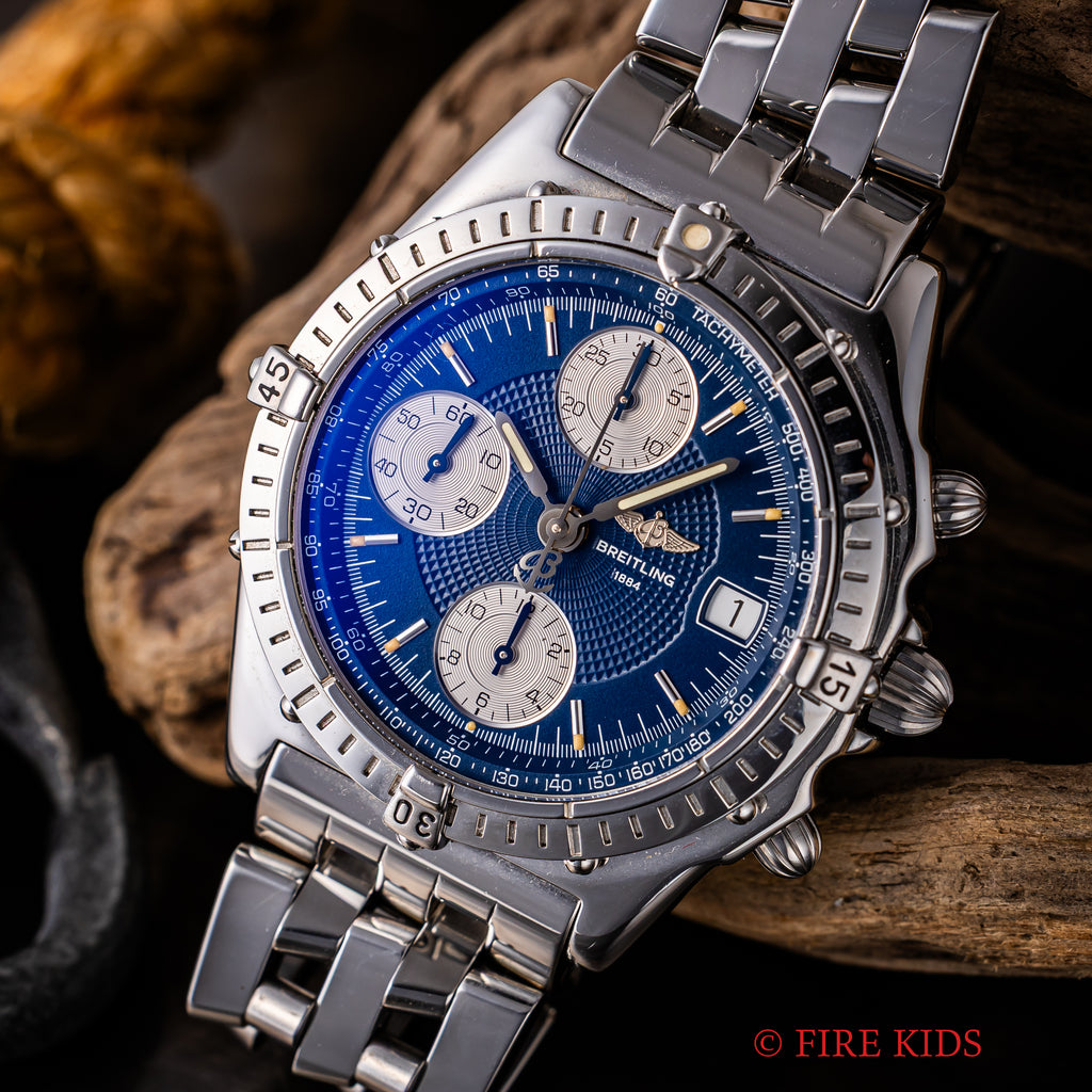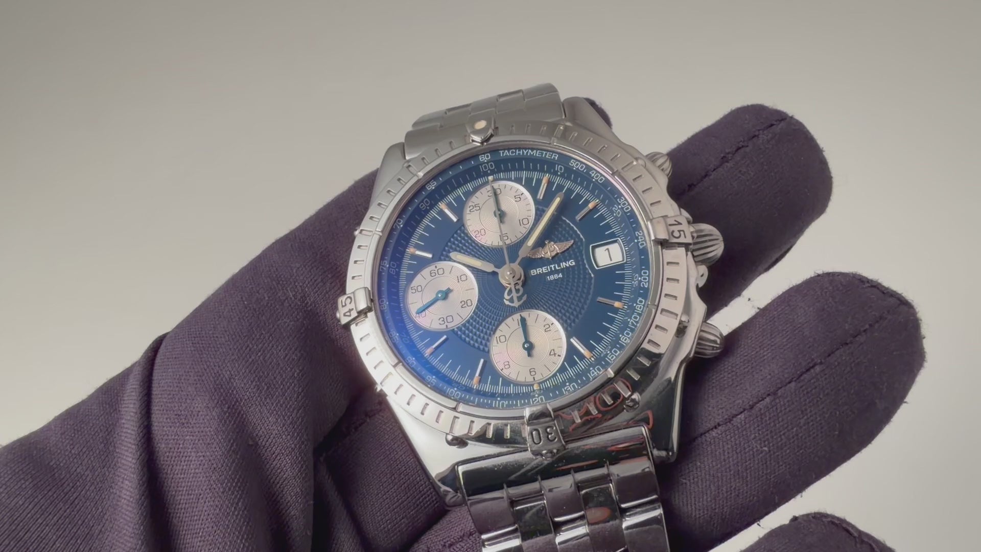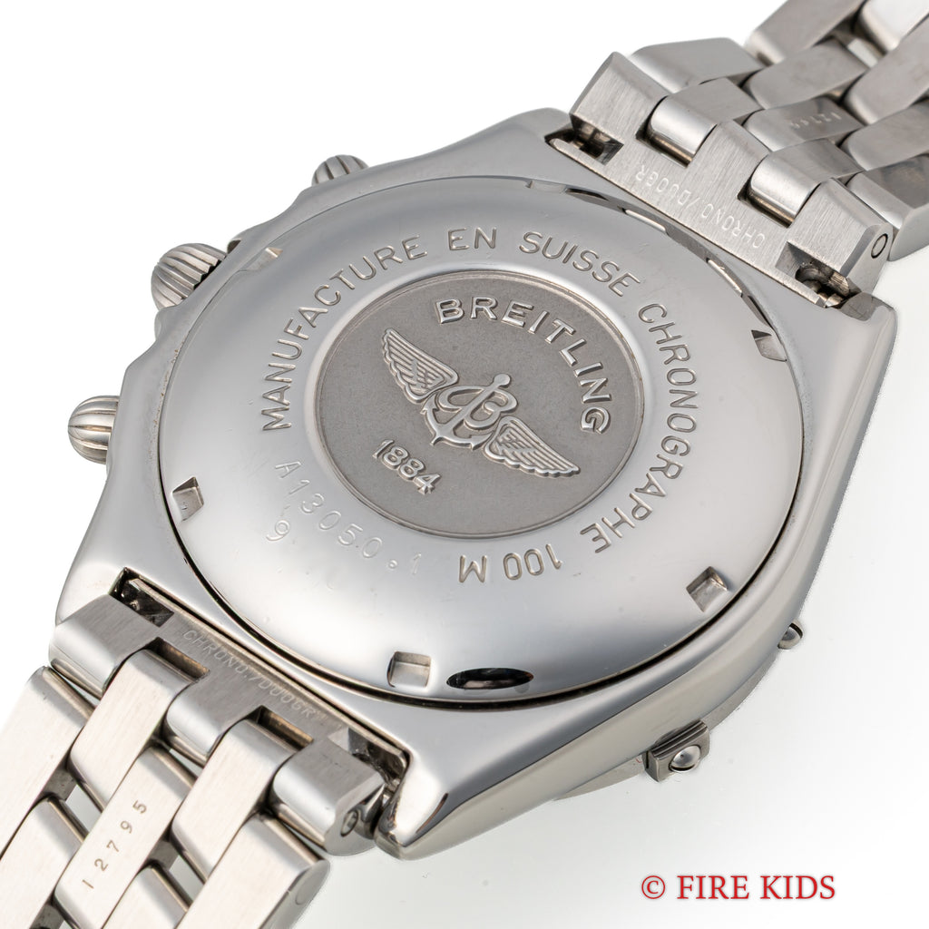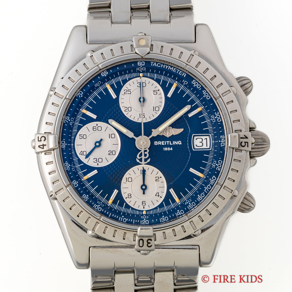 ブライトリング クロノマット 1990年代製  Ref.A13050.1です。ステンレスケースの使いやすい一本で、ダイヤルはブルーにインダイヤルがホワイトの爽やかな組み合わせのパイロットウォッチです。39mm径の使いやすいサイズのケースは小傷はございますが、大きなダメージはございません。ムーブメントは自動巻きクロノメーターのCal.7750を搭載。手巻きや針回し、クロノグラフの操作はスムースです。ブレスレットは純正の頑強なブレスレットが付いております。