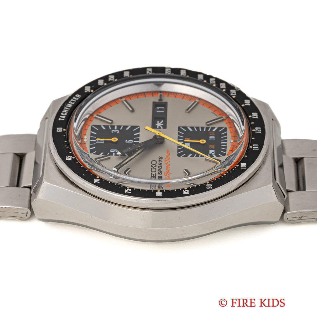 セイコー スピード タイマー 1975年製です。通称「角目」と呼ばれる縦目のインダイヤルが特徴です。インダイヤルがブラックになっており、オレンジの針が良いアクセントになっています。重厚なケースは小傷が見られますが大きなダメージはありません。ムーブメントはCal.6138Bを搭載、手巻き、巻き上げやクロノファンクションは良好です。ベルトはオリジナルステンレスブレスが付いています。こちらは分解掃除済です。