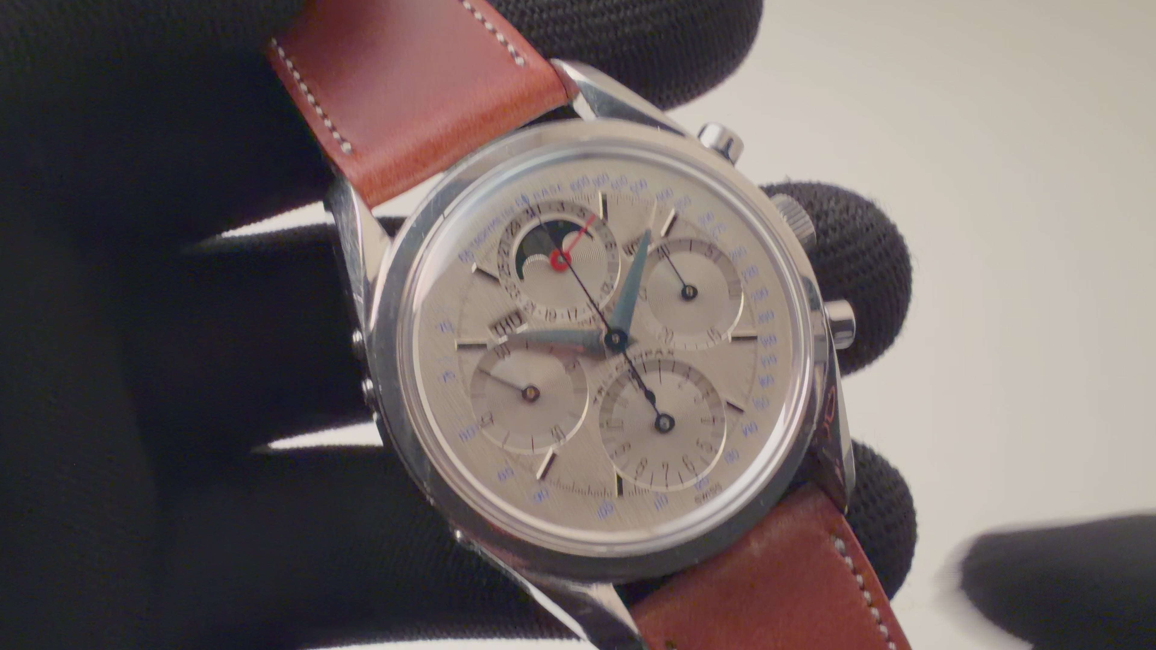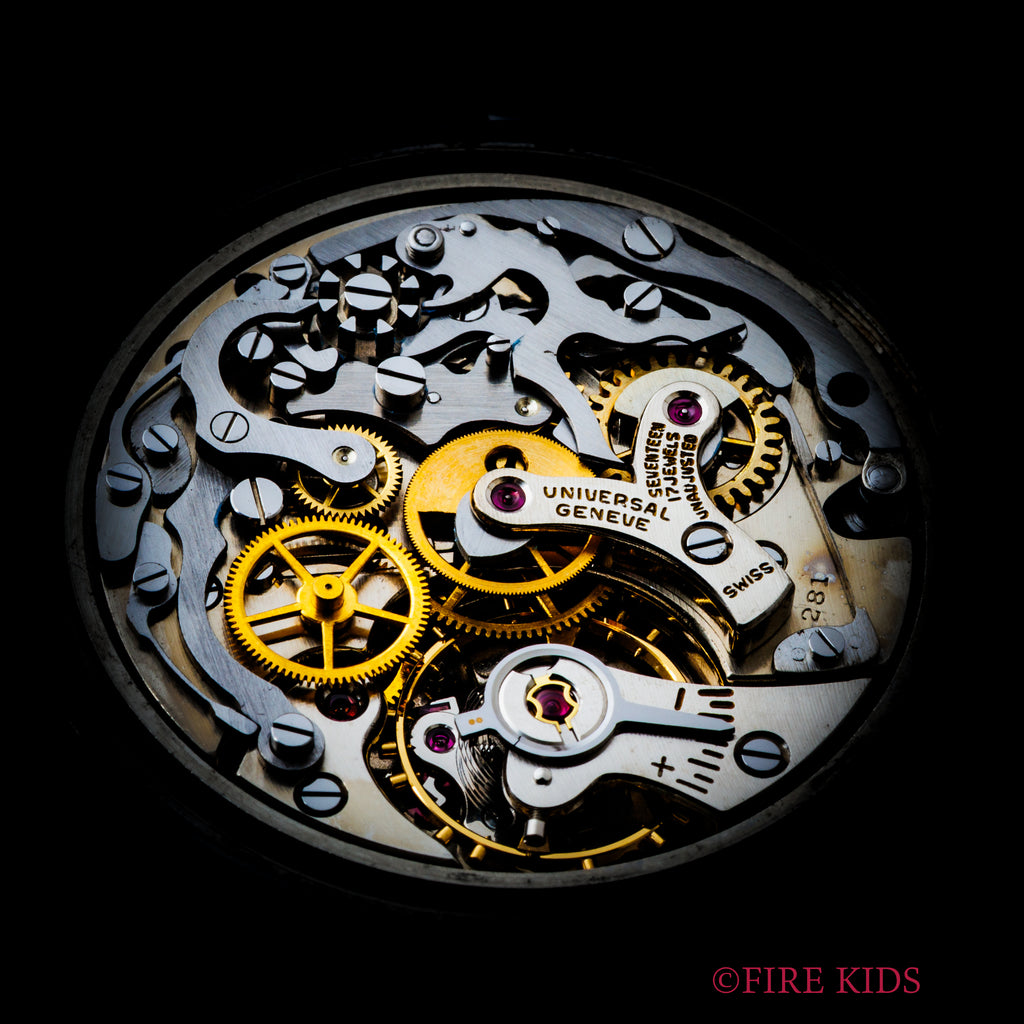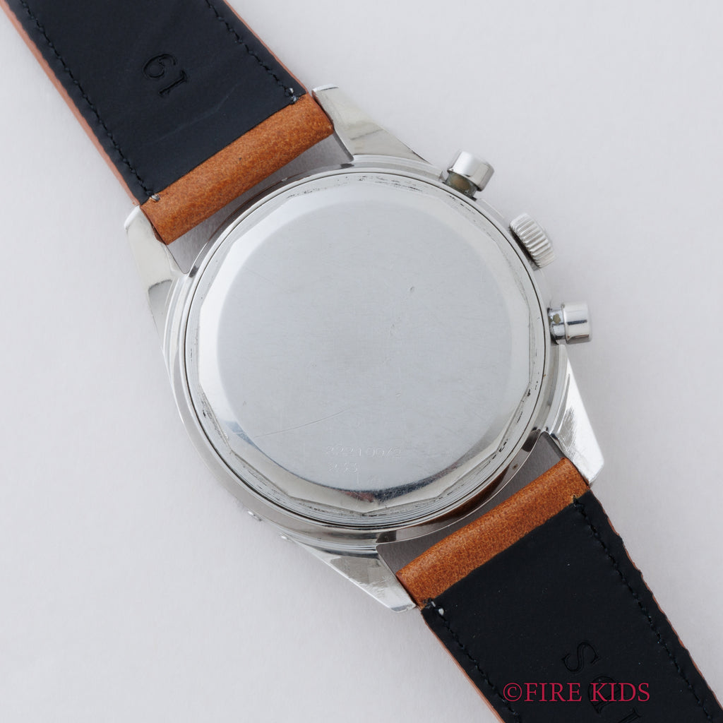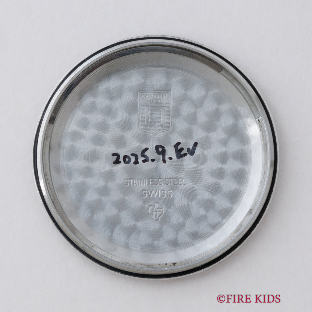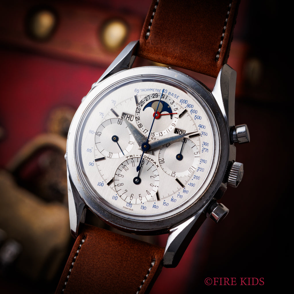 ユニバーサル・ジュネーブ トリコンパックス 1960年代製 Ref.222100/2 手巻き Cal.281 トリプルカレンダームーンフェイズクロノグラフの入荷になります。トリプルカレンダームーンフェイズクロノグラフのトリコンパックスは、複雑系クロノグラフを代表するモデルで、クロノグラフファンには特別な存在となっています。文字盤はダメージを感じない綺麗な状態です。ケースも小キズが見られますが、磨きの少ない自然な状態です。裏蓋の型番、シリアルの刻印も綺麗に残っています。ムーブメントはCal.281を搭載、手巻きや針回し、クロノグラフの操作、カレンダーの送り操作はスムースです。ベルトはファイアーキッズオリジナルのクロコダイル革ベルトが取り付けられています。