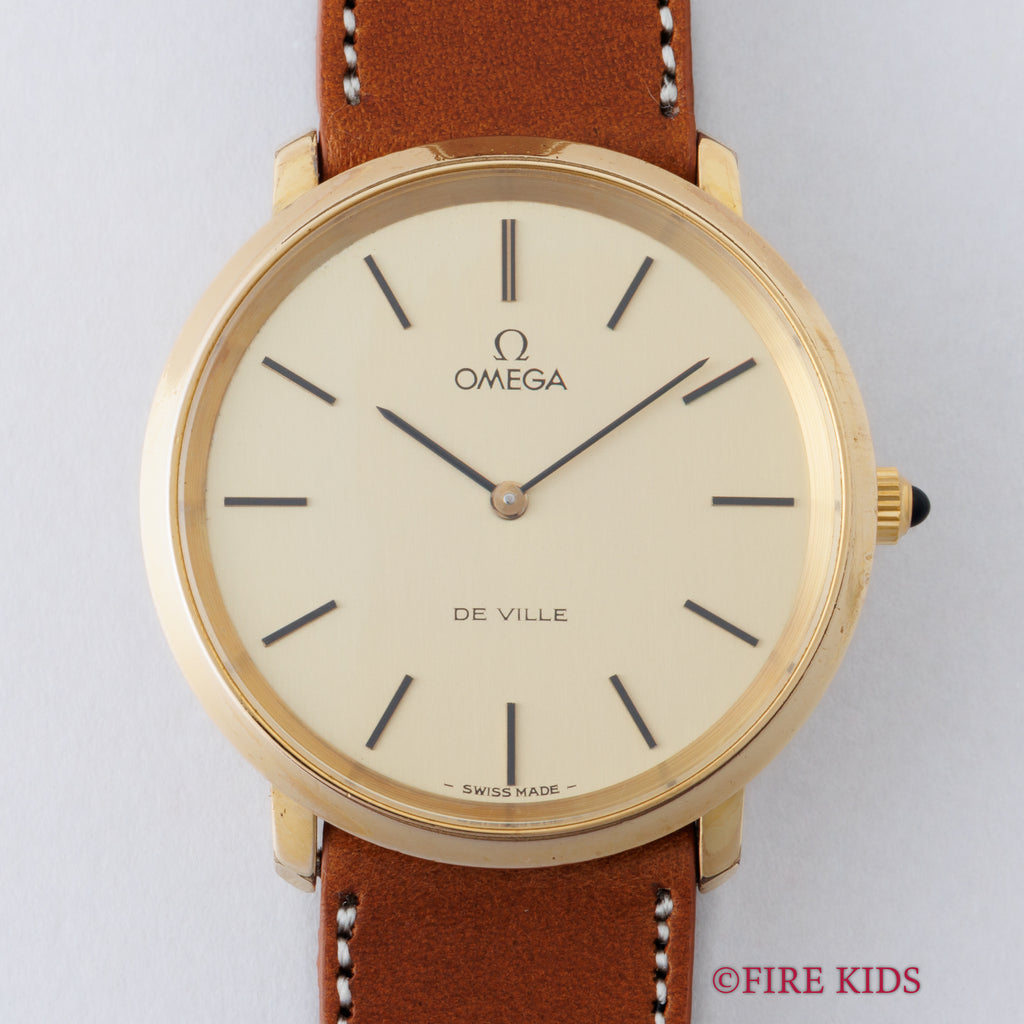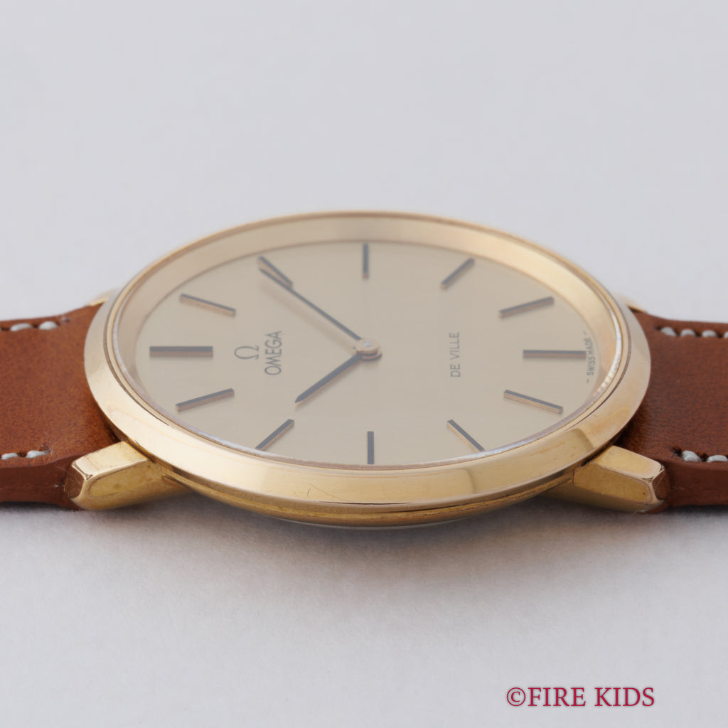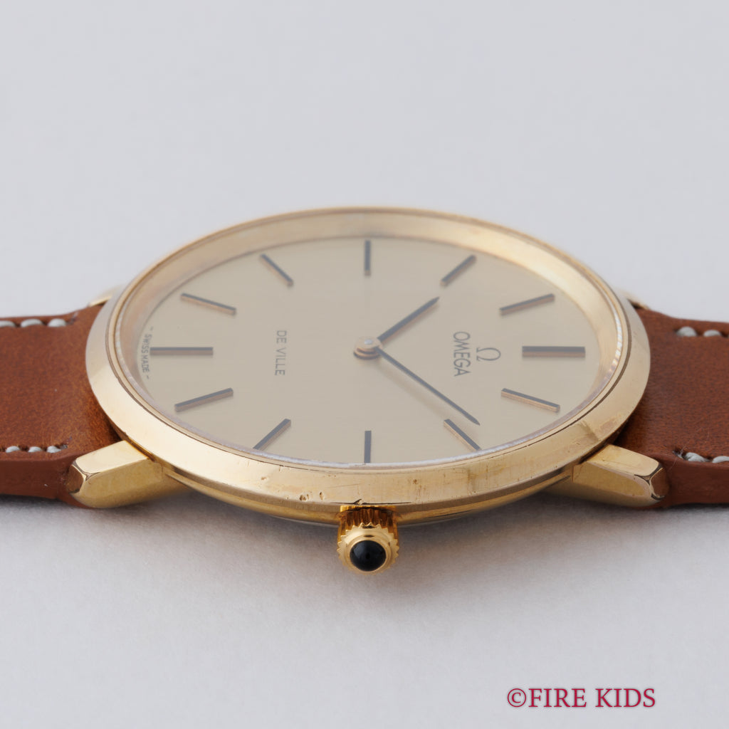 オメガ デ・ヴィル 1978年製 シャンパンダイヤル Ref.111.0107 手巻き Cal.625の入荷になります。GP/バックステンのケースにシャンパンダイヤルを合わせた一本。文字盤はシミ等無く綺麗です。ケースは小傷、若干のメッキの剥がれが見られますが大きなダメージはありません。ファイアーキッズオリジナルのイタリアンレザーのブッテーロ(裏面ラバー)が取り付けられています。