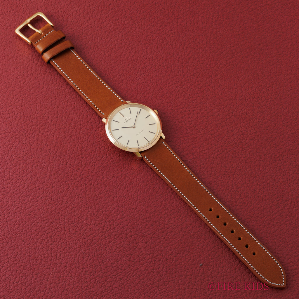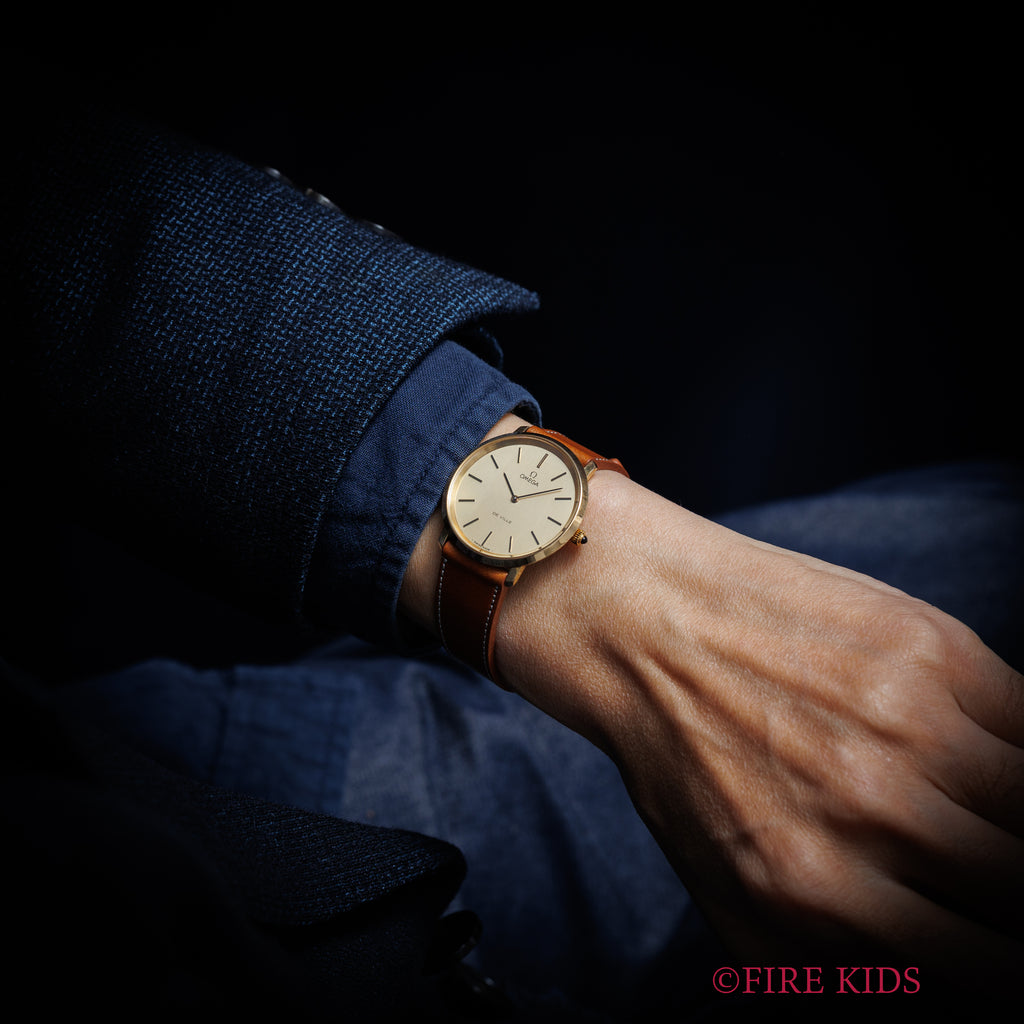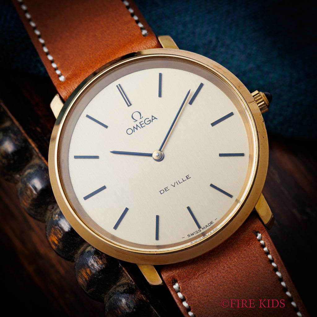 オメガ デ・ヴィル 1978年製 シャンパンダイヤル Ref.111.0107 手巻き Cal.625の入荷になります。GP/バックステンのケースにシャンパンダイヤルを合わせた一本。文字盤はシミ等無く綺麗です。ケースは小傷、若干のメッキの剥がれが見られますが大きなダメージはありません。ファイアーキッズオリジナルのイタリアンレザーのブッテーロ(裏面ラバー)が取り付けられています。