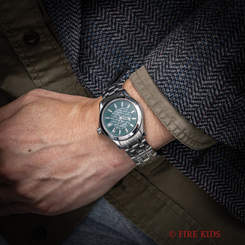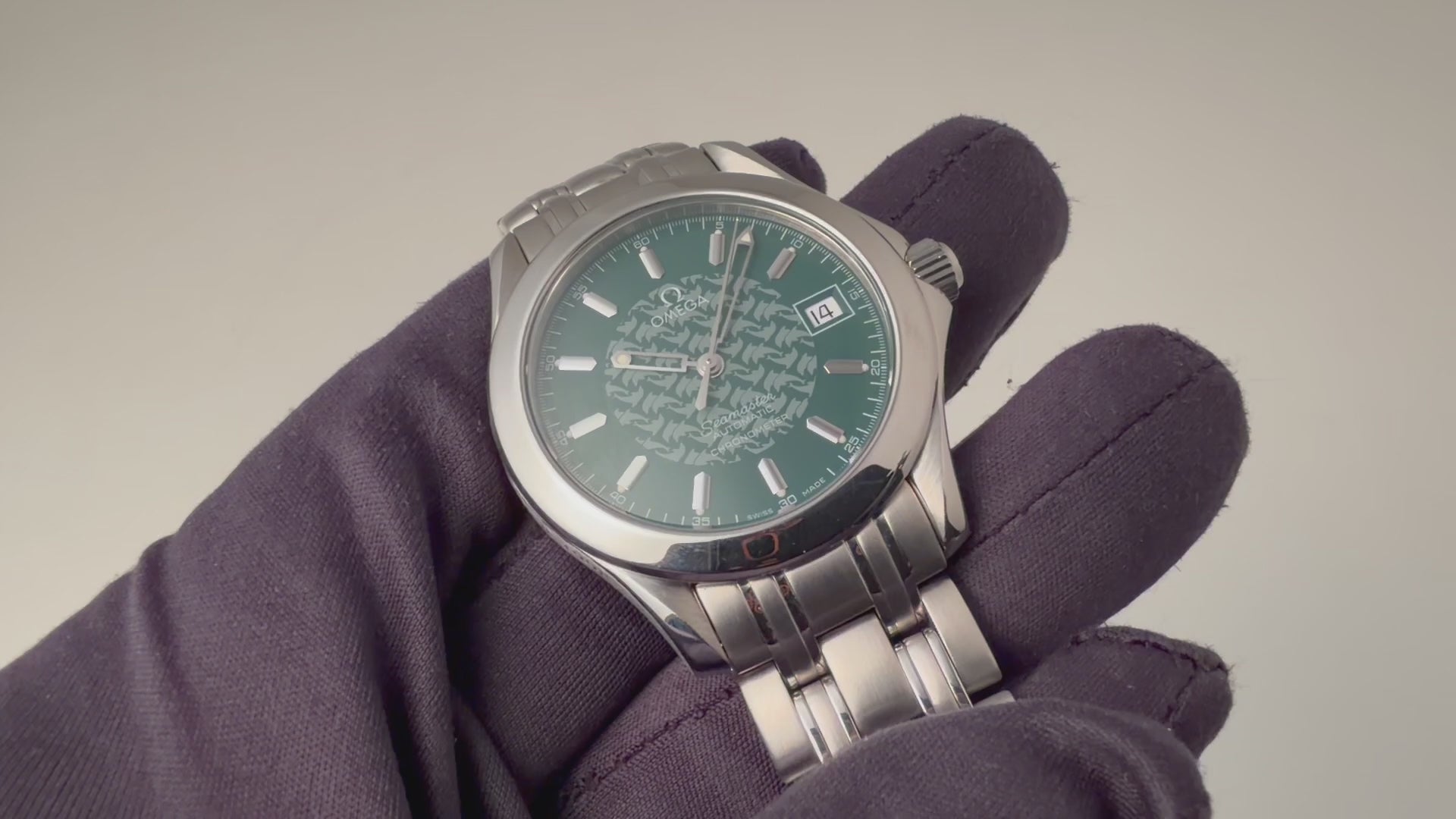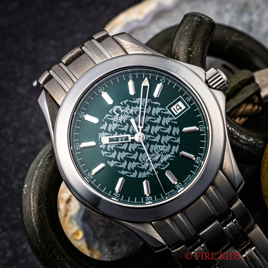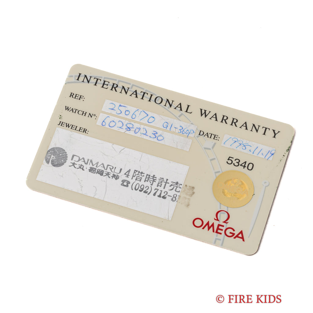 オメガ シーマスター120 ジャック・マイヨール 1998年製 限定モデル 自動巻き Ref.2506.70168.1614 Cal.1120です。世界で初めて素潜りで100mを超えたジャックマイヨールの冠したモデルで、ケース側面には「JACQUES MAYOL 1998」の刻印と文字盤中央にはイルカのパターンがプリントされています。ムーブメントは自動巻きのCal.1120を搭載。ケースは小傷程度で大きなダメージはございません。ベルトは純正のステンレスベルト1501/823が取り付けてあります。手巻きや針回し、ねじ込みリューズの操作はスムースです。こちらはギャラ付です。
