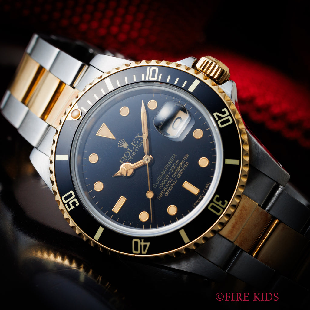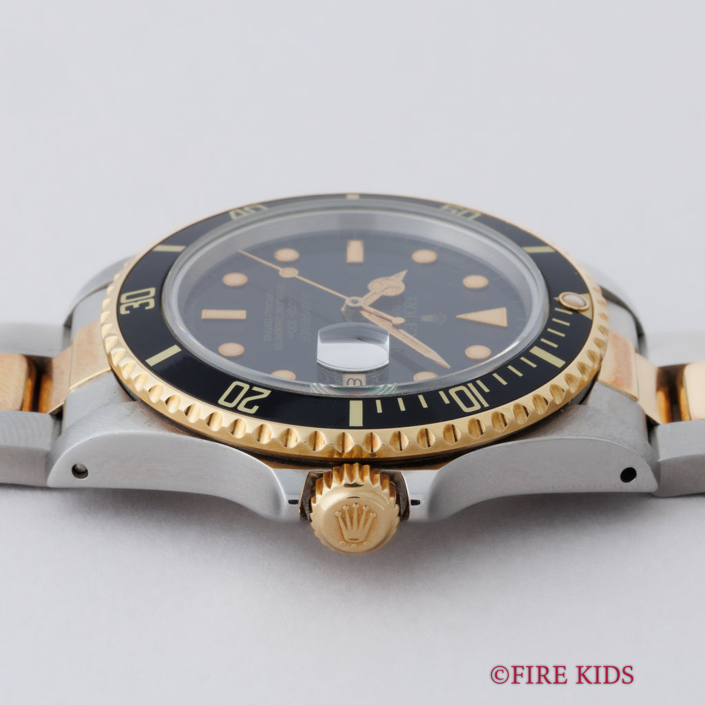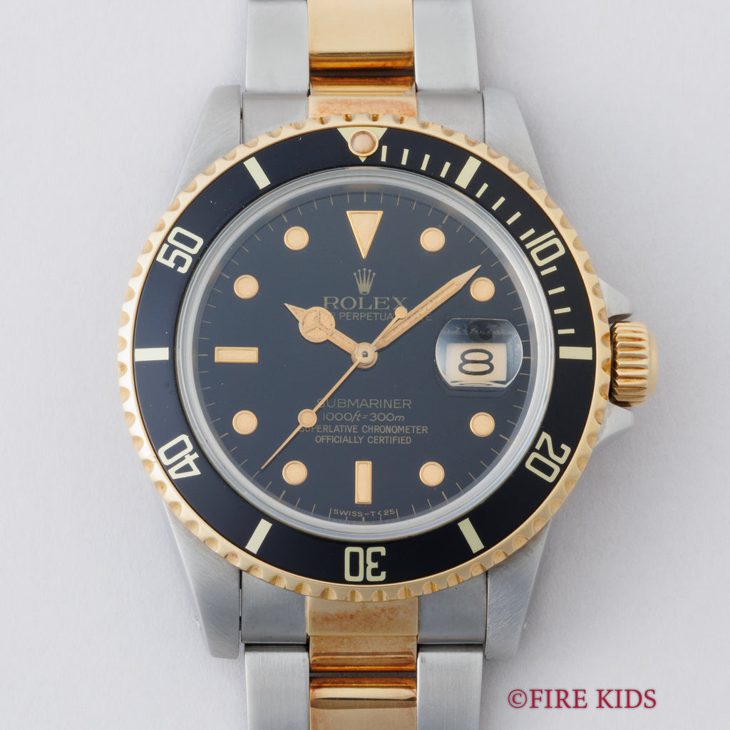 ロレックス サブマリーナー コンビ 1983年製 Ref.16803 オールトリチウム 純正サブマリーナー用コンビブレスの入荷になります。ロレックスサブマリーナー黒コンビモデルです。トリチウム夜光が抜群の雰囲気になっています。サブマリーナーの数あるバリエーションの中でも黒と金のコンビのケースで大人な雰囲気の時計です。ケースは小傷が見られますが大きなダメージはありません。ムーブメントは自動巻きのCal.3035を搭載。手巻きや針回し、ねじ込みの操作はスムースです。ブレスは純正93153/FF493が取り付けられています。