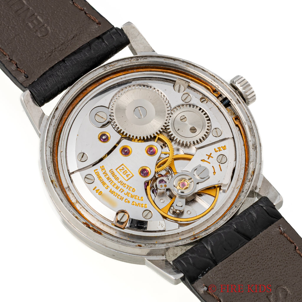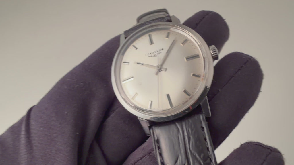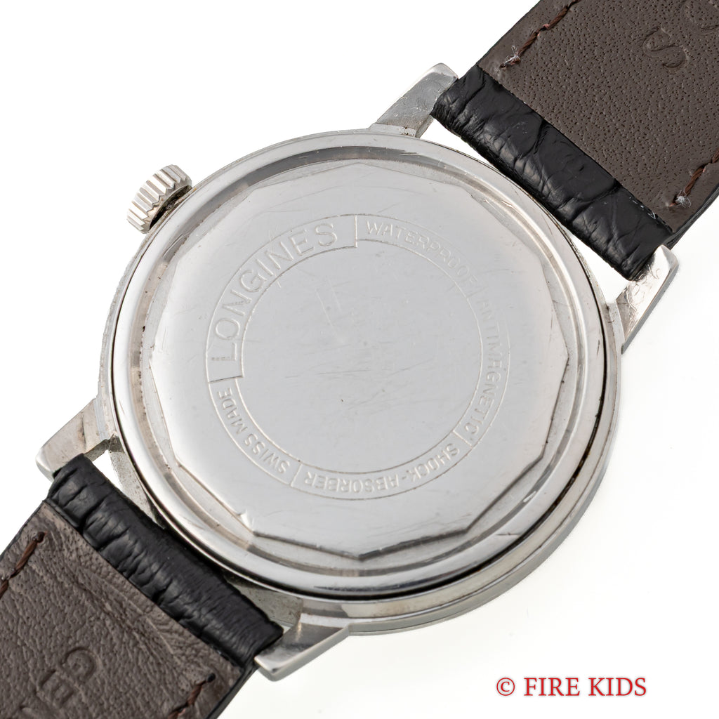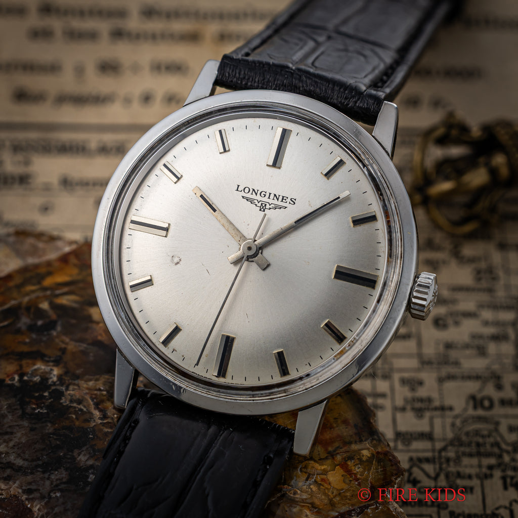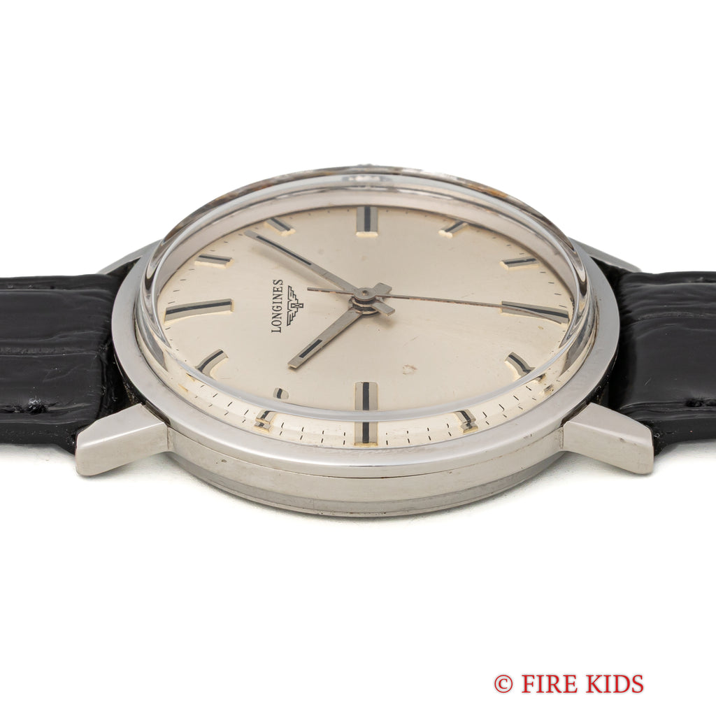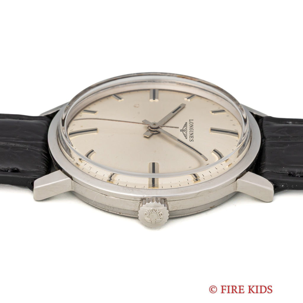 ロンジン ラウンド 手巻き スクリューバック 1967年代製です。ドーム状の文字盤、太めの針とインデックス、スクリューバックとシンプルながらじっくり見ていくと良い時計だと感じさせられる一本です。多少経年はありますが大きなダメージはありません。ファイアーキッズオリジナルのクロコダイル革ベルトを合わせています。