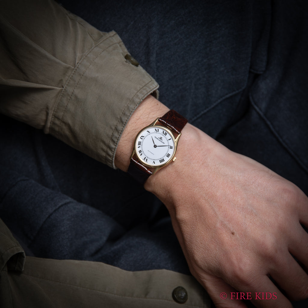 ジャガー・ルクルト 1970年代製 ラウンド ホワイトローマン 18KYG 自動巻き Ref.5001 21 Cal.900が入荷しました。18KYGケースにホワイトローマンダイヤル、2針の組み合わせで高級感のある一本です。ケースは小傷はありますが大きなダメージはありません。手巻きや針回しはスムーズです。ベルトは社外のクロコダイル革ベルトを合わせています。こちらは純正尾錠がついています。