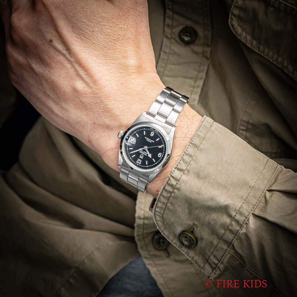チューダー プリンスデイト 1998年製 ブラックアラビアダイヤル 王冠リューズ 純正ステンレスブレスの入荷になります。ブラックの文字盤にホワイトレターが映える組み合わせでレンジャーのような形状の針もロレックスには無い魅力です。ムーブメントは自動巻きのCal.2824-2を搭載。ケースは小傷はございますが大きなダメージはございません。リューズのねじ込み、手巻きや針回しの操作はスムースです。ベルトは純正のステンレスブレスが取り付けてあります。箱、ギャラ付きです。