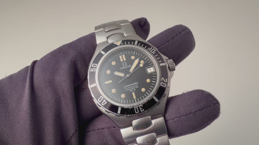 オメガ シーマスター200m 1988年製 プレボンド ミッドサイズ 自動巻き クロノメーター ジェンタデザインの入荷になります。通称「プレボンド」と呼ばれています。デザインはジェラルド・ジェンタ氏が手掛けたと言われているダイバーズウオッチになります。厚みが抑えられフィット感の良いダイバーズウオッチです。ムーブメントは自動巻きのCal.1111を搭載。ケースには大きなダメージはありません。手巻きや針回し、カレンダー早送り、リューズねじ込みの操作はスムーズです。ベルトは純正ステンレスブレス1465/453が取り付けられています。