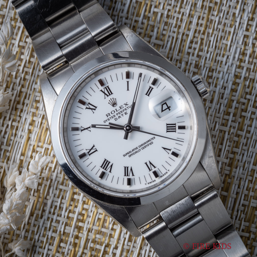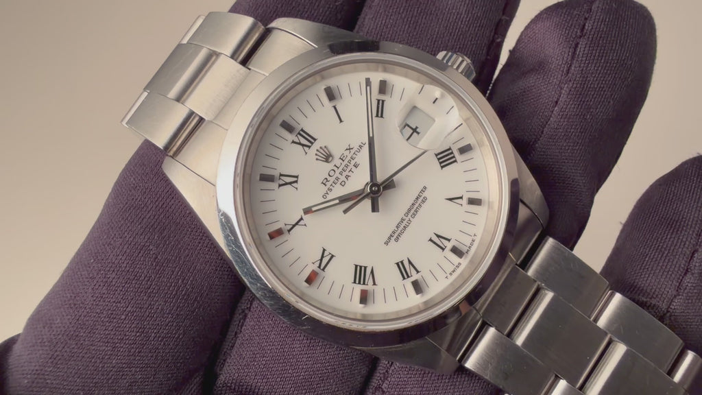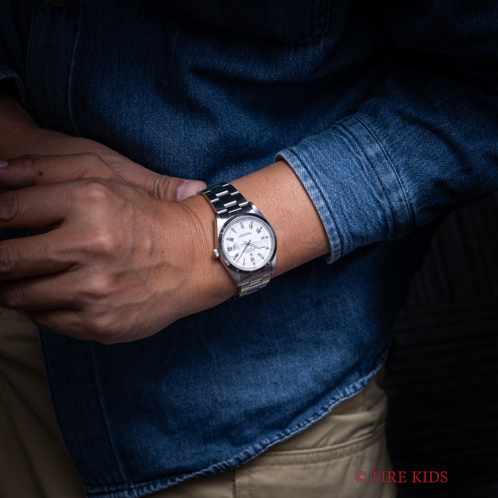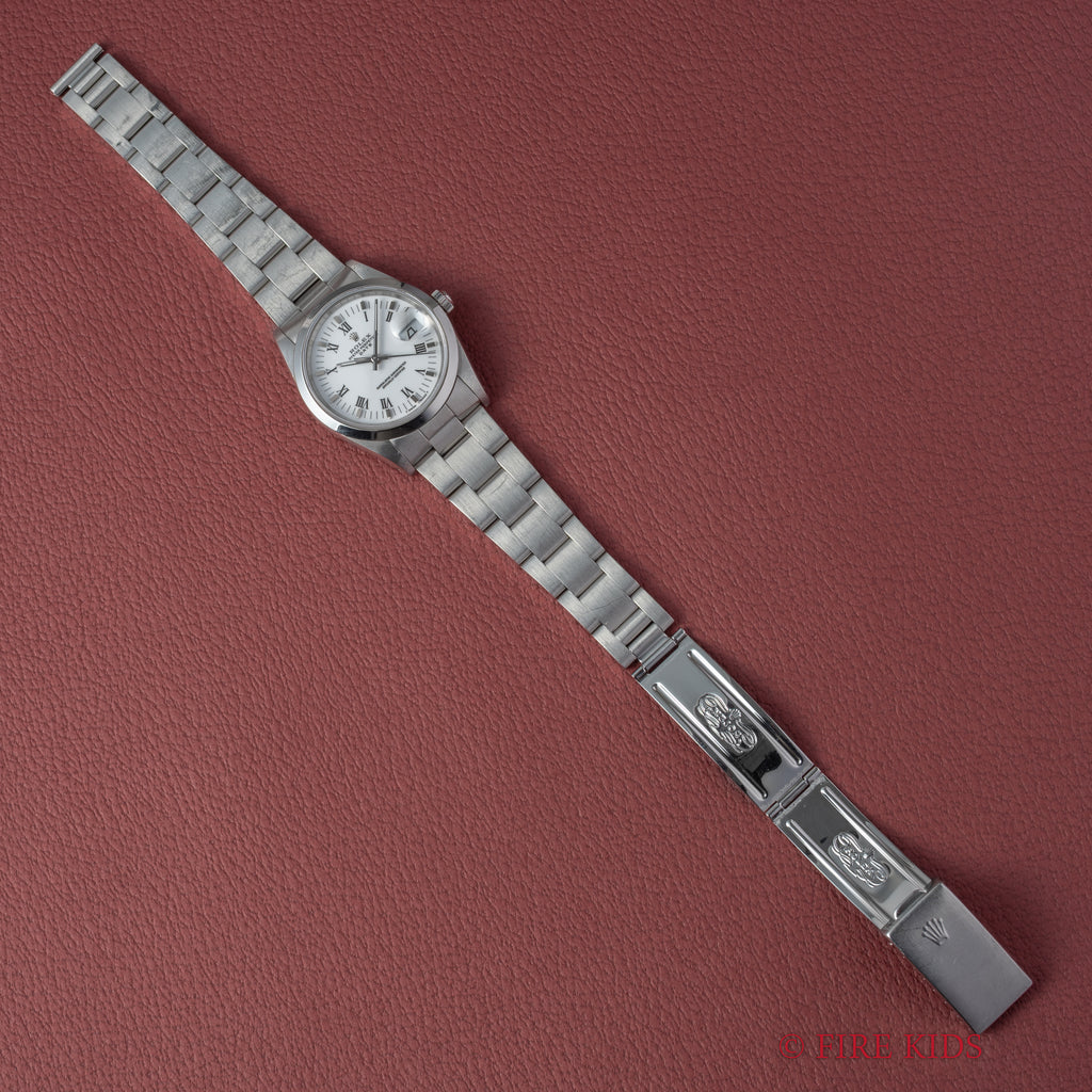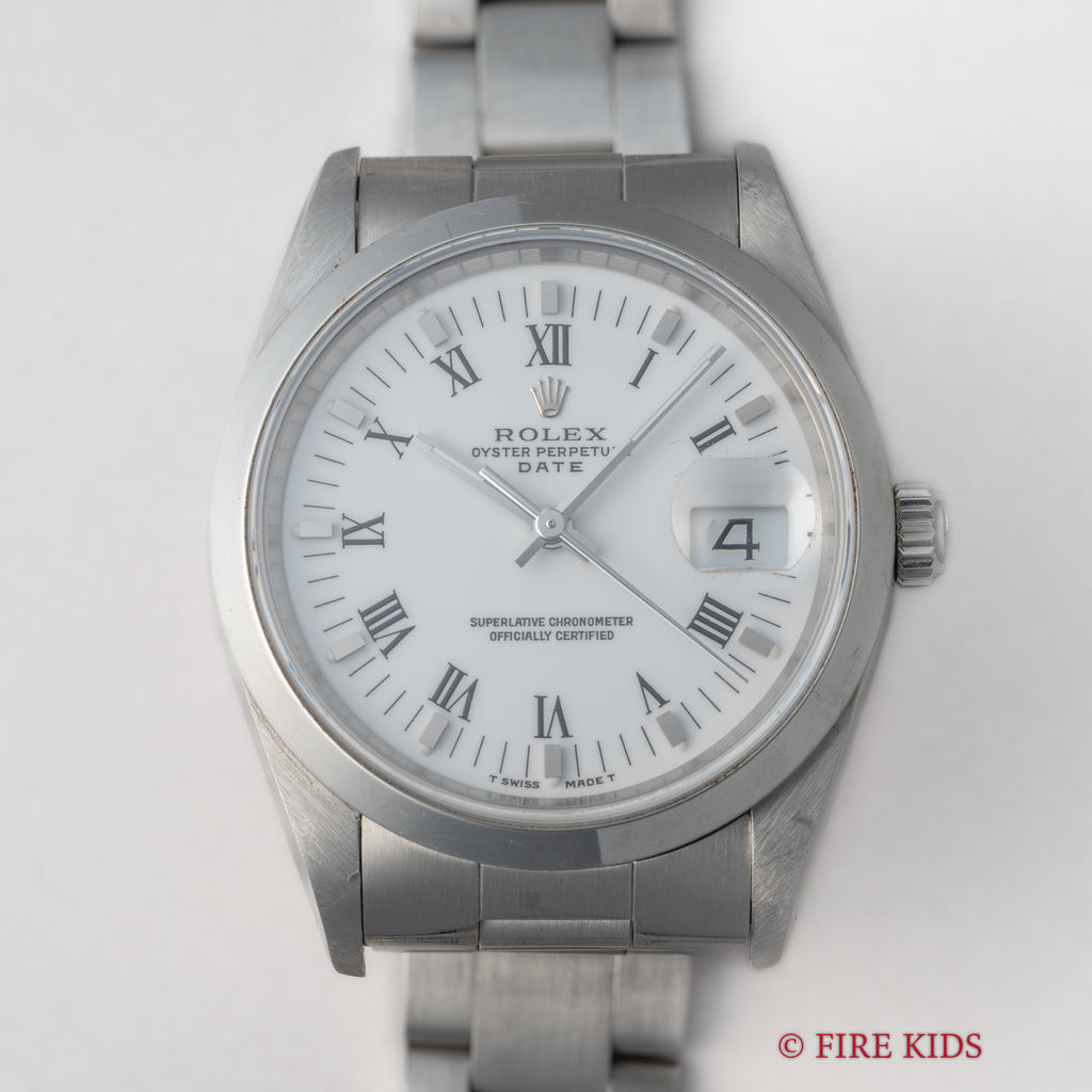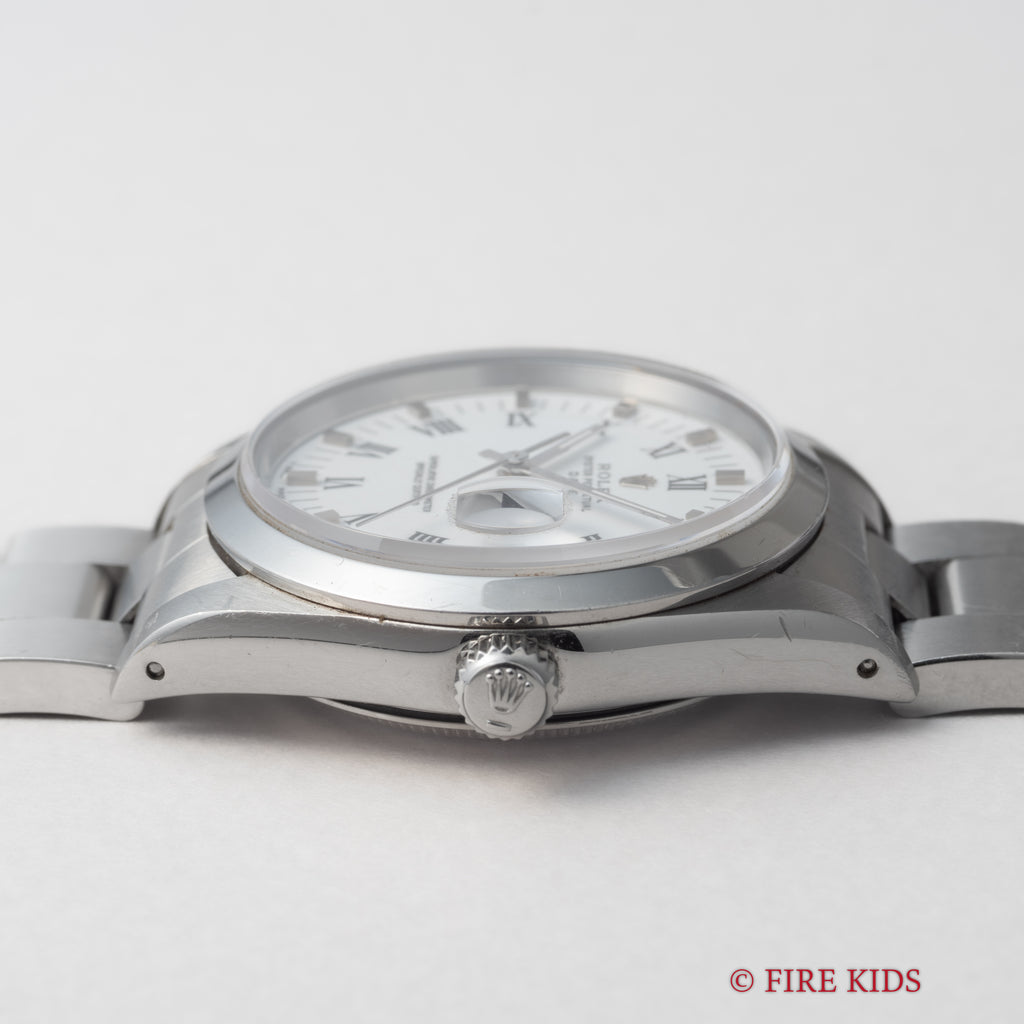 ロレックス 1989~1990年製 ホワイトローマンダイヤル オイスターパーペチュアルデイト Ref.15200 純正オイスターブレスの入荷になります。スッキリとしたスムースベゼルと人気のホワイトローマンダイヤル、メンズサイズとしてはやや小ぶりの34mmのケース径で使いやすいモデルです。ムーブメントは名機のCal.3135を搭載。ケースはとてもきれいな状態です。手巻きや針回し、ねじ込みリューズの操作はスムースです。純正オイスターブレスが取り付けられています。こちらはギャラ、タグが付属いたします。