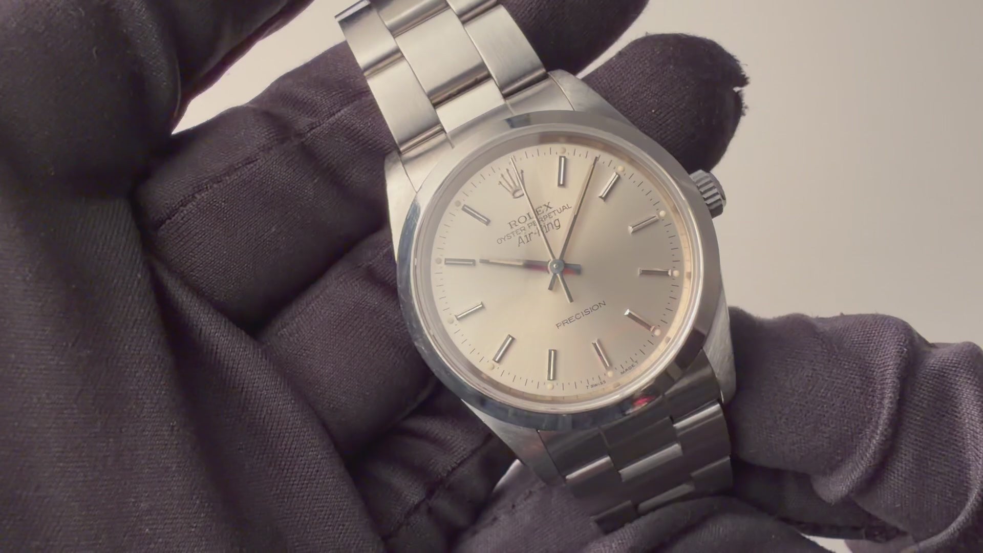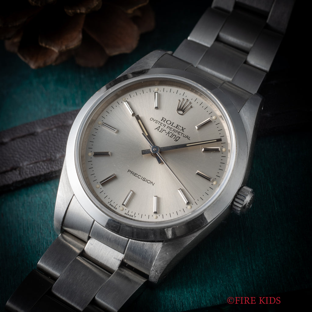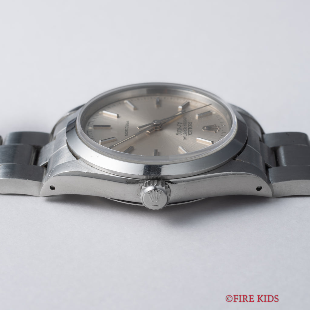 ロレックス エアキング 1991年製 Ref.14000 シルバーダイヤルです。ノンデイト自動巻きの日常使いし易い一本です。文字盤も変色無く綺麗です。ケースは小傷が見られますが大きなダメージはありません。手巻きや針回しの操作はスムースです。ブレスは純正3連オイスターブレスが装着されています。