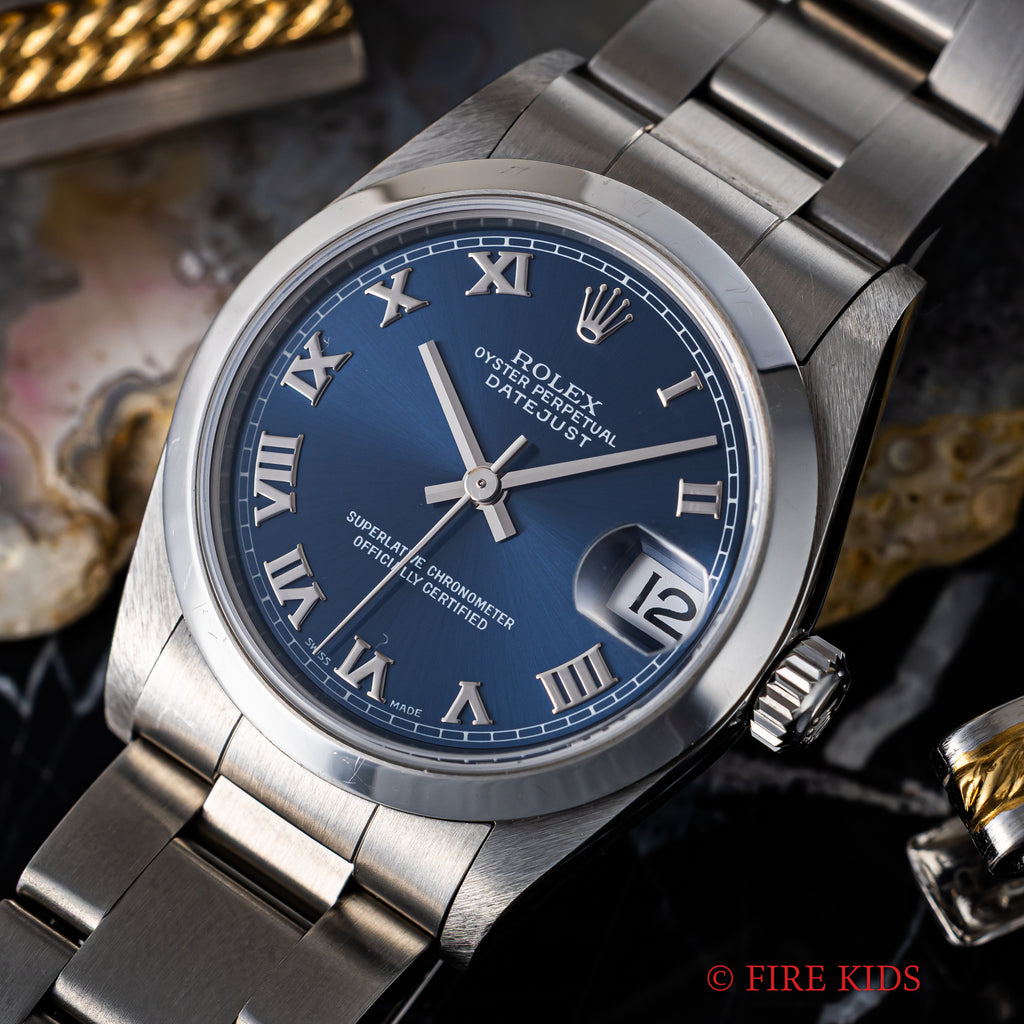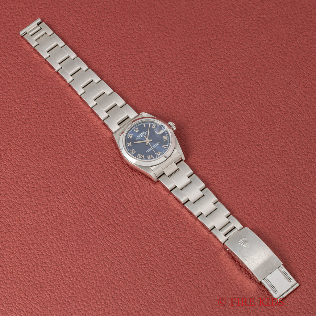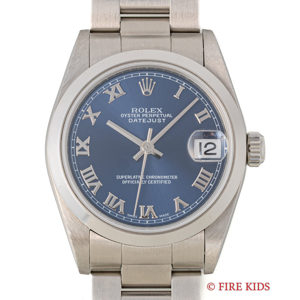 ロレックス デイトジャスト ユニセックスサイズ 2001年製 Ref.78240 ブルーローマンダイヤルです。珍しい31mm(リューズ別)サイズのデイトジャストでシンプルなスムースベゼル、3連オイスターブレスと上品な印象です。清潔感のあるブルーローマンダイヤルが魅力的になっています。文字盤、ケース、ブレス共に小傷等ありますが概ね綺麗な状態です。ブレスは純正オイスターブレスになっています。こちらは付属品としてギャラ、タグ、冊子が付きます。