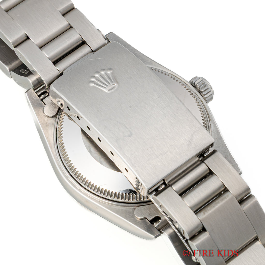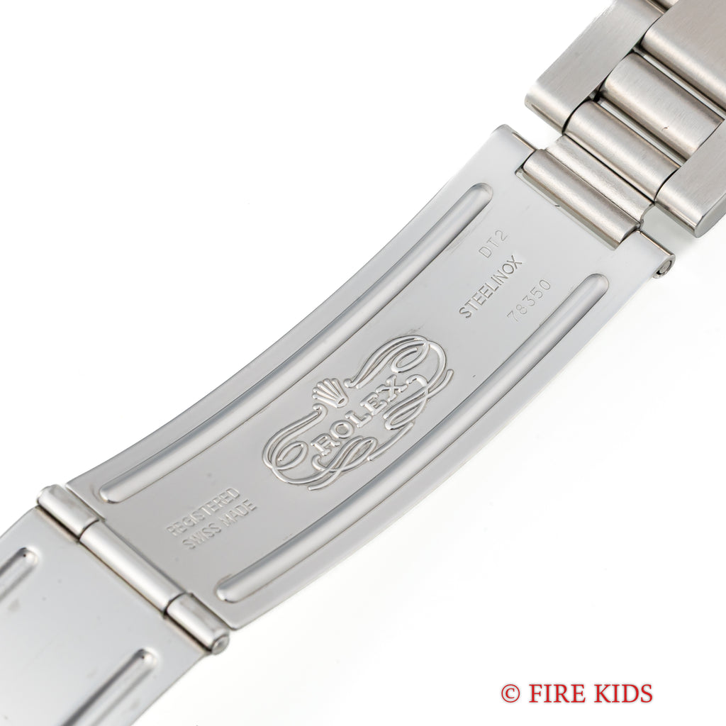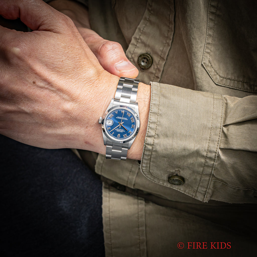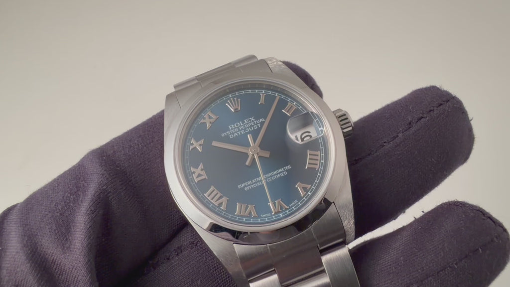 ロレックス デイトジャスト ユニセックスサイズ 2001年製 Ref.78240 ブルーローマンダイヤルです。珍しい31mm(リューズ別)サイズのデイトジャストでシンプルなスムースベゼル、3連オイスターブレスと上品な印象です。清潔感のあるブルーローマンダイヤルが魅力的になっています。文字盤、ケース、ブレス共に小傷等ありますが概ね綺麗な状態です。ブレスは純正オイスターブレスになっています。こちらは付属品としてギャラ、タグ、冊子が付きます。