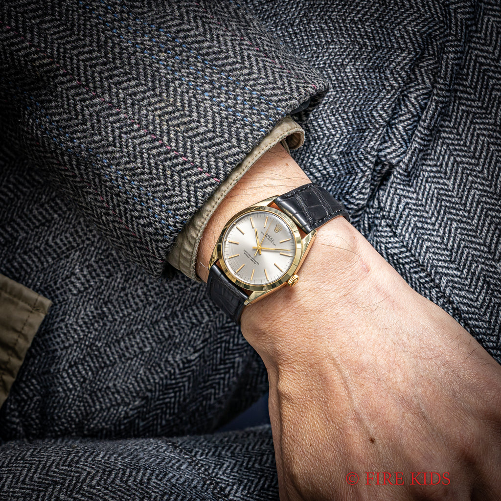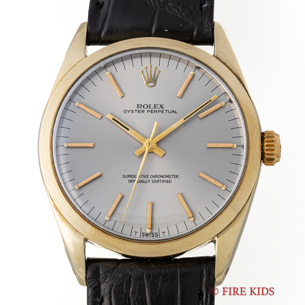 ロレックス オイスターパーペチュアル 1967年製 Ref.1024 金張りステンバックケース ノンデイトの入荷になります。シルバーグレーのダイヤルに金色の針、インデックス、金張りケースと非常にレアな組み合わせです。ケースは小傷はあるものの金張りの剥がれなどは見られません。手巻きや針回しはスムーズです。ムーブメントはロングセラーで安心感のあるCal.1570が搭載されています。ベルトはファイアーキッズオリジナルのクロコダイルを合わせています。