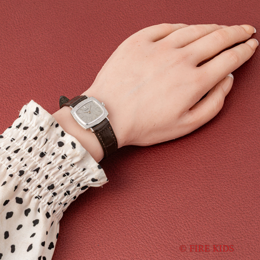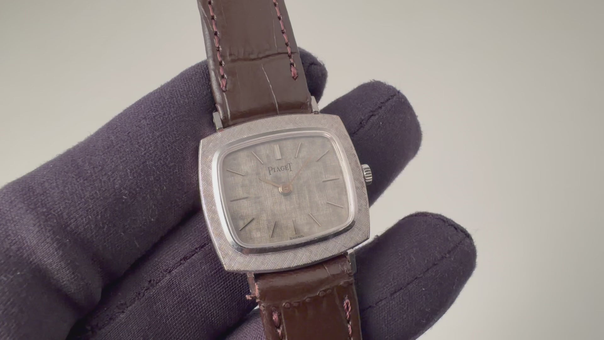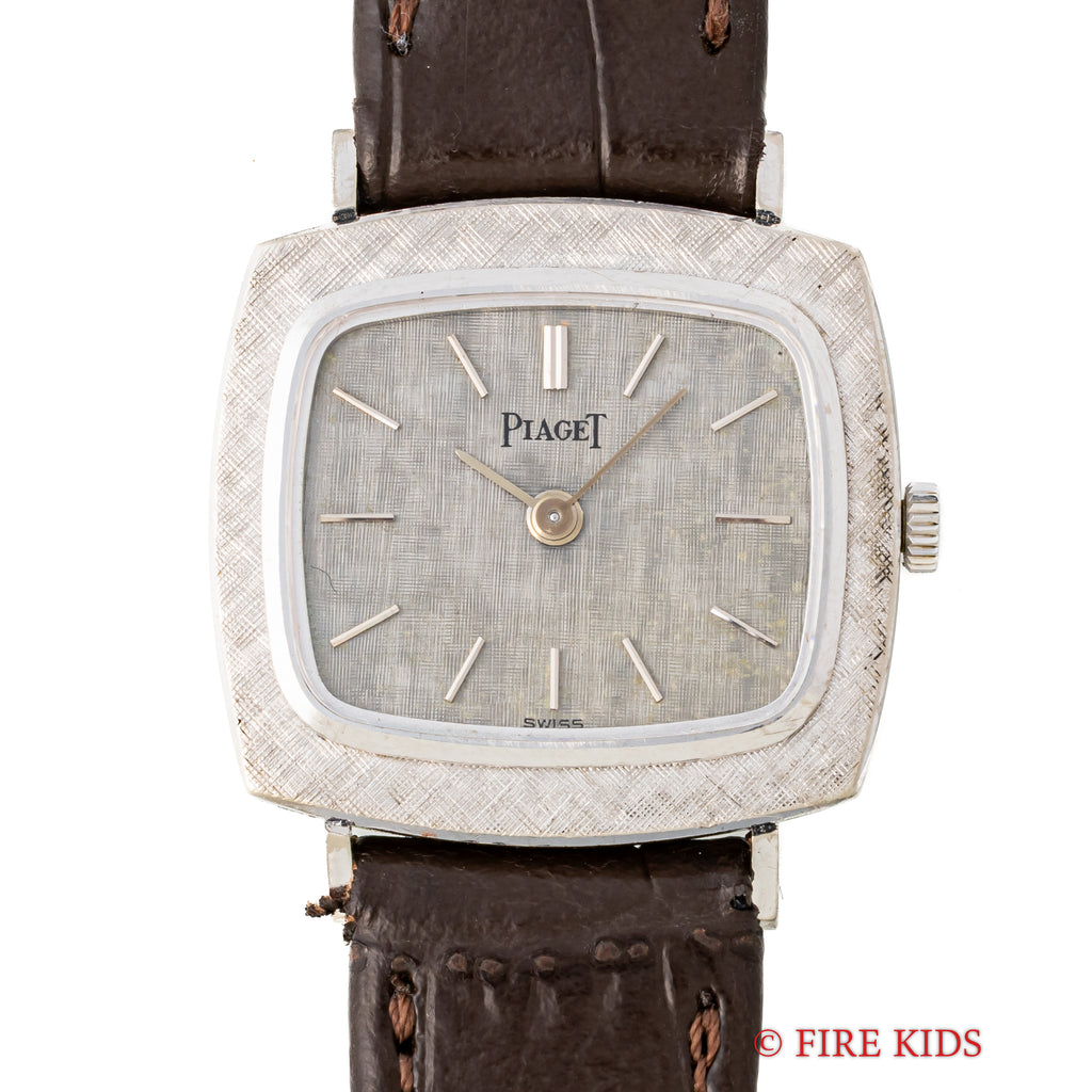 ピアジェ 18KWGクッションケース 1970年代製 レディースモデル 純正WG尾錠 手巻の入荷になります。文字盤、ケース共にリネン調の仕上げが施され18KWGケースを採用したラグジュアリーな要素が詰まっています。文字盤はシミ等無く綺麗です。ケースは小傷が見られますが大きなダメージはありません。手巻きや針回しの操作はスムースです。ベルトは社外の革ベルトに純正の18金無垢ホワイトゴールド尾錠が取り付けられています。