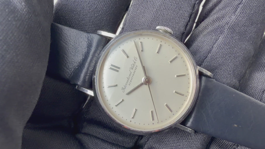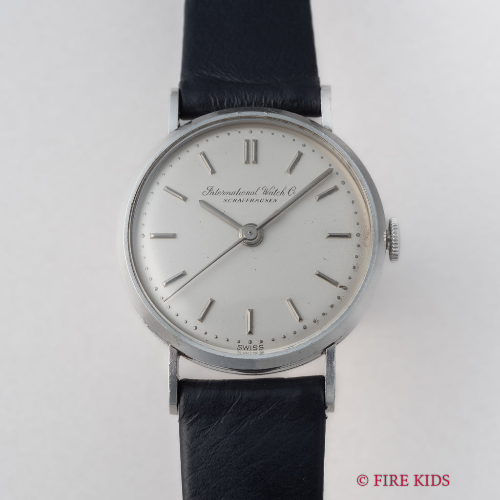 IWC ラウンドケース 1965年製 Cal.401です。当時としては最新の薄型高級ムーブメントCal.401を搭載したラウンドモデルです。ボーイズサイズで男女ともにお使い頂けるサイズ感です。ケースは小傷が見られますが大きなダメージはありません。社外の革ベルトを合わせています。箱付きです。