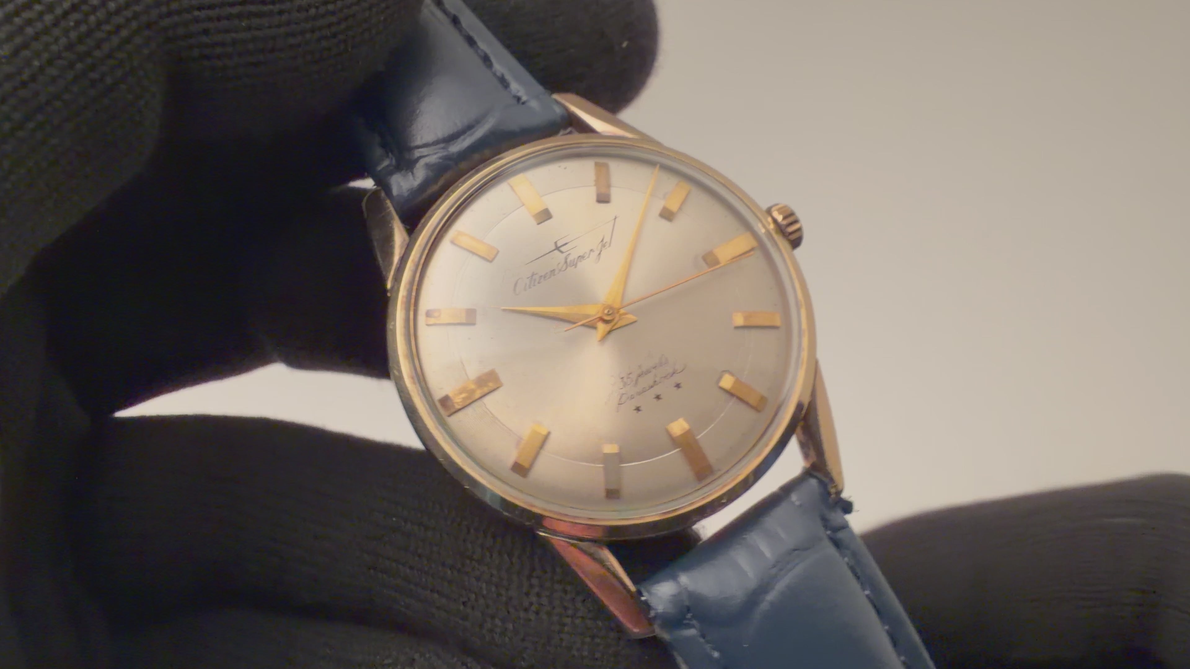 1963年製のシチズン、スーパージェット自動巻きモデルになります。ジェットの上位モデルでツートーンのダイヤルにゴールドのインデックスと針、80ミクロン14K金張りケースの高級感のあるデザインです。ムーブメントも35石の高級なムーブメントが搭載されております。ケースは小傷はございますが大きなダメージはございません。裏ブタに刻印が確認できます。当時は国産で最も薄い時計を目指して開発され、巻き上げ時に独特の音がするジェットローターは思わず耳を傾けたくなります。