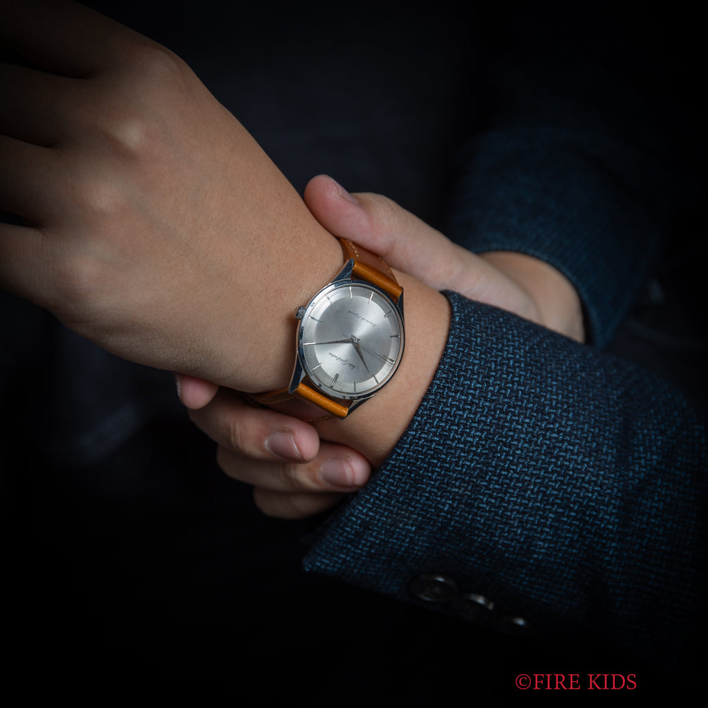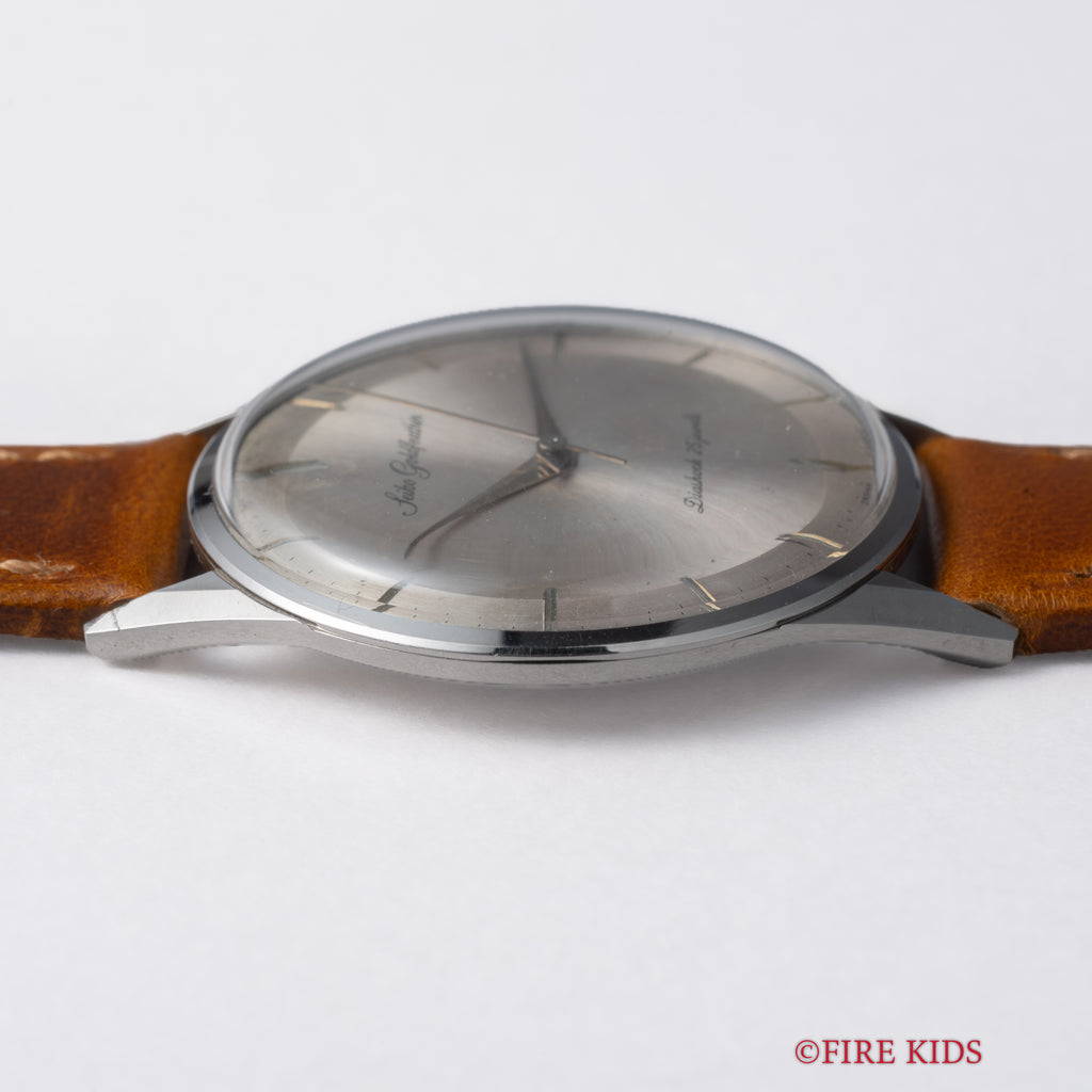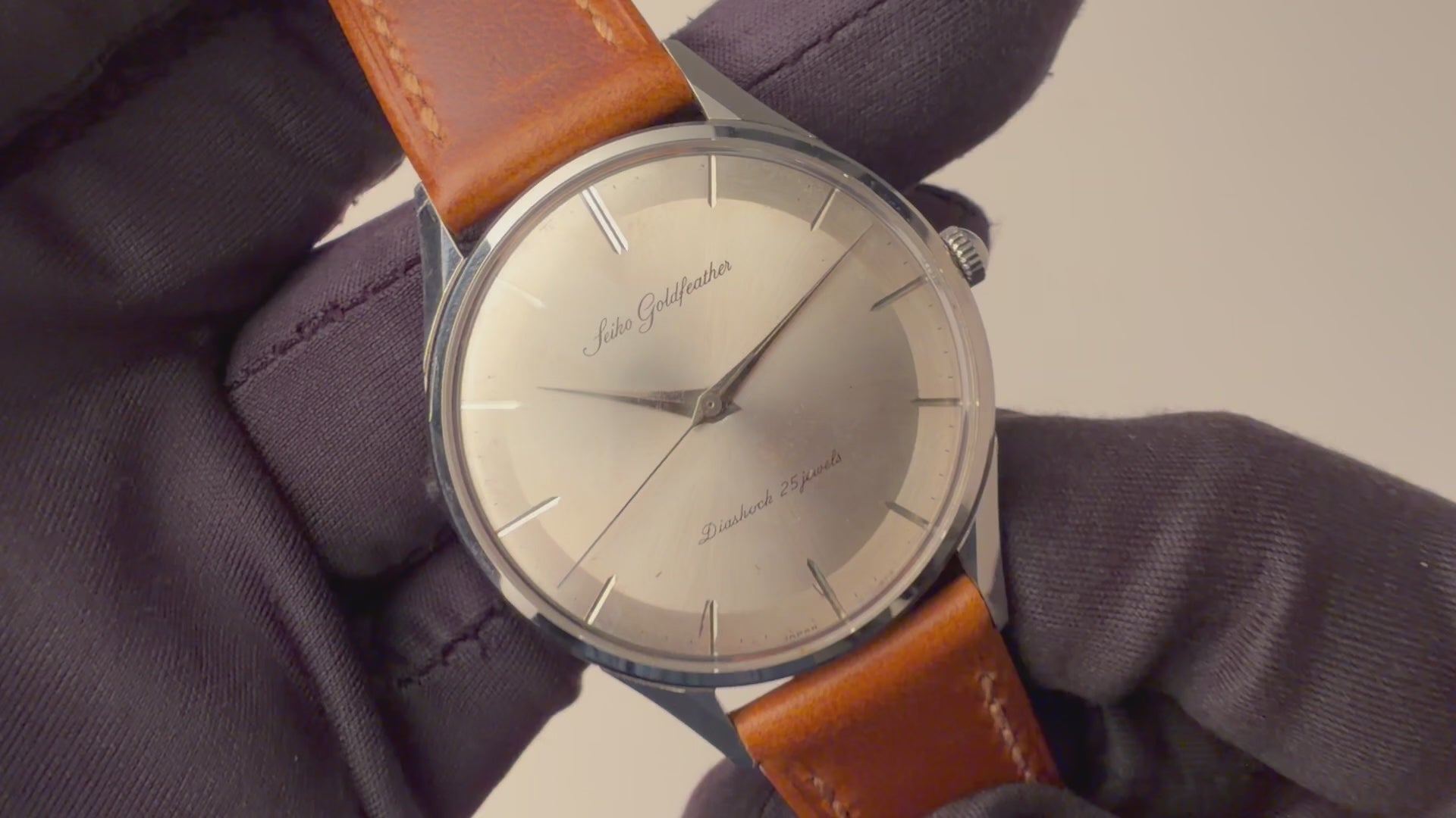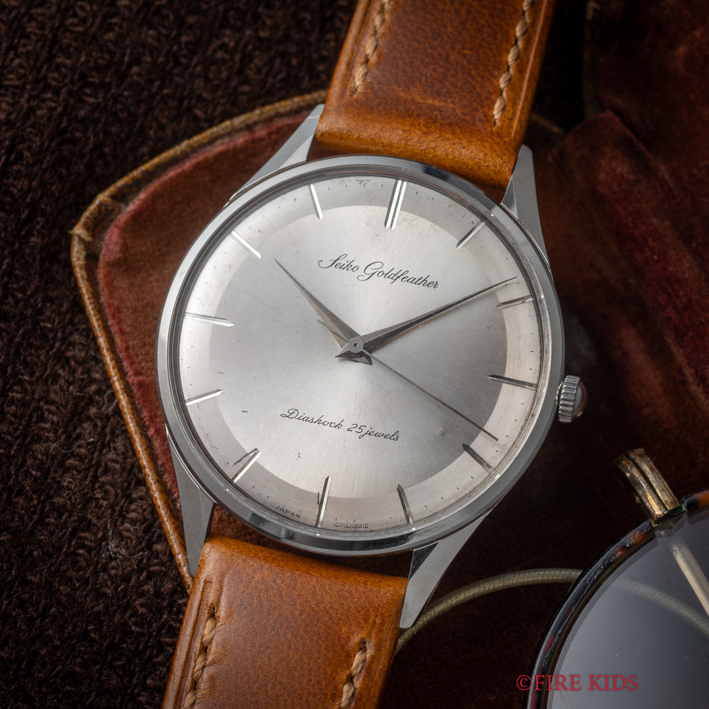 1961年製のセイコーゴールドフェザー 手巻きモデルです。当時、センターセコンド(中三針)でありながら薄型(約9mm)を目指して開発された時計。ノンデイトのシンプルな手巻きモデルで扱いやすく厚みも抑えられているのでスーツなどフォーマルな服装と良く似合います。シルバーの文字盤はツートンになっており、多少ダメージが確認できますが年代と雰囲気を考慮すると良好な状態です。ムーブメントは手巻きの機械が搭載されています。ベルトは社外の革ベルトを合わせています。
