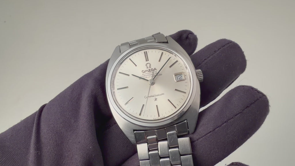 オメガ コンステレーション ジェンタデザイン前期型 1967年製 Ref.168.017 純正ブレスの入荷になります。コンステレーションの中でも世界最高の時計デザイナーといわれるジェラルド・ジェンタがデザインをしたモデルです。文字盤は夜光の入らないスッキリとしたデザインです。ケースは小傷が見られますが大きなダメージはありません。ムーブメントはクロノメーターのCal.564を搭載。手巻きや針回し操作もスムースです。ベルトは純正の5連ステンレスブレスが取り付けられています。