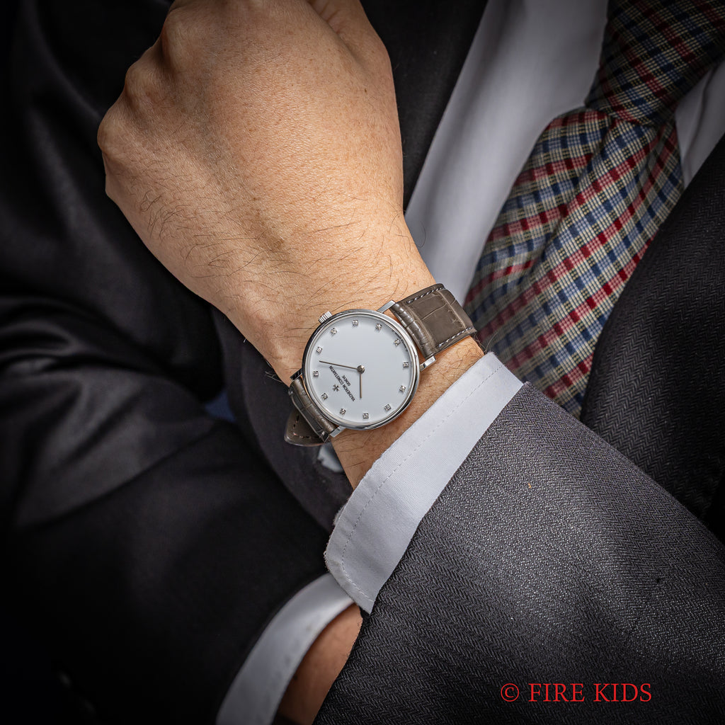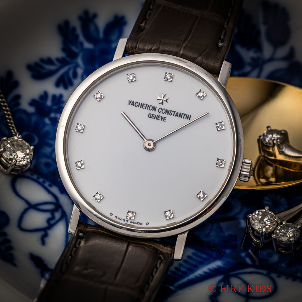 ヴァシュロン・コンスタンタン エッセンシャル 1990年代製 Ref.31039 18金ホワイトゴールド 12Pダイヤ 純正尾錠 ギャラ付の入荷になります。薄型手巻の本格派のドレスウォッチです。文字盤はシミ、ひび割れ等無く綺麗です。ケースは小傷が見られますが大きなダメージはありません。手巻きや針回しの操作はスムースです。ベルトはファイアーキッズオリジナルのクロコダイル革ベルトに純正金無垢尾錠が取り付けられています。中古のオリジナルベルト、ギャランティカードが付属します。