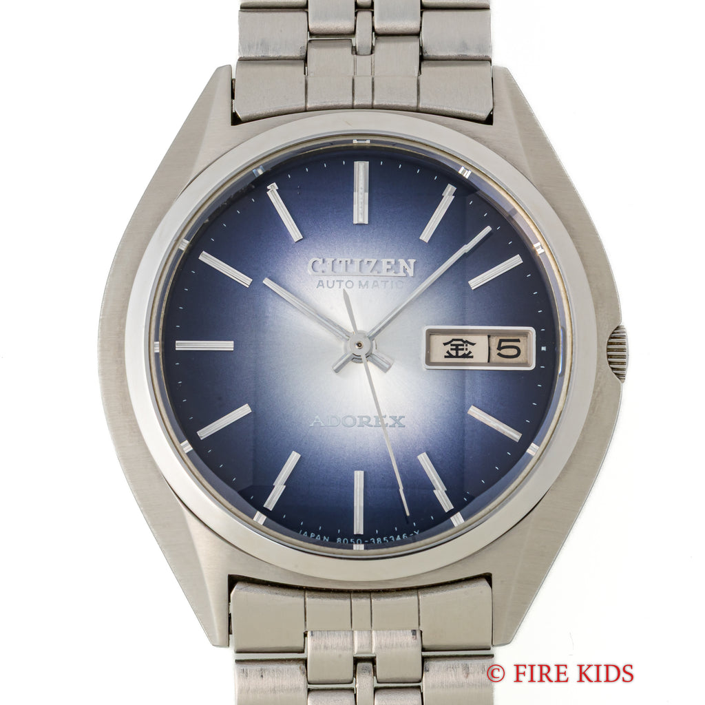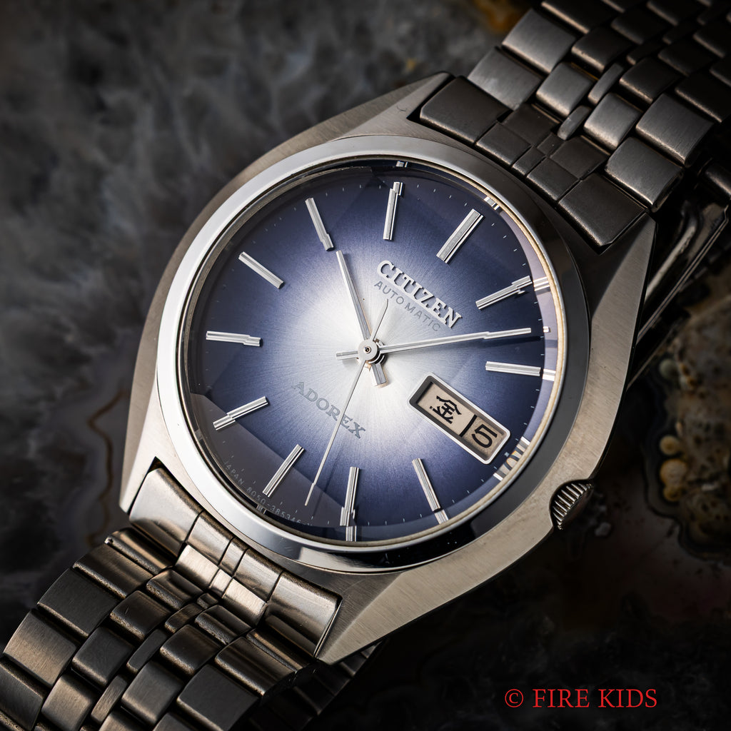 シチズン アドレックス Ref.4-385195TA 1975年製 ブルーグラデーションです。70年代らしいカットガラス、グラデーションダイヤルにデイデイト表示、自動巻きと実用性とユニークさを兼ね備えたモデルです。大きなダメージはなく良好なコンディションです。純正ブレス付きです。