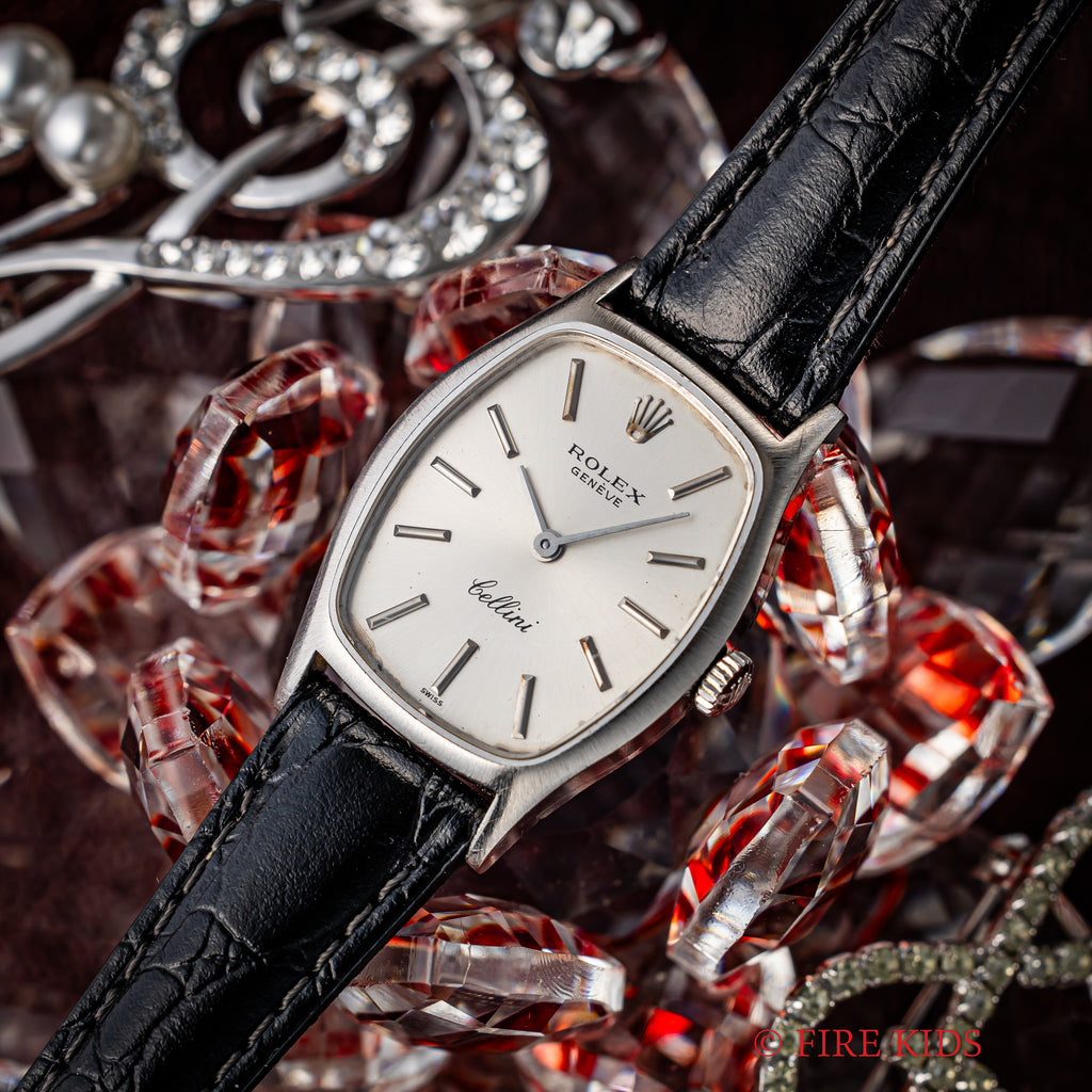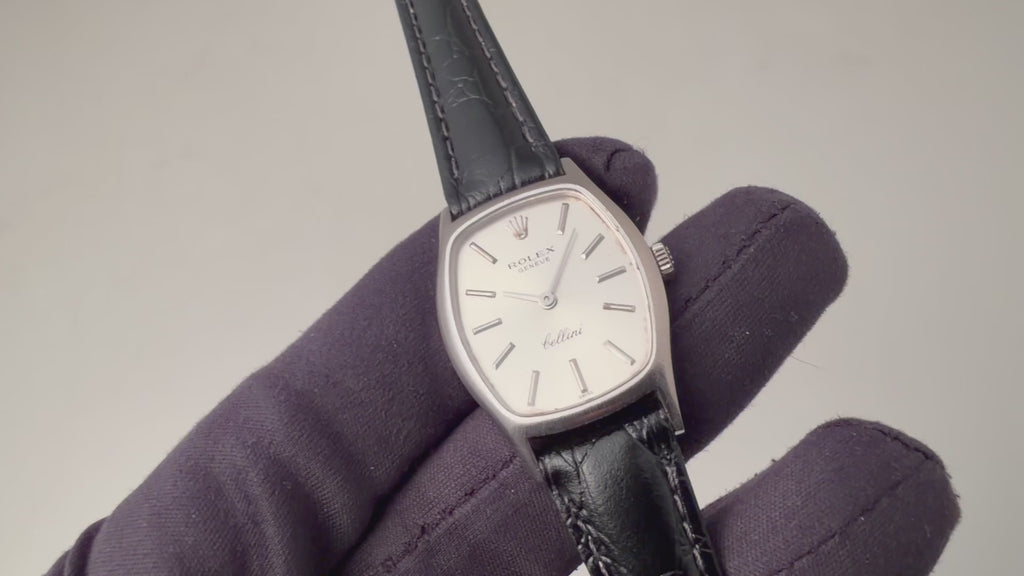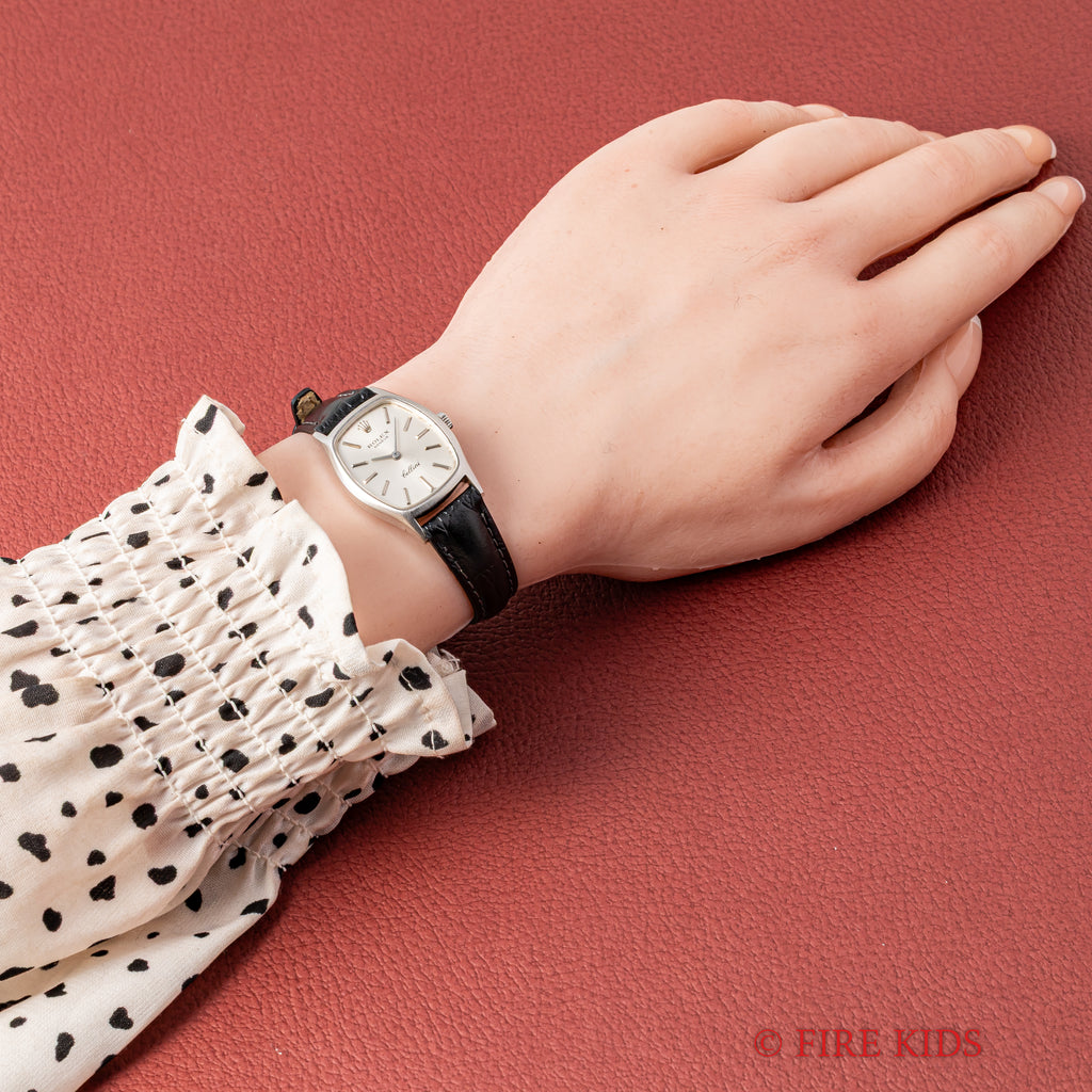 ロレックス レディースチェリーニ 1968年製 Ref.3803 18金無垢 ホワイトゴールドの入荷になります。ルネサンス期のイタリア人芸術家ベンベヌト・チェリーニの名から着想を得ているシリーズです。デイトジャストやスポーツ系のイメージが強いロレックスの中でノンデイト、二針のバーインデックス、フィット感も良く上品な一本です。ダイヤルはドレスウォッチ特有のダメージが端に見られますが中心部はキレイな状態です。ケースは小傷が見られますが大きなダメージはありません。手巻きや針回しの操作はスムースです。社外の革ベルトが取り付けられています。