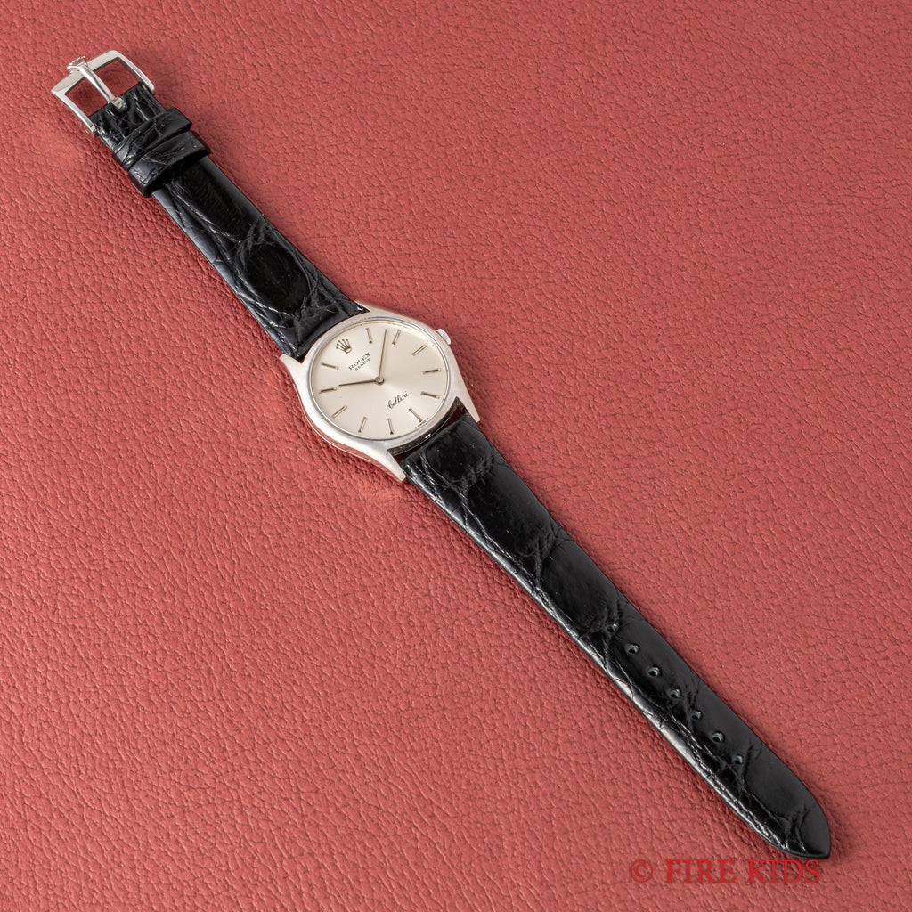 ロレックス チェリーニ 1973年製 18金無垢ケース Ref.3804 手巻 Cal.1600 の入荷になります。18金無垢ケースにシルバーダイヤルで幅約31.5㎜(リューズ別)厚さ約5㎜と上品なサイズ感です。ケースは小傷が見られますが大きなダメージは無く良い状態です。手巻きや針回しの操作はスムースです。ベルトは社外のクロコダイル革ベルトにステンレス製の純正尾錠が取り付けられています。