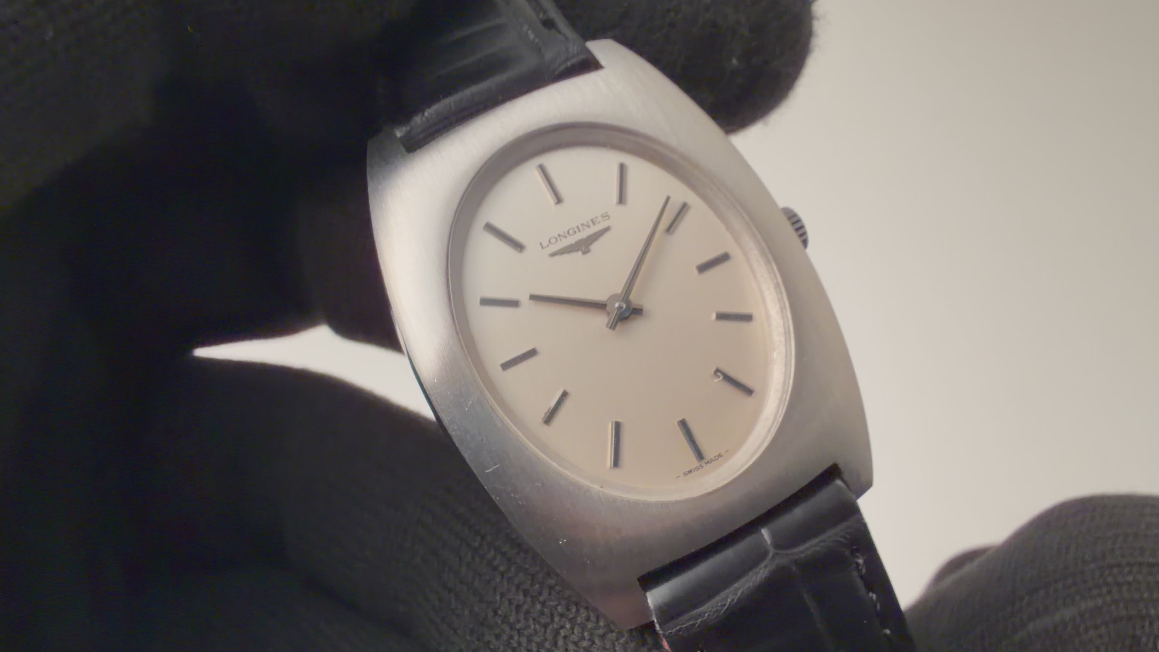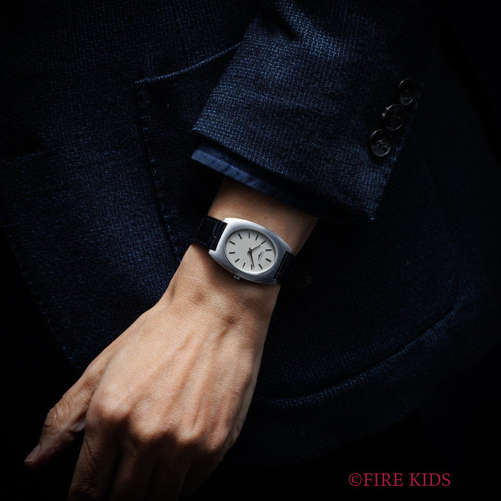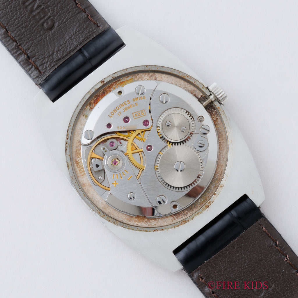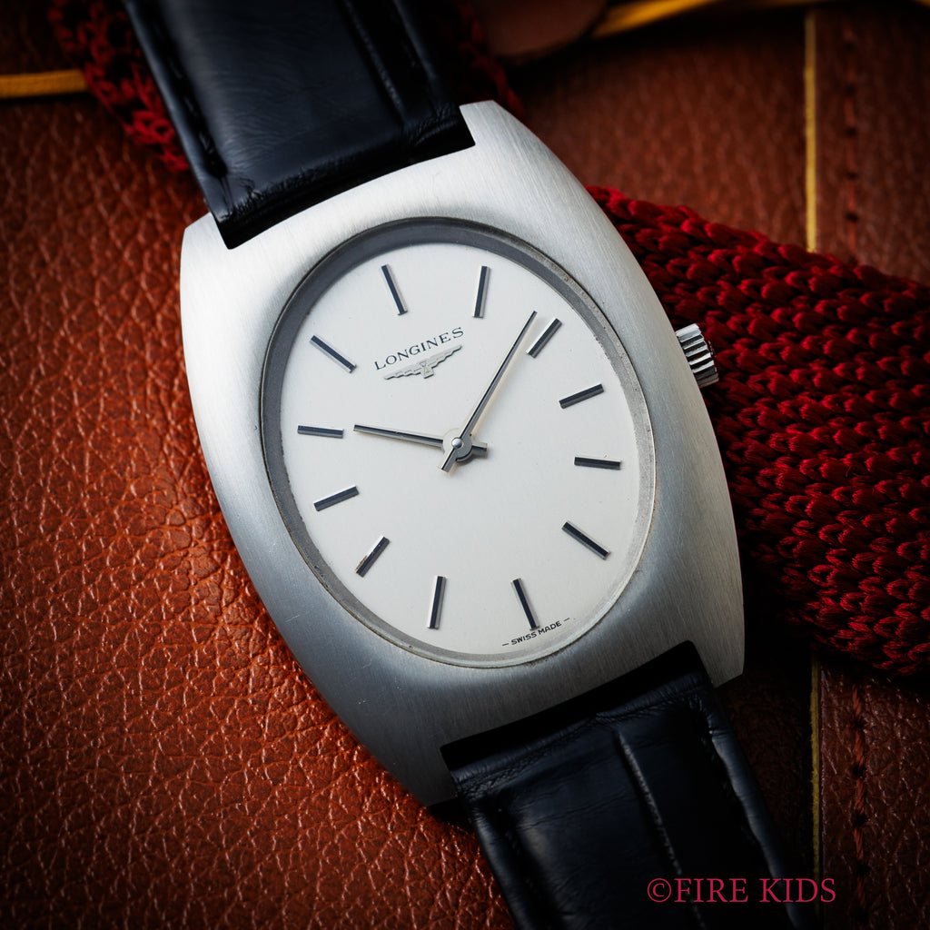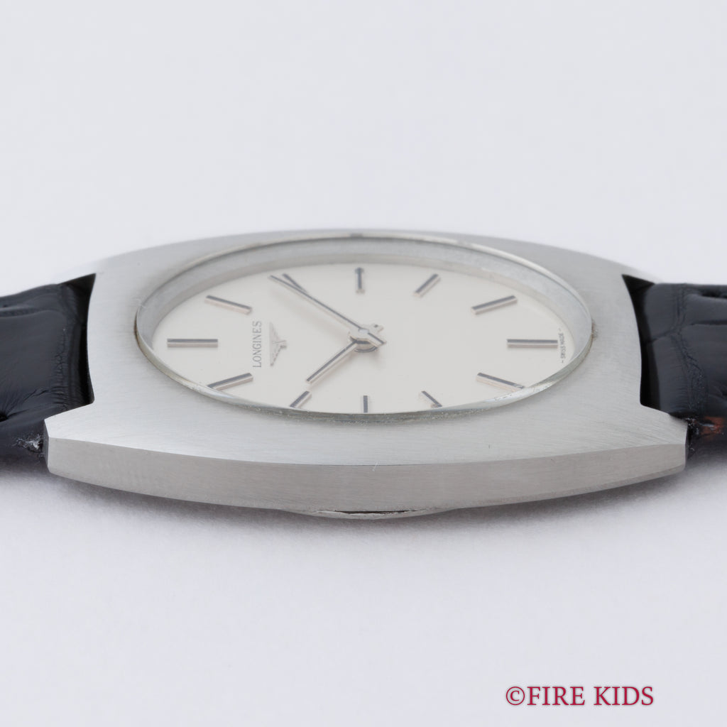 ロンジン トノーケース 1973年製 Cal.428 手巻きです。厚さ2.5mmの薄型手巻きCal.428を搭載した一本。トノーシェイプが当時の年代を感じさせるユニークで良い雰囲気です。文字盤は肉眼で綺麗なコンディションで、ケースも小傷程度です。ファイアーキッズオリジナルのクロコダイル革ベルトを合わせています。