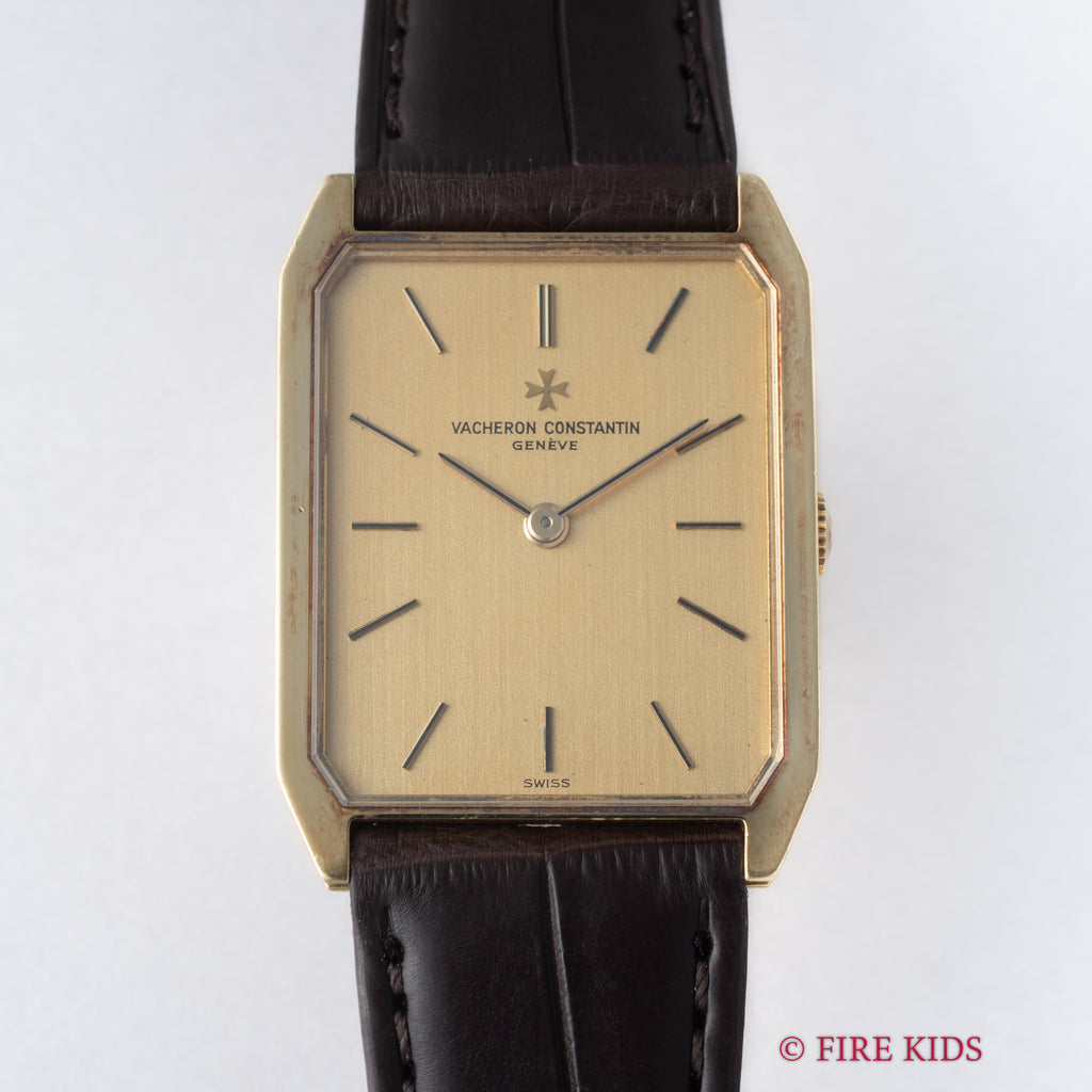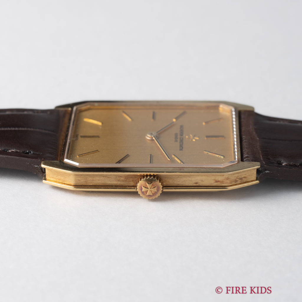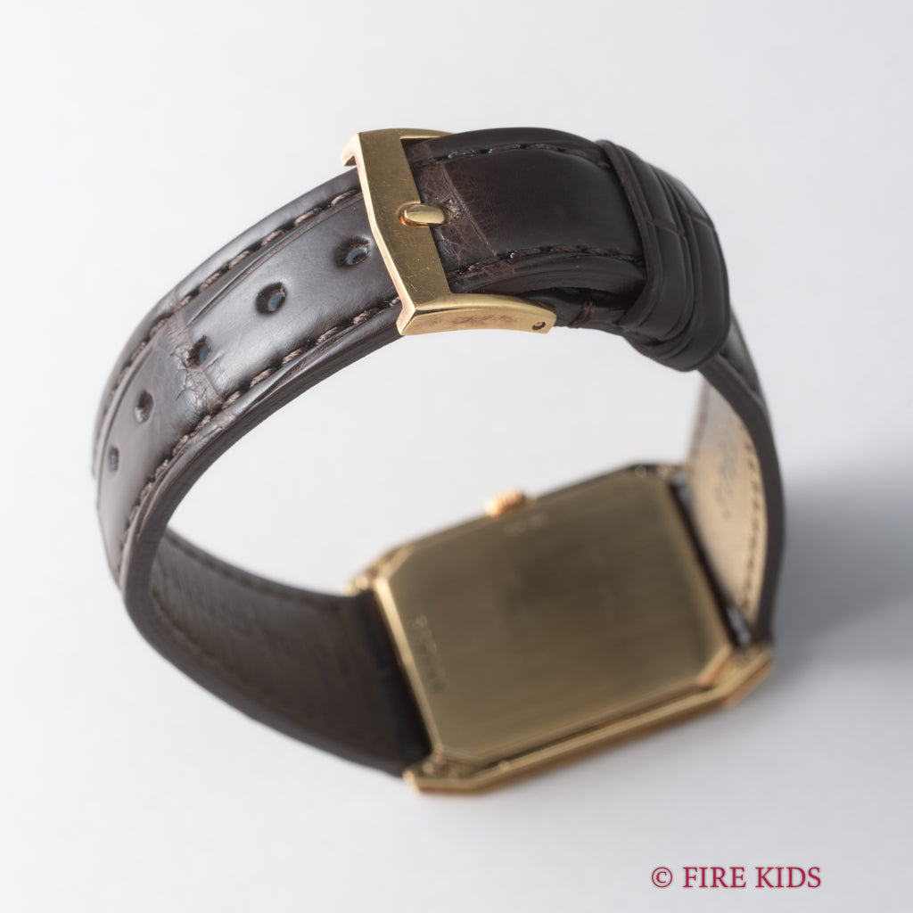 ヴァシュロンコンスタンタン スクエア 1980年代製 18金イエローゴールド Ref.39201 Cal.1015 純正18金尾錠付です。スクエア型の18金イエローゴールドケースにジャガールクルトCal.895ベースの薄型手巻きキャリバーを搭載した一本です。個性あるドレスウォッチをお探しの方にお勧めしたいです。ファイアーキッズオリジナルのクロコダイル革ベルトに純正18金イエローゴールド尾錠を合わせています。