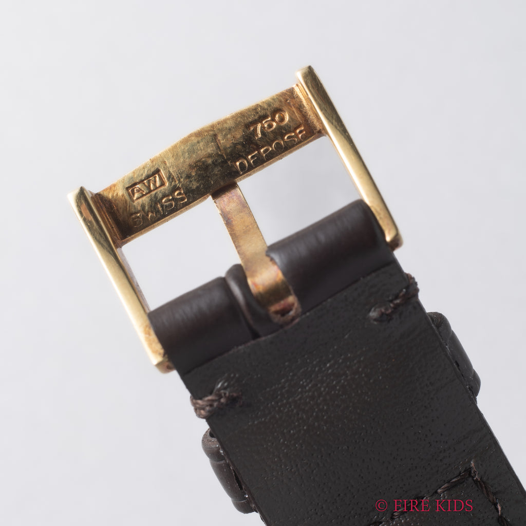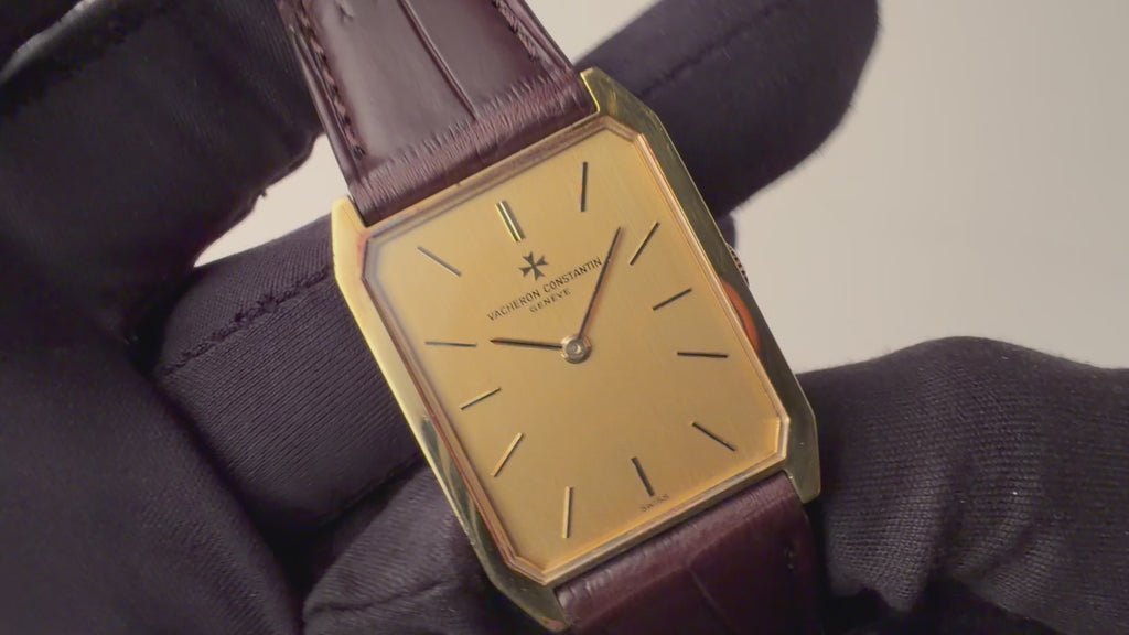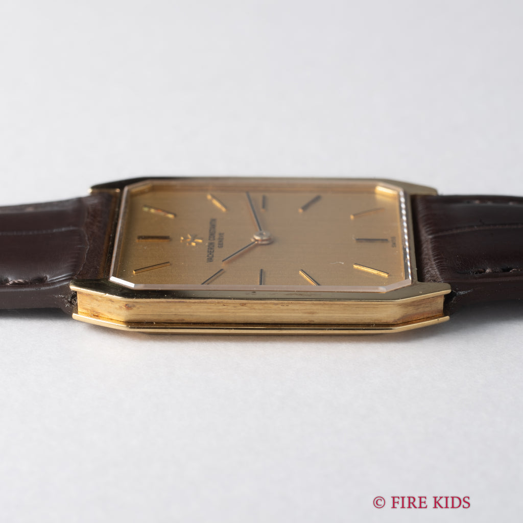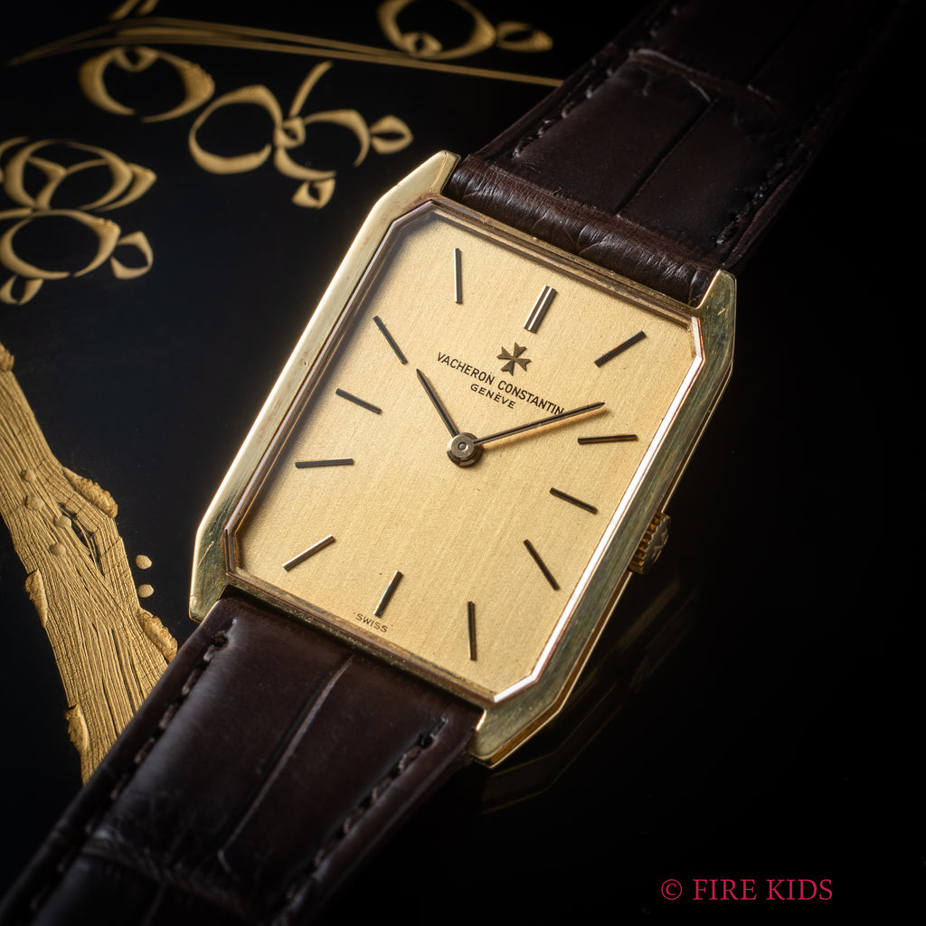 ヴァシュロンコンスタンタン スクエア 1980年代製 18金イエローゴールド Ref.39201 Cal.1015 純正18金尾錠付です。スクエア型の18金イエローゴールドケースにジャガールクルトCal.895ベースの薄型手巻きキャリバーを搭載した一本です。個性あるドレスウォッチをお探しの方にお勧めしたいです。ファイアーキッズオリジナルのクロコダイル革ベルトに純正18金イエローゴールド尾錠を合わせています。