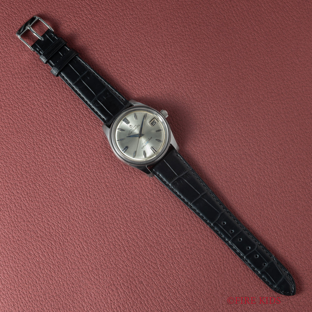 シチズン オートデーターユニ Ref.AU140801 自動巻き パラウォーターです。防水スナップケース通称パラウォーターです。厚みがあってどっしりとしていて良い感じです。三針、デイト付き、自動巻きと実用性にも優れています。楔型のインデックスと尖った針もカッコいいです。ファイアーキッズオリジナルのクロコダイル革ベルトを合わせています。