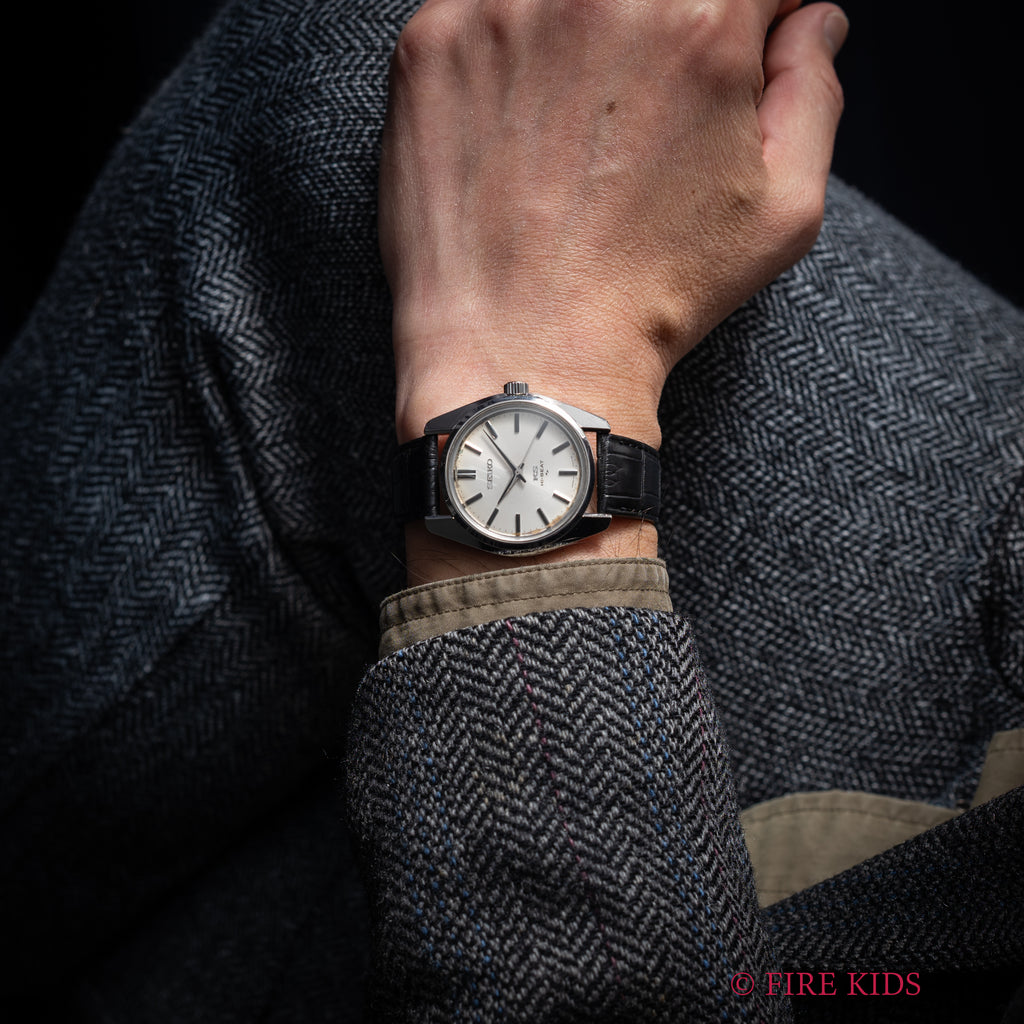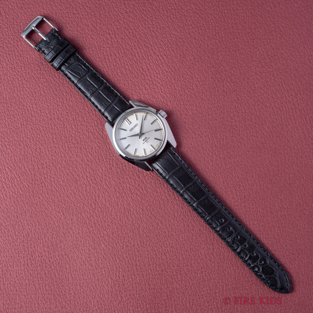 1969年製の45キングセイコーです。亀戸セイコー製、セイコースタイルのケースにノンデイトの使いやすいモデルです。ムーブメントはハイビート10振動手巻きのCal.4500Aを搭載。ケースは小傷はございますが大きなダメージはございません。メダリオンも健在です。手巻きや針回しの操作はスムーズです。ベルトはファイアーキッズオリジナルのクロコダイル革ベルトが取り付けてあります。