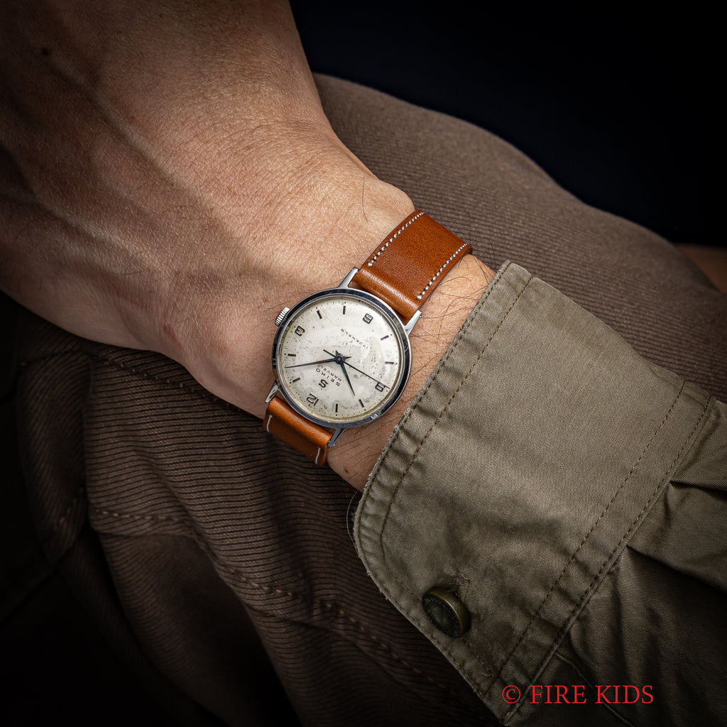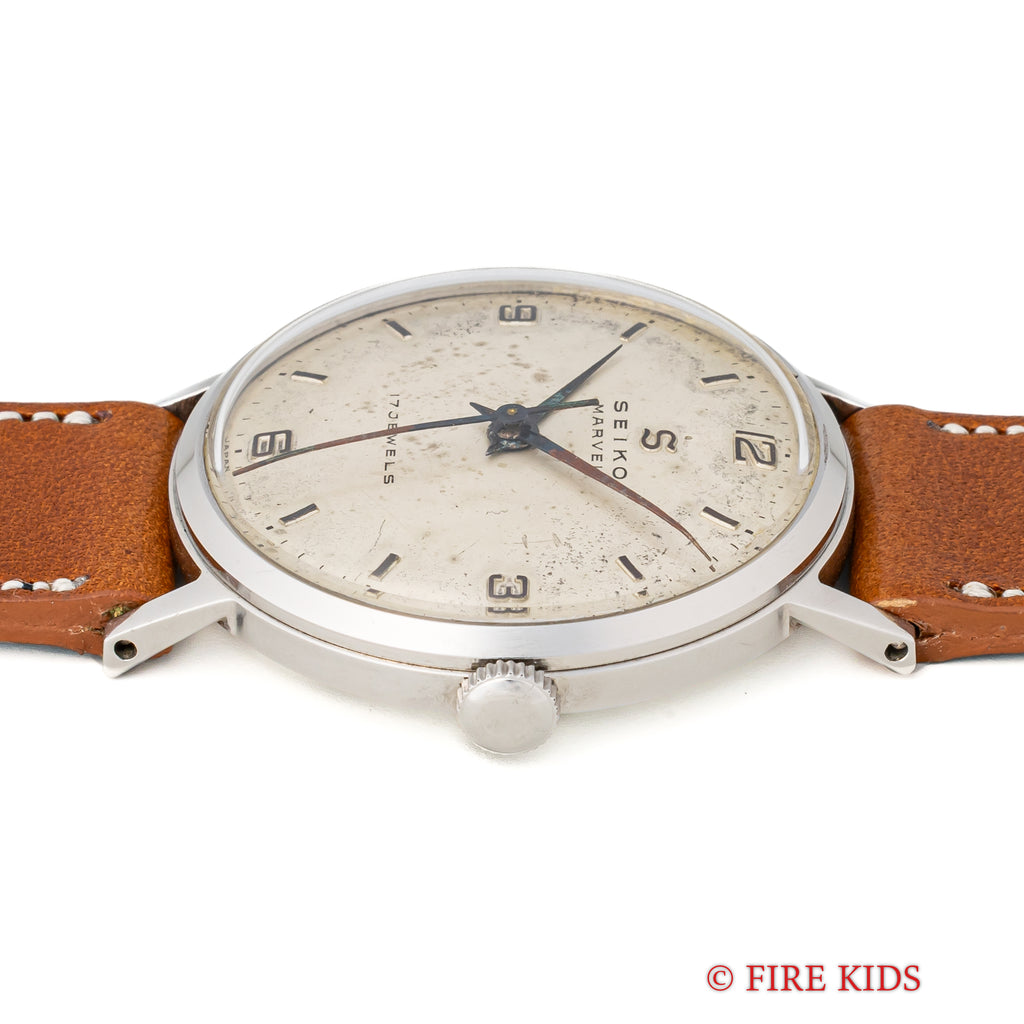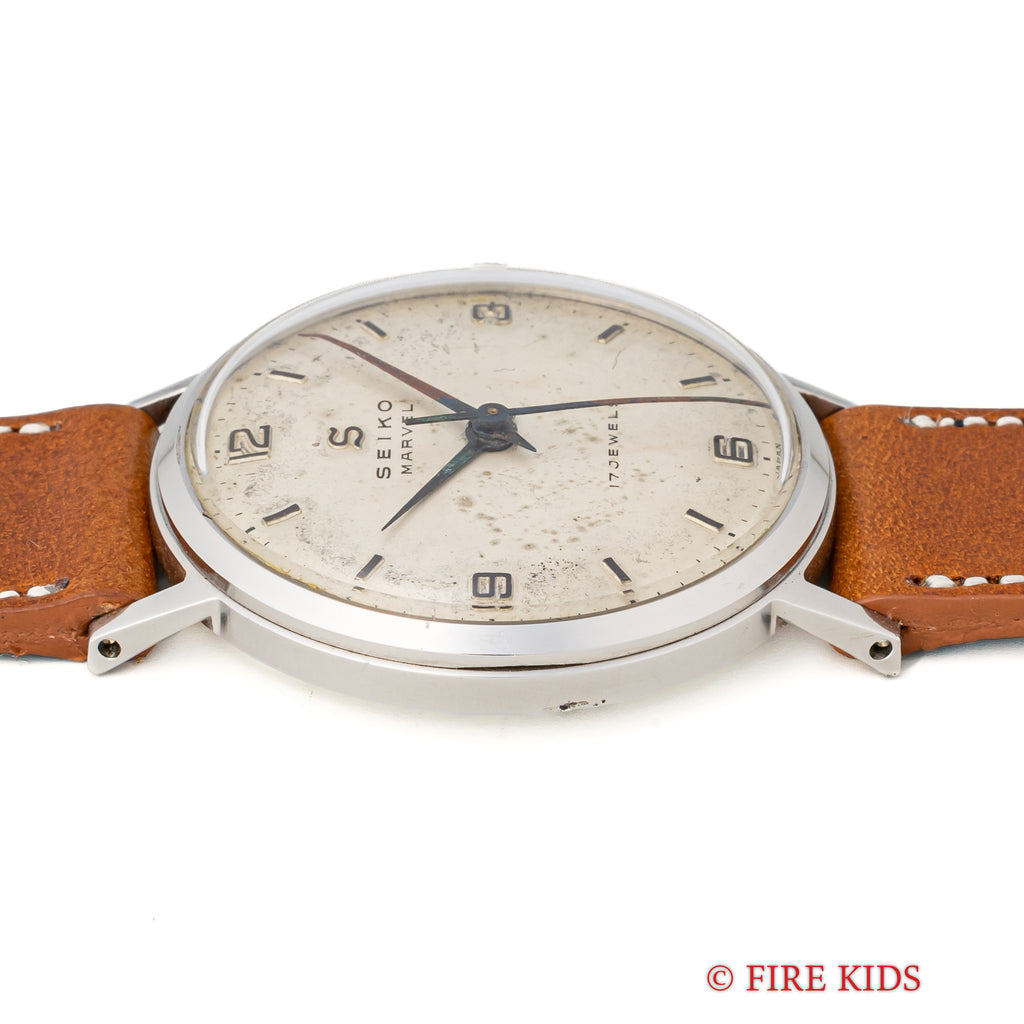 セイコー Ref.13048 マーベル 1950年代製 手巻きです。言わずと知れたセイコーの名機マーベルです。3,6,9,12アラビアで経年を遂げた良い雰囲気です。ケースは年代なりの小傷、腐食はあります。ファイアーキッズオリジナルのブッテーロカーフレザーを合わせています。