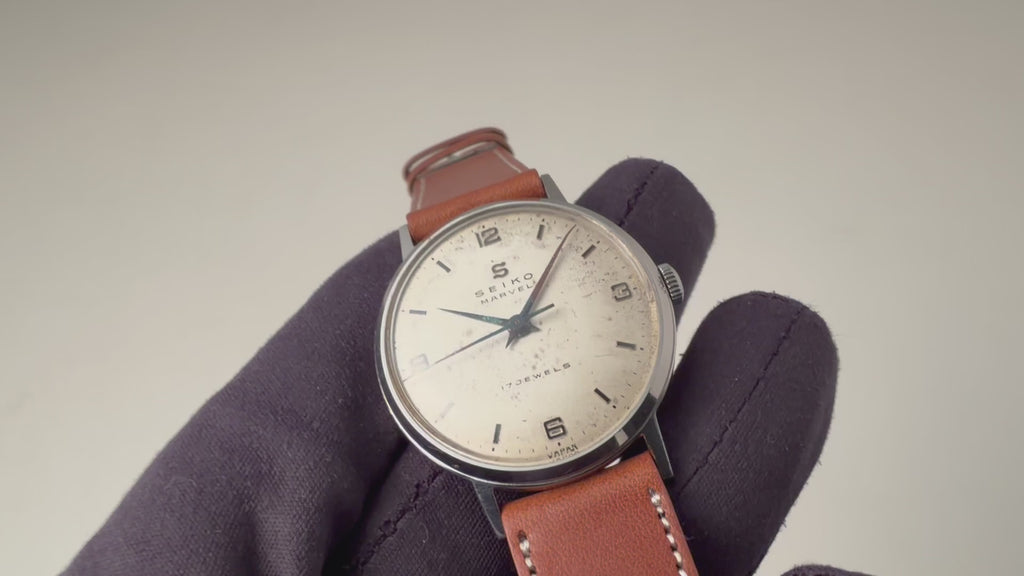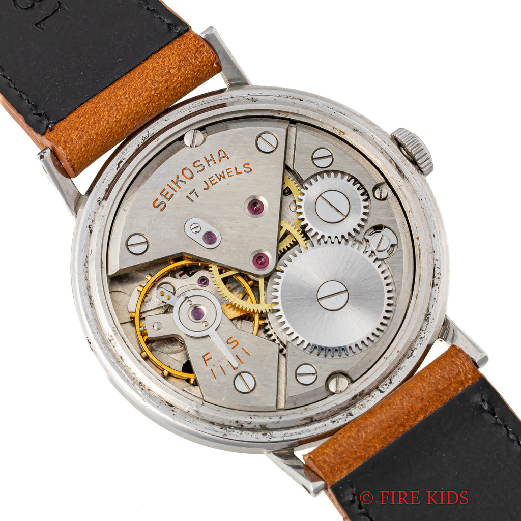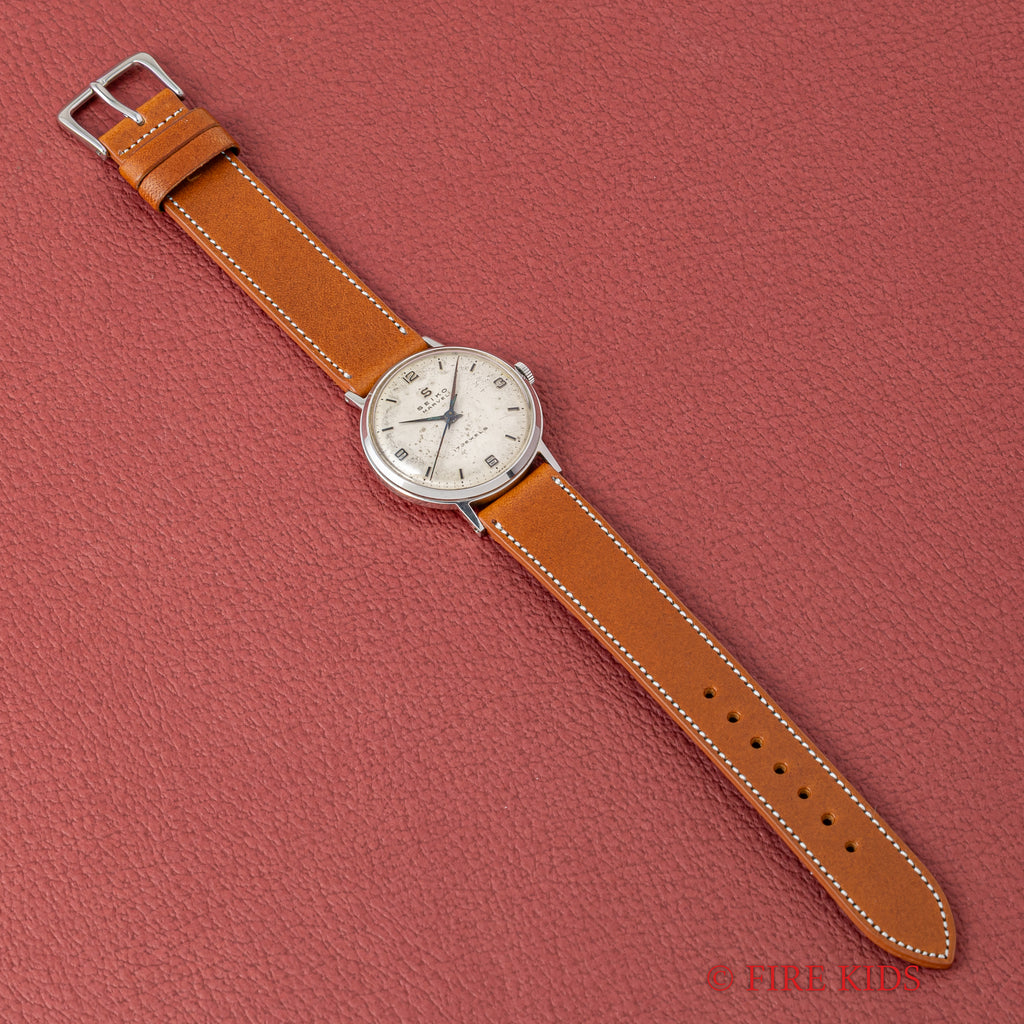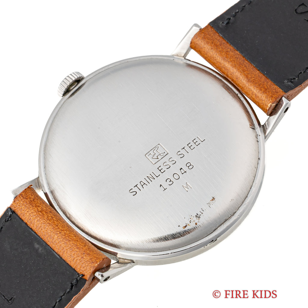 セイコー Ref.13048 マーベル 1950年代製 手巻きです。言わずと知れたセイコーの名機マーベルです。3,6,9,12アラビアで経年を遂げた良い雰囲気です。ケースは年代なりの小傷、腐食はあります。ファイアーキッズオリジナルのブッテーロカーフレザーを合わせています。