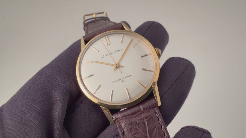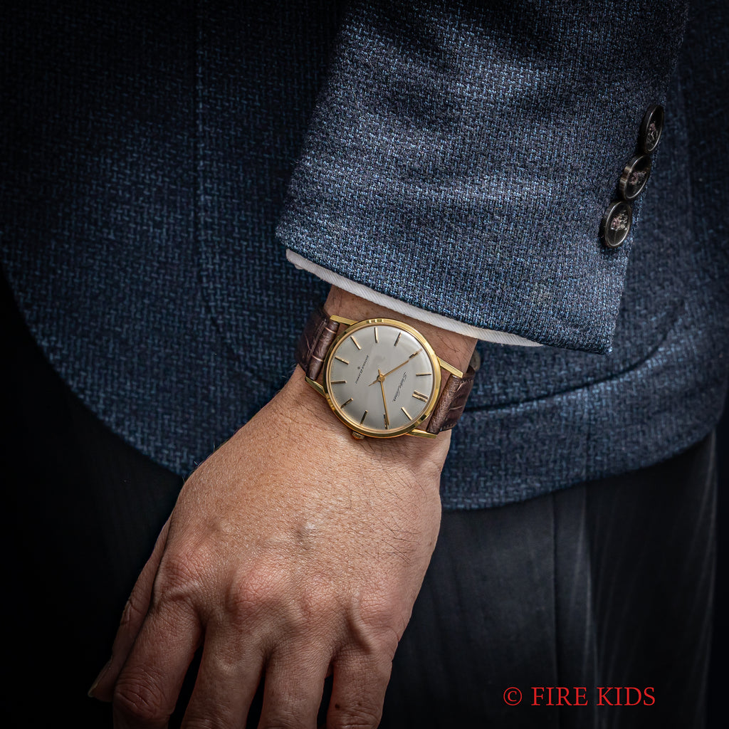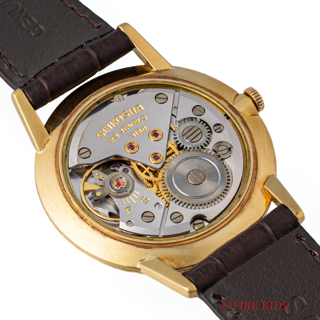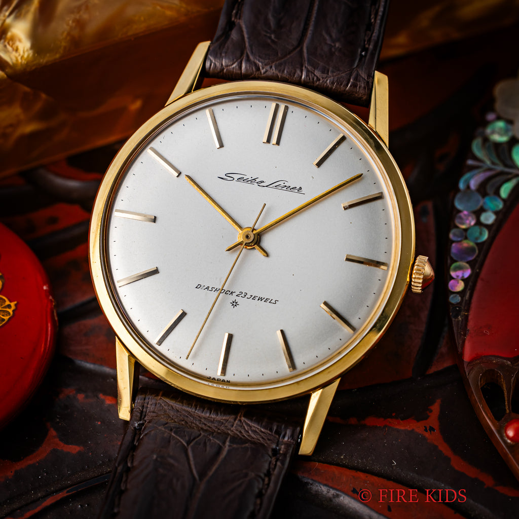 セイコー 18金無垢ライナー 1961年製 Ref.15010LN SDダイヤル 薄型手巻きです。薄型設計の限界に成功した国産高級モデルでセイコーマーベルをベースに薄型化・耐震装置等のアップデートされたモデルです。当時の流行りであった“大きな文字盤の薄型時計の高級機になっており、しかも金無垢ケースは非常に珍しく入荷は稀なためおすすめです。ムーブメントは手巻きのCal.3140を搭載。手巻きや針回しの操作はスムースです。革ベルトはファイアーキッズオリジナル、クロコダイル革ベルトを合わせています。